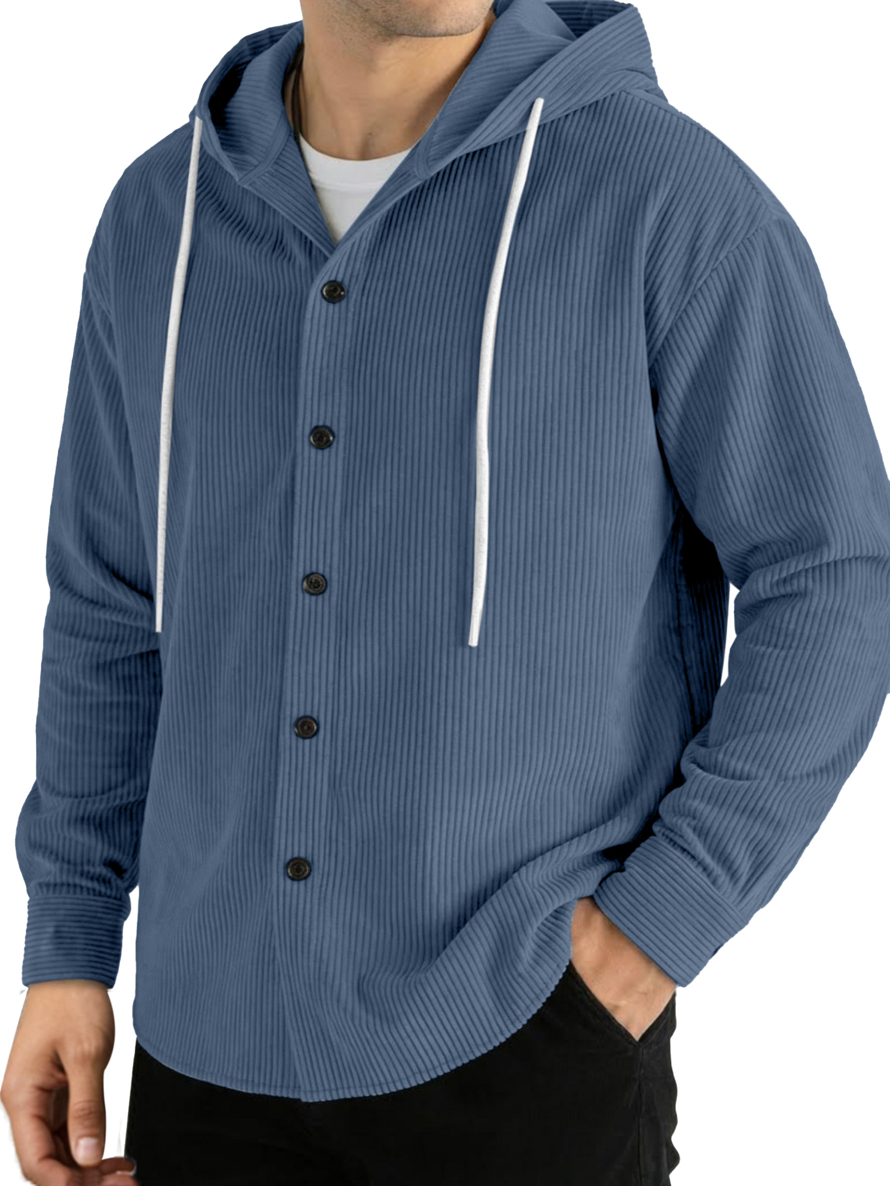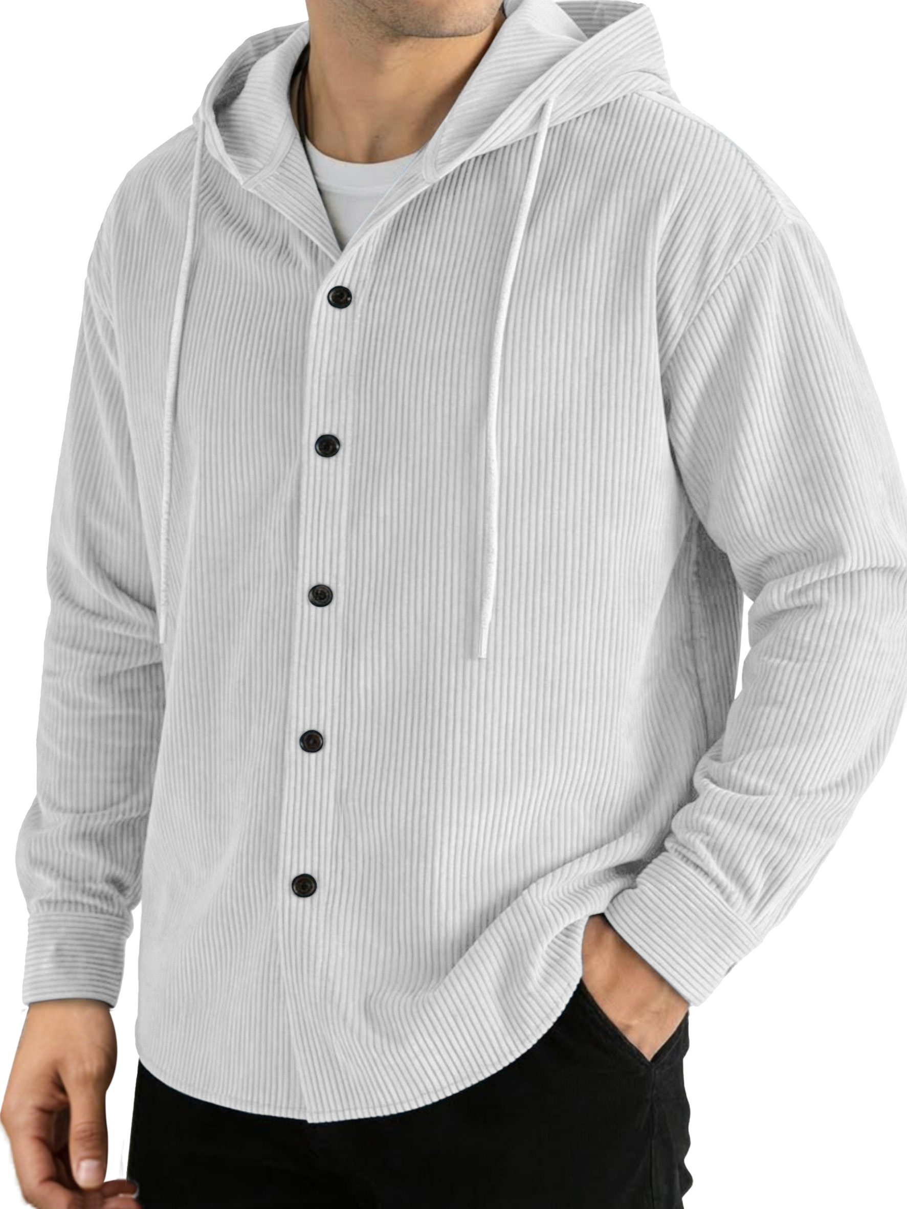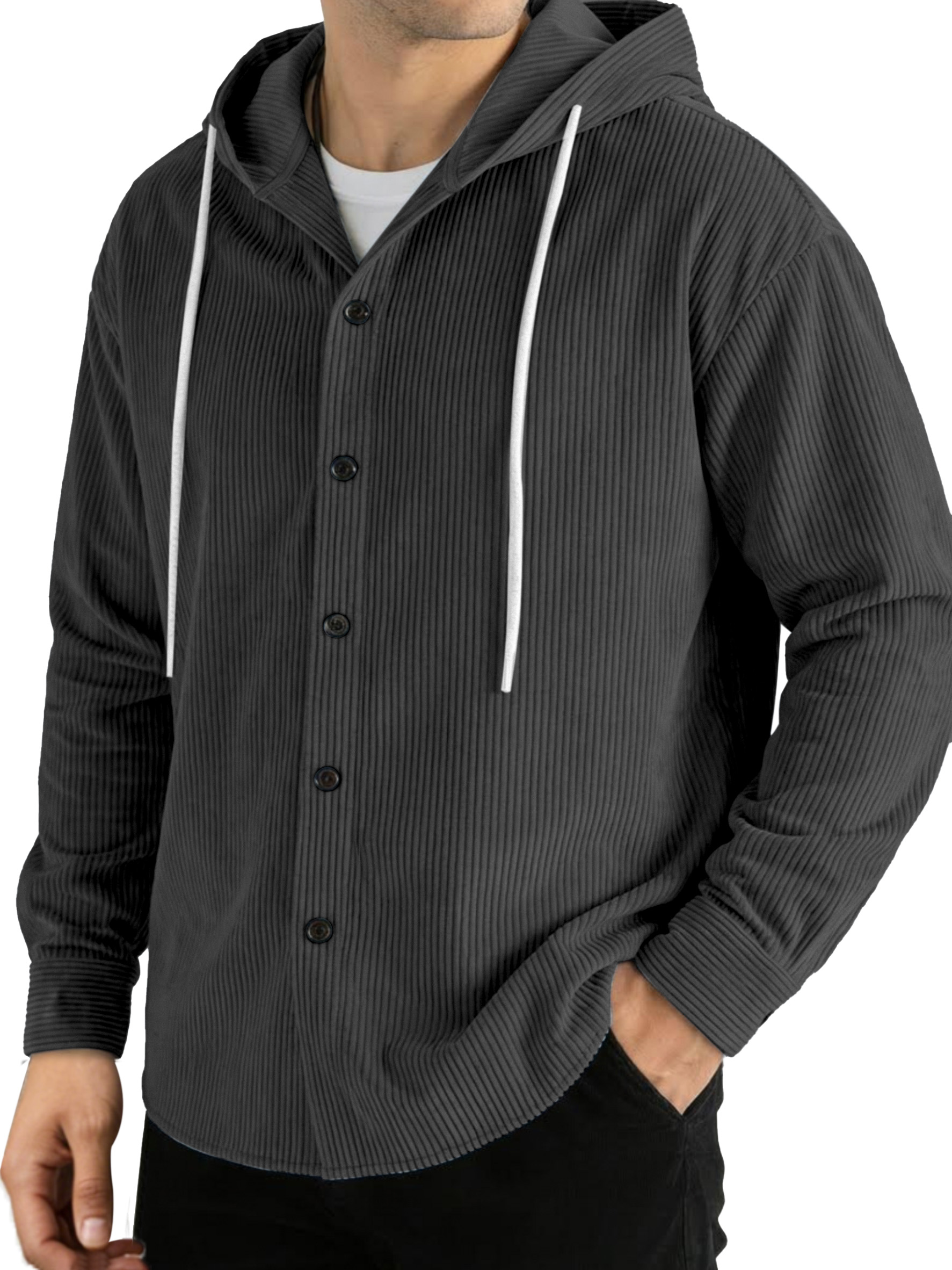 Casual Solid Color Vertical Ribbed Button-Up Hooded Long-Sleeve Shirt