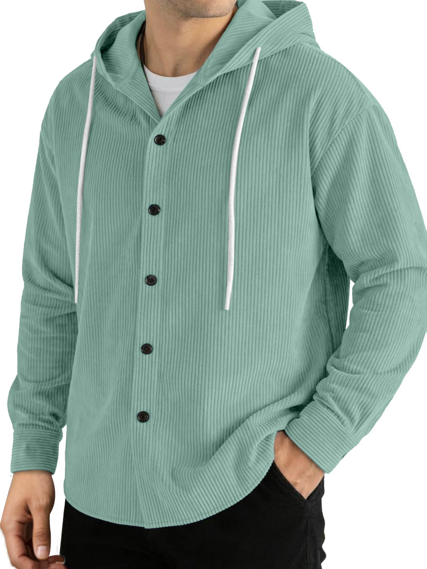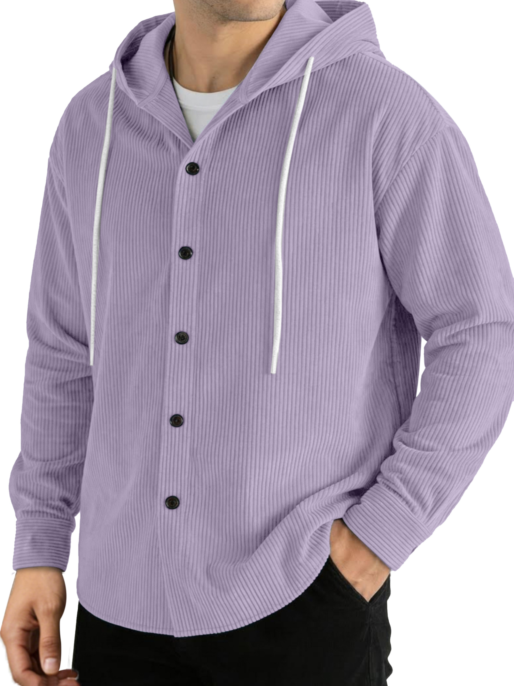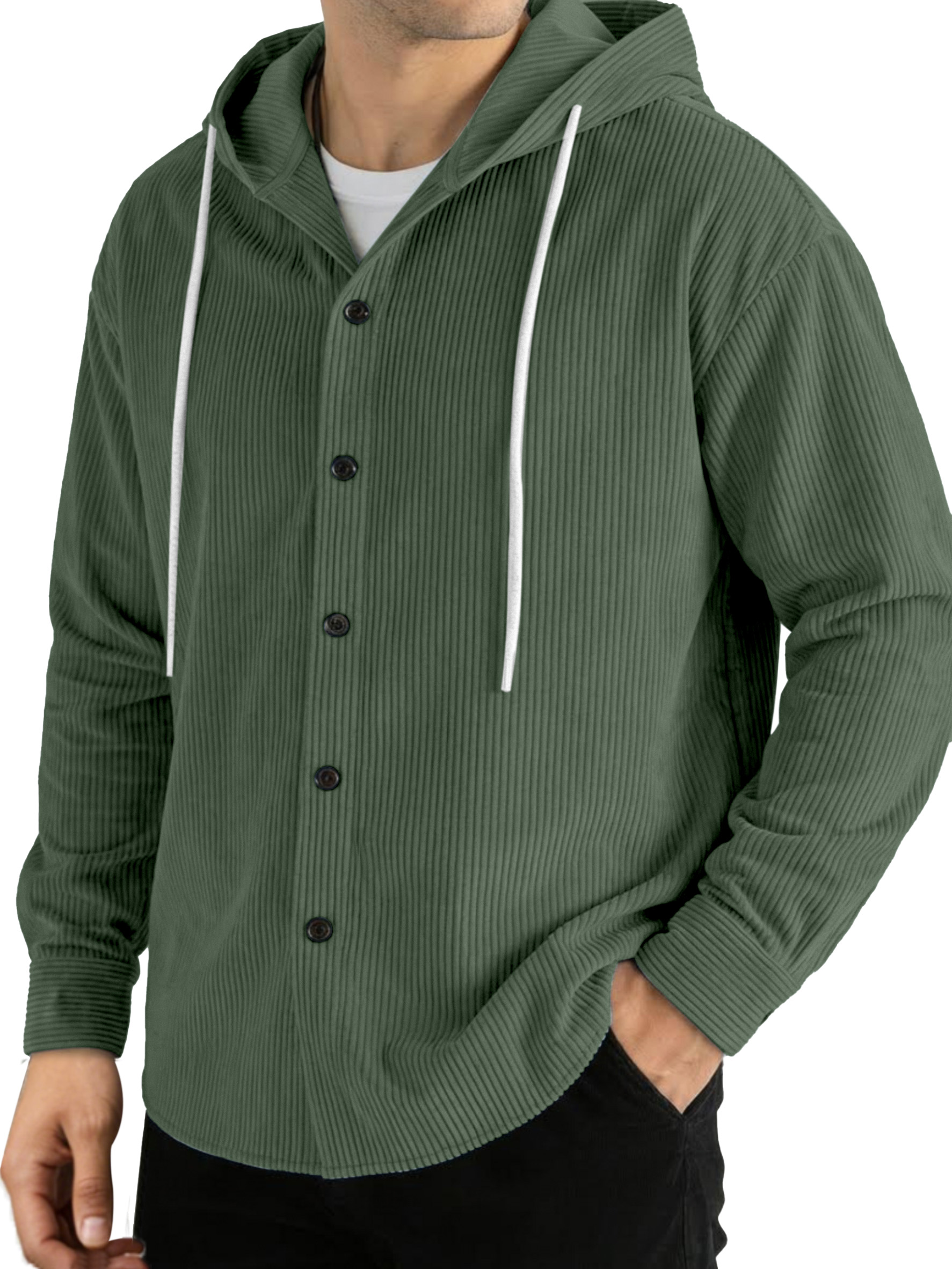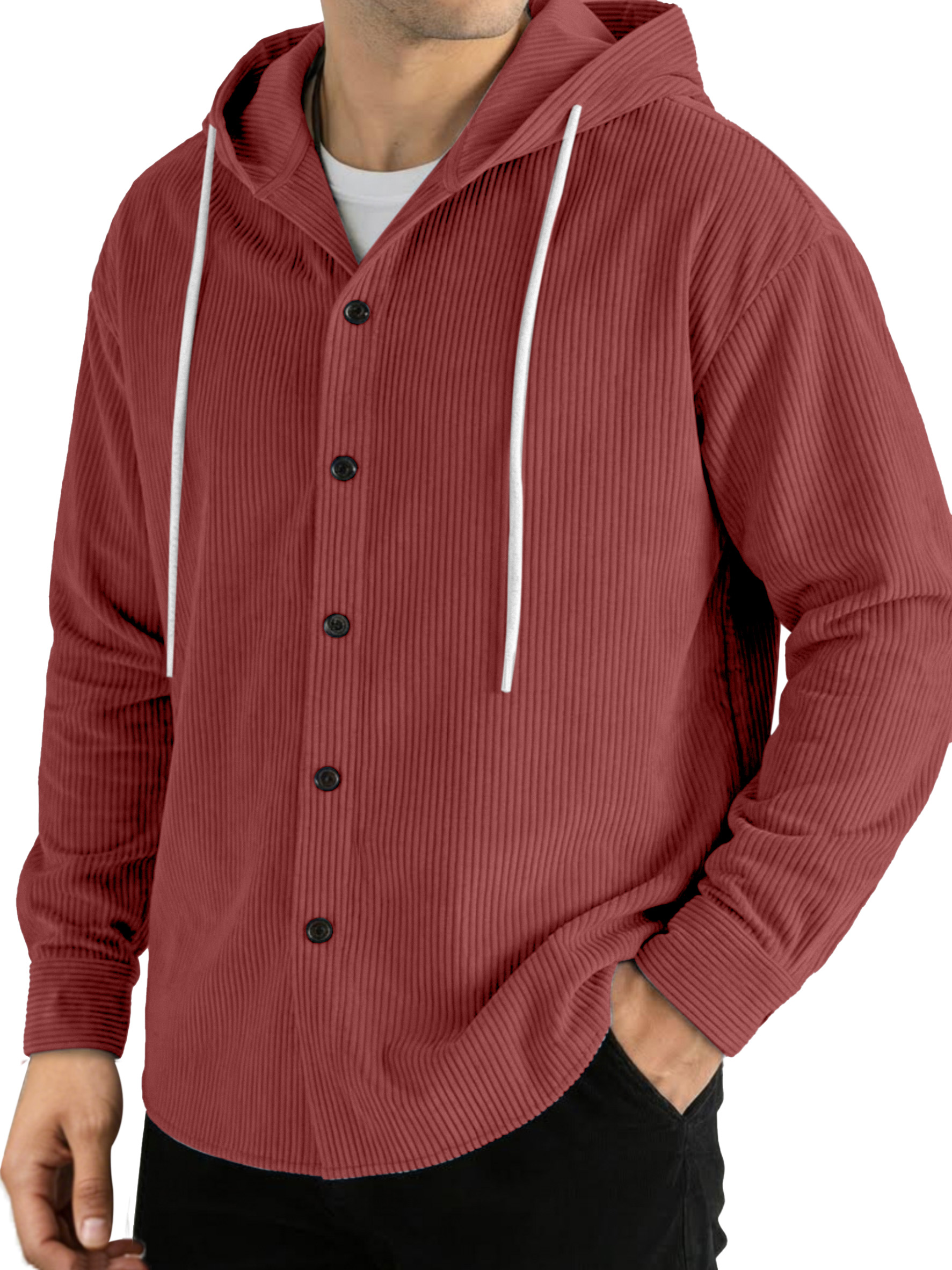 Casual Solid Color Vertical Ribbed Button-Up Hooded Long-Sleeve Shirt