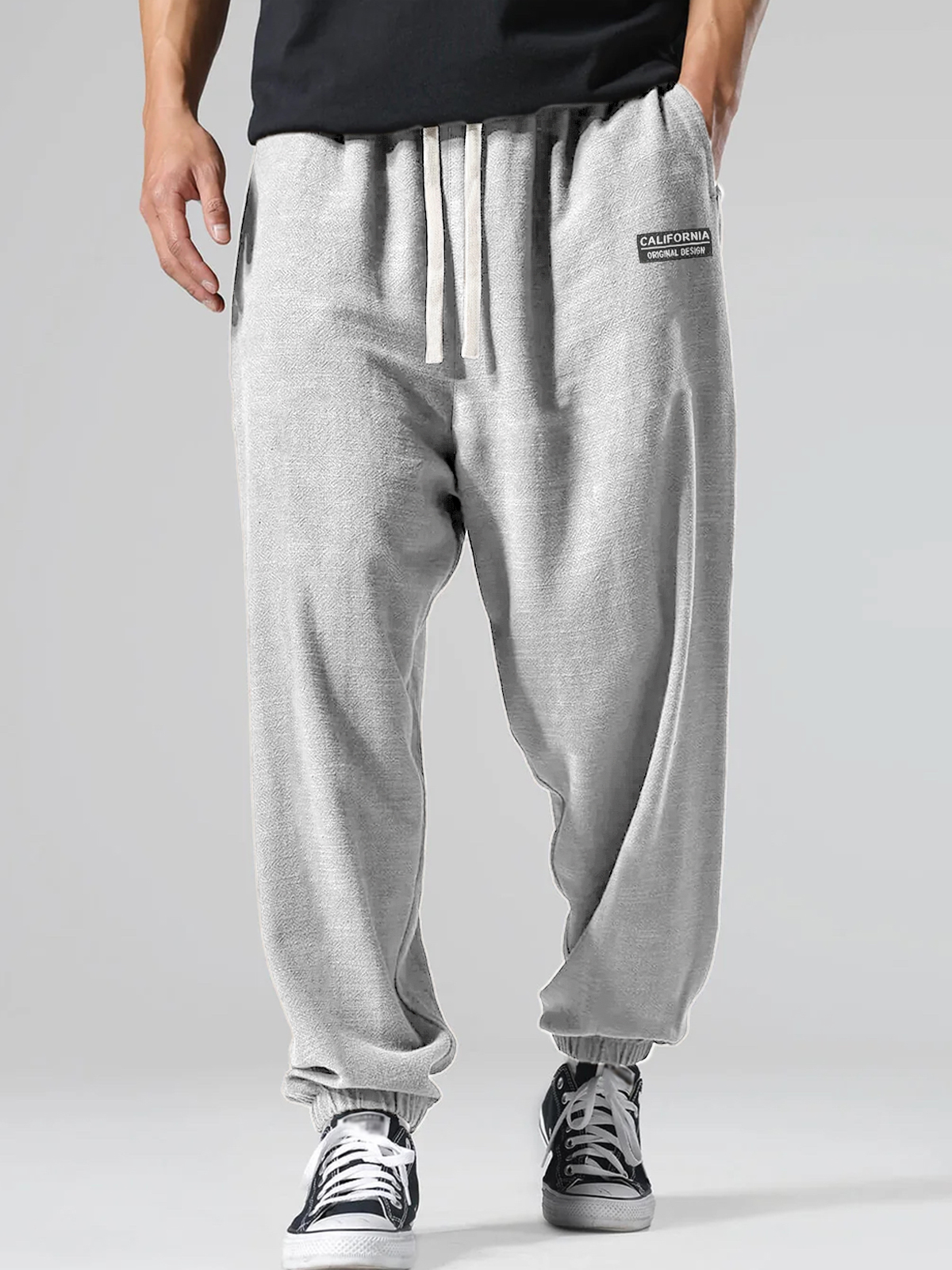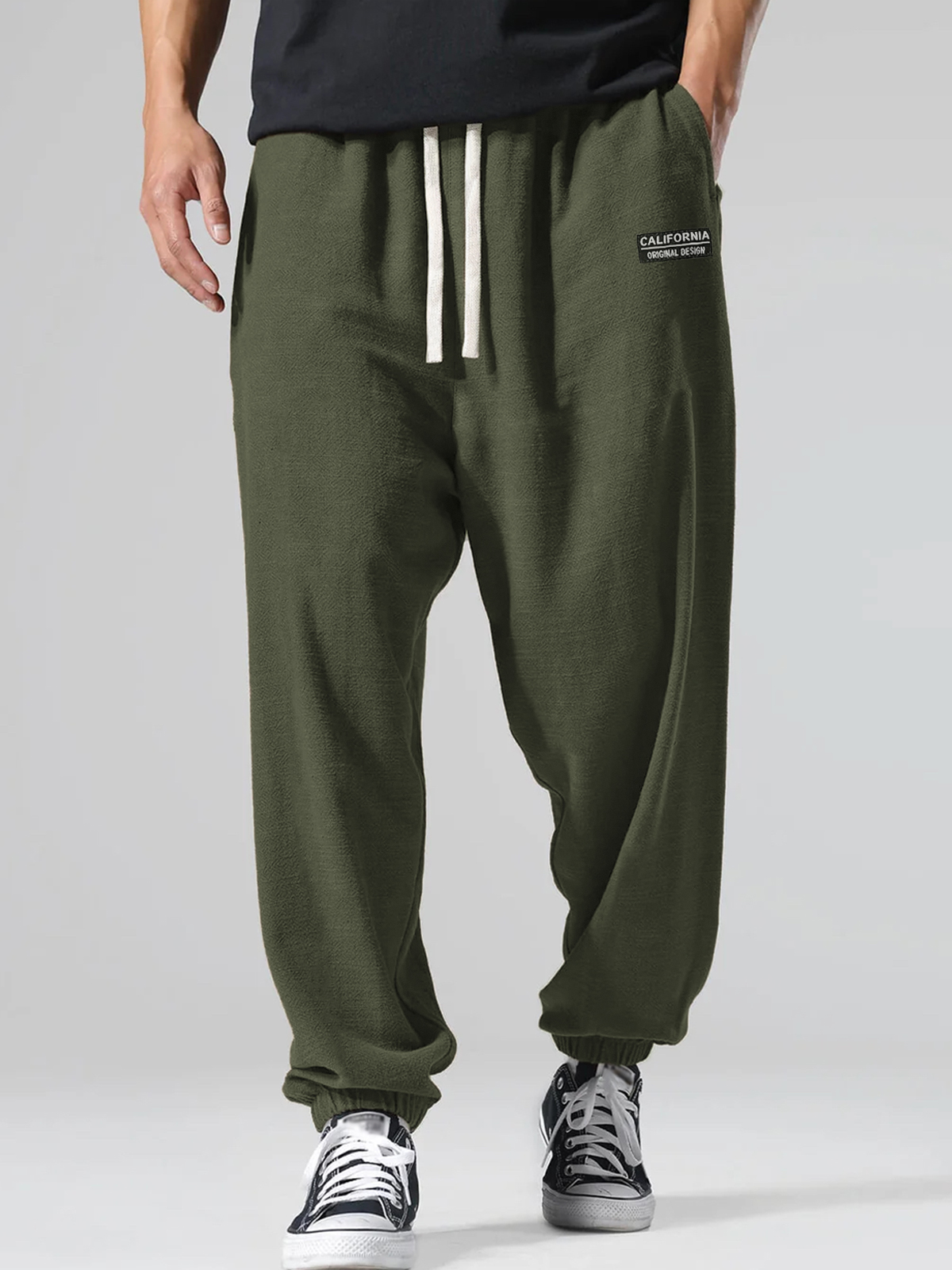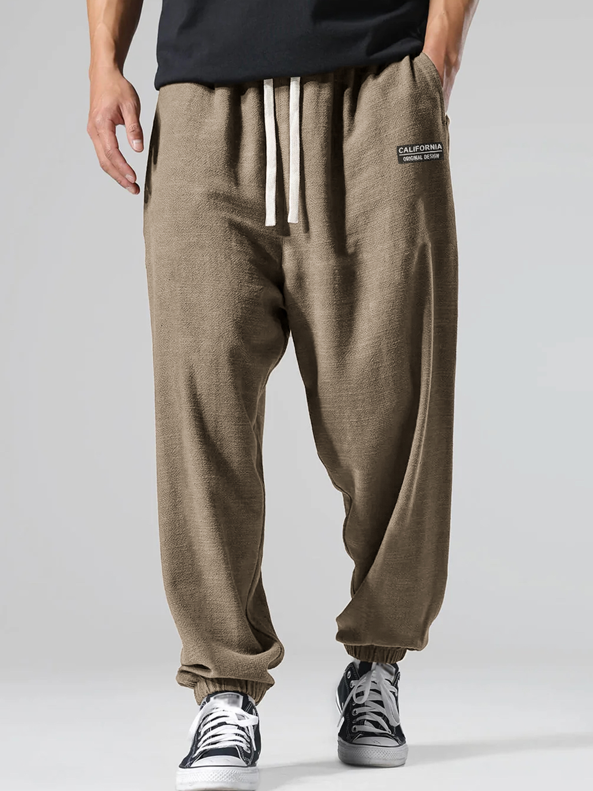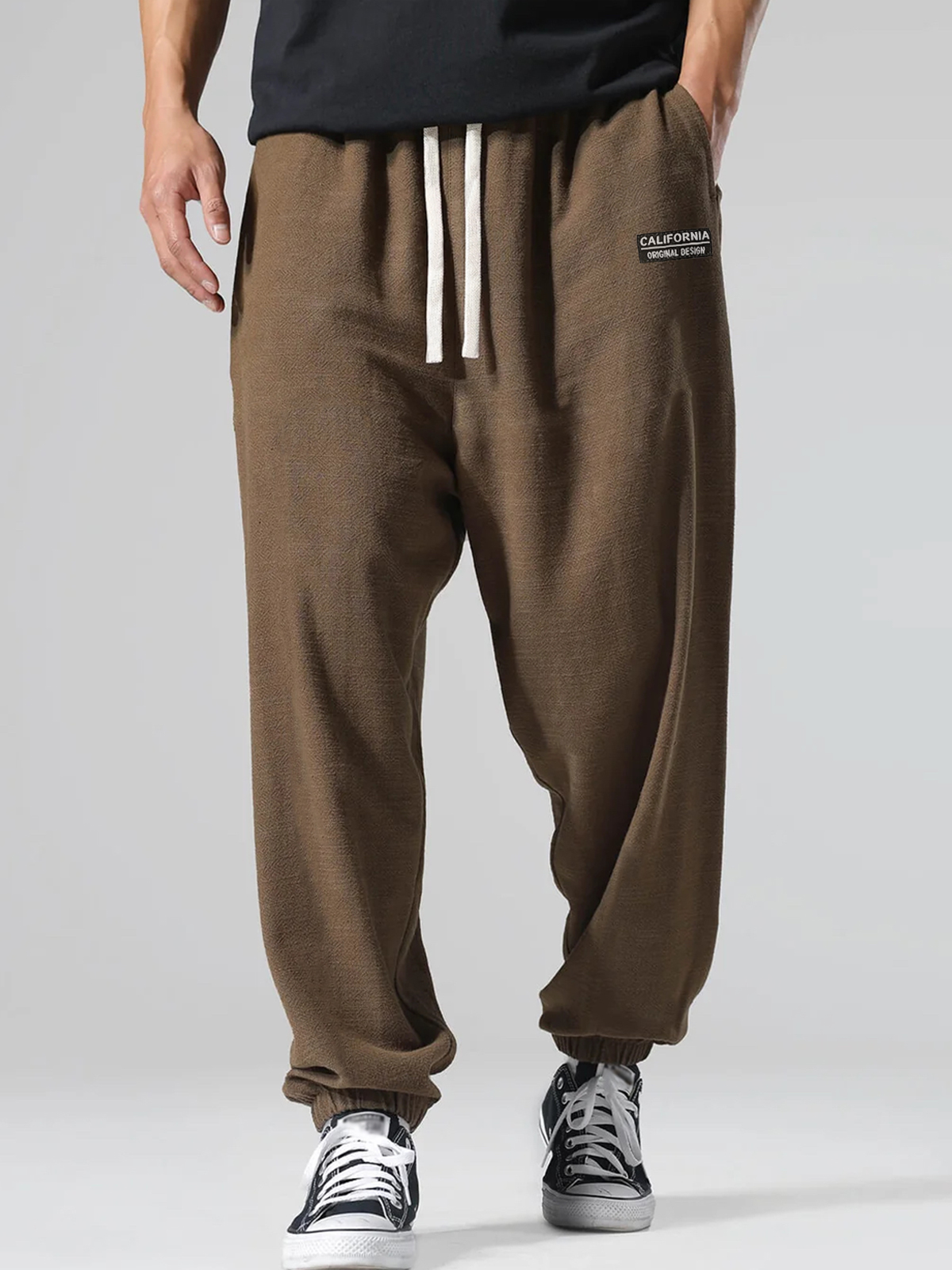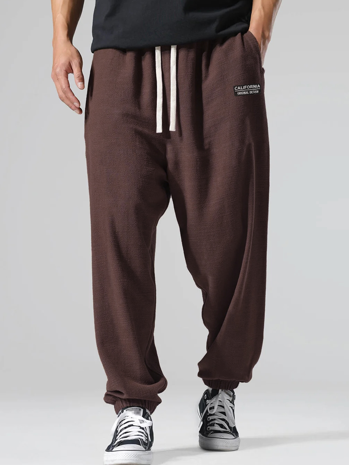 Men's Breathable Slub Linen Casual Daily Stretch Drawstring Trousers with Embroidered Label