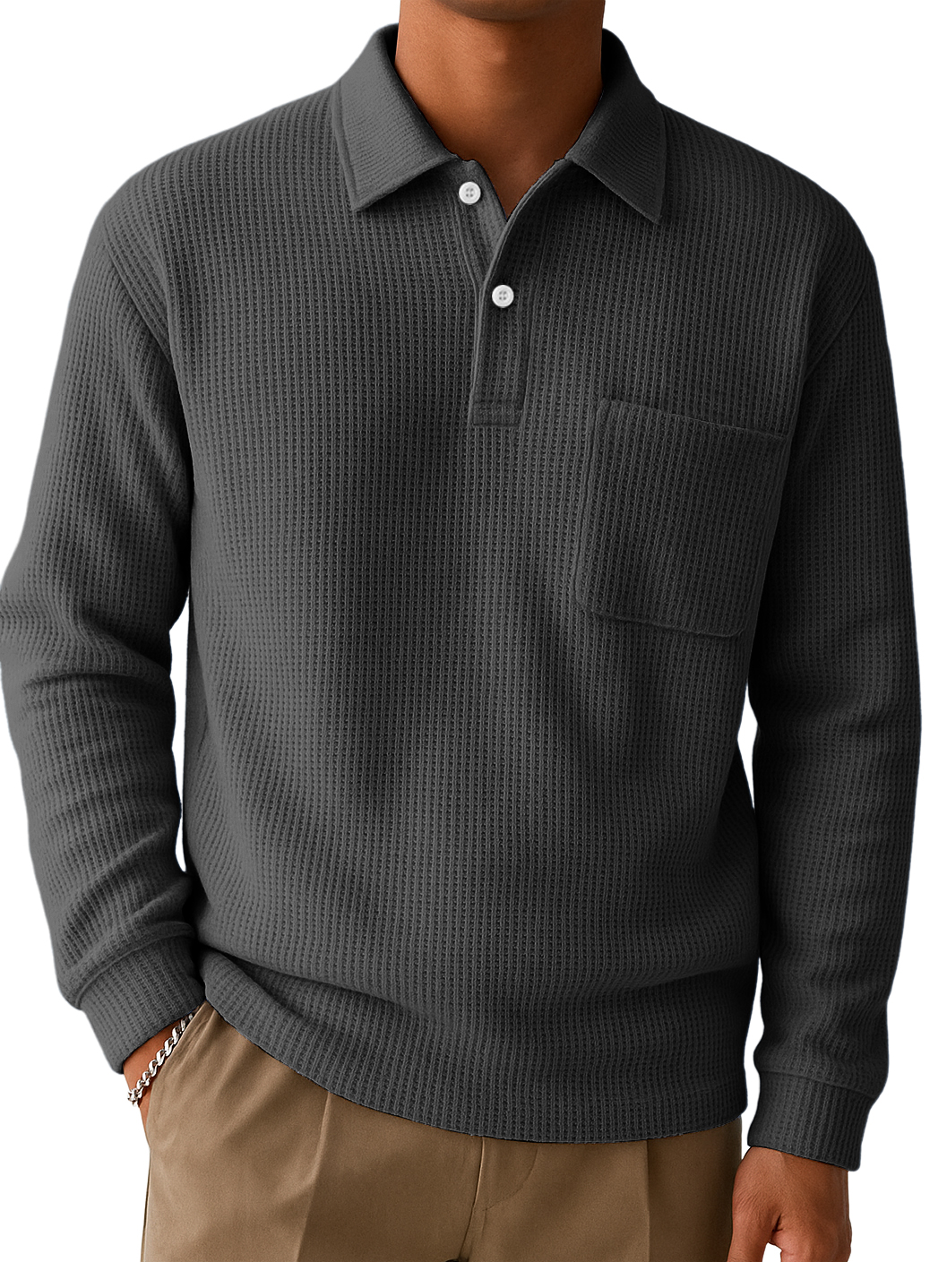 Men's Casual Comfortable Waffle Pocket Long-sleeved Polo Shirt