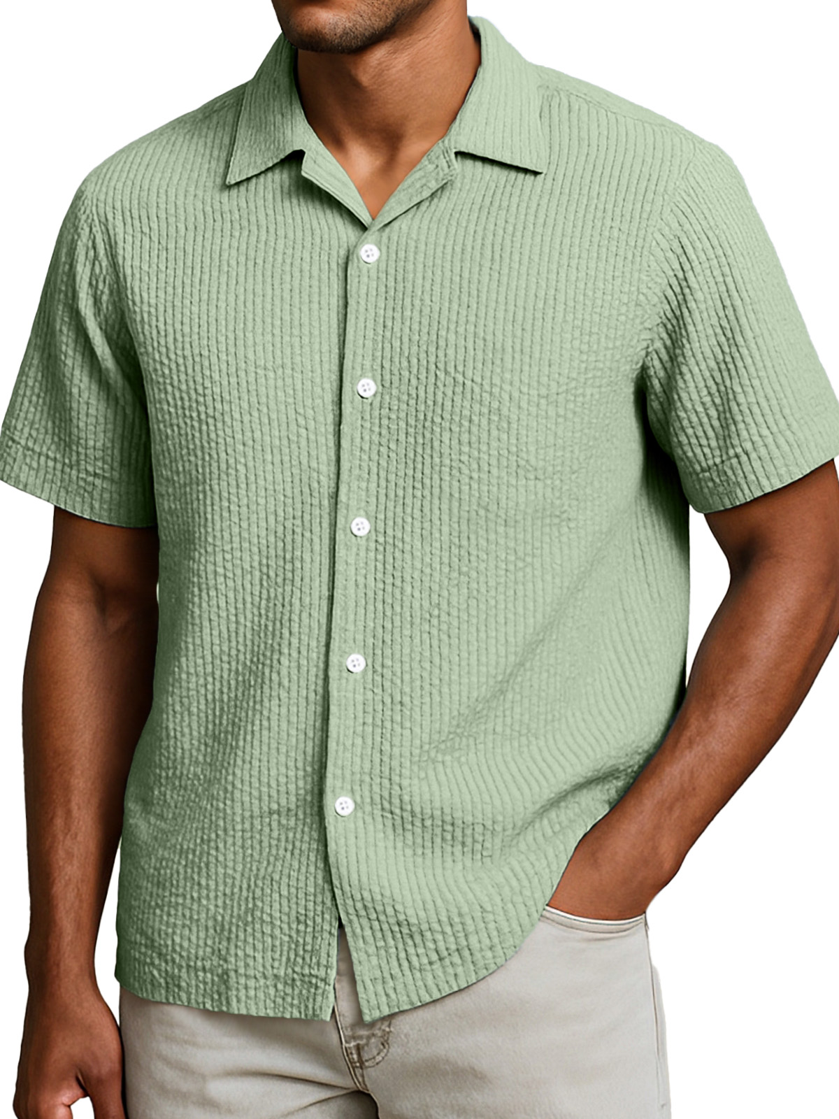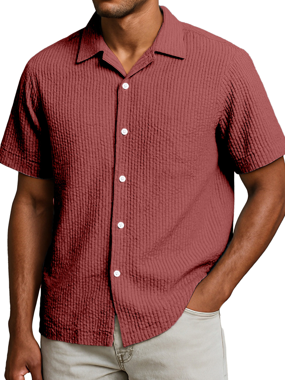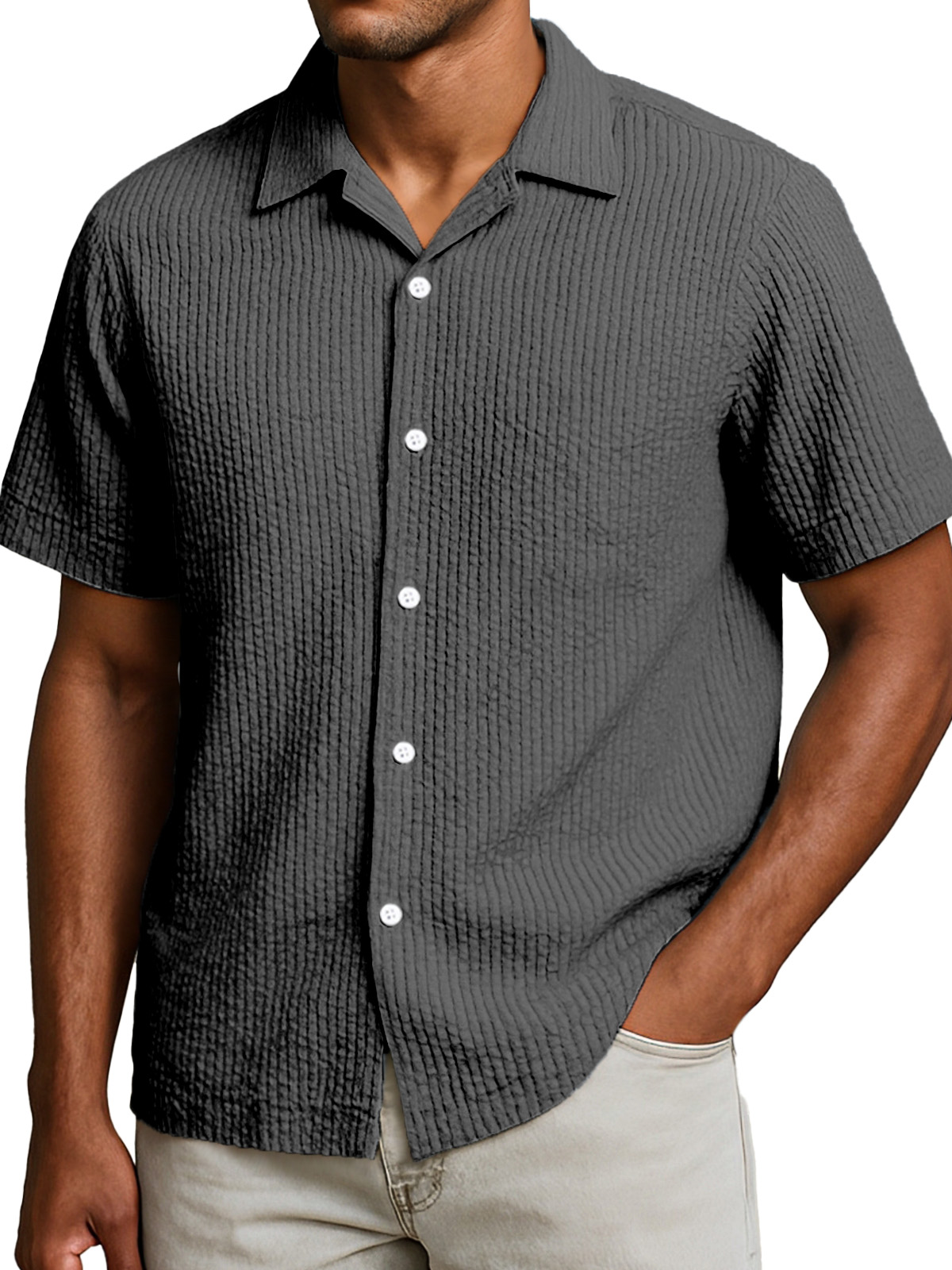Men's Casual Solid Color Breathable Seersucker Button Short Sleeve Shirt