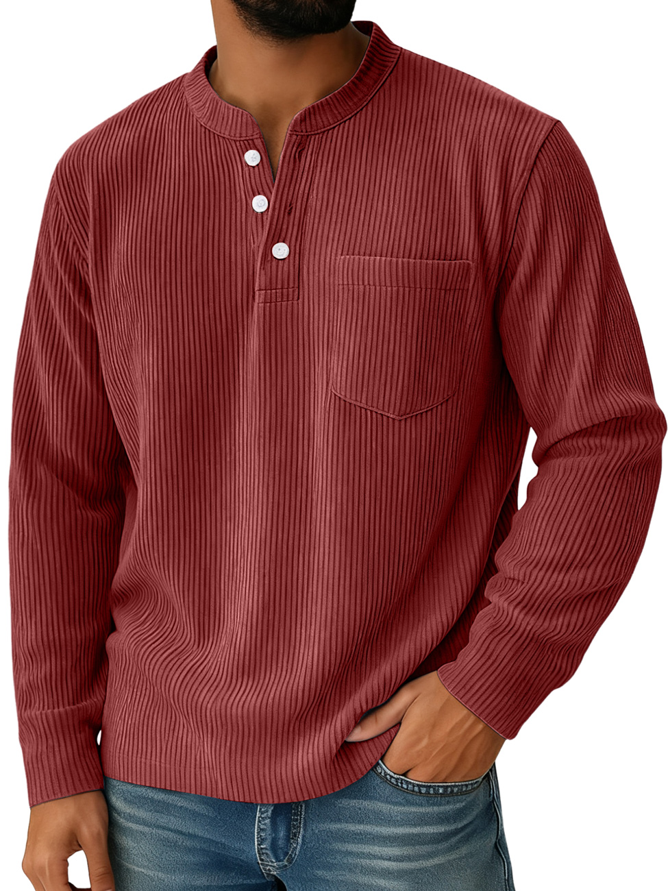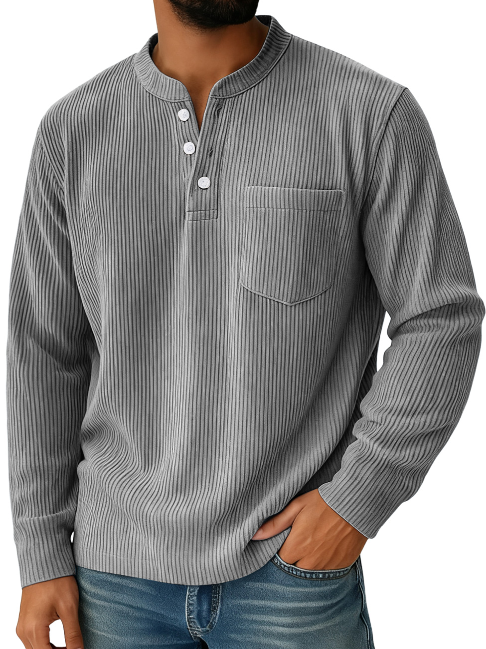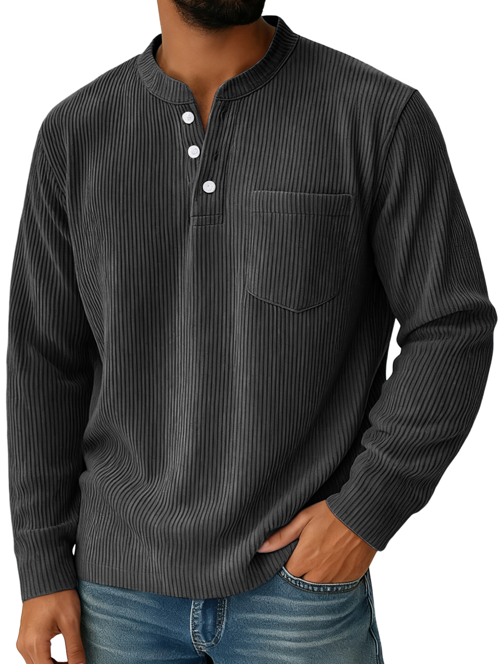 Men's Casual Solid Color Henley Shirt With Stand-up Collar And Pockets