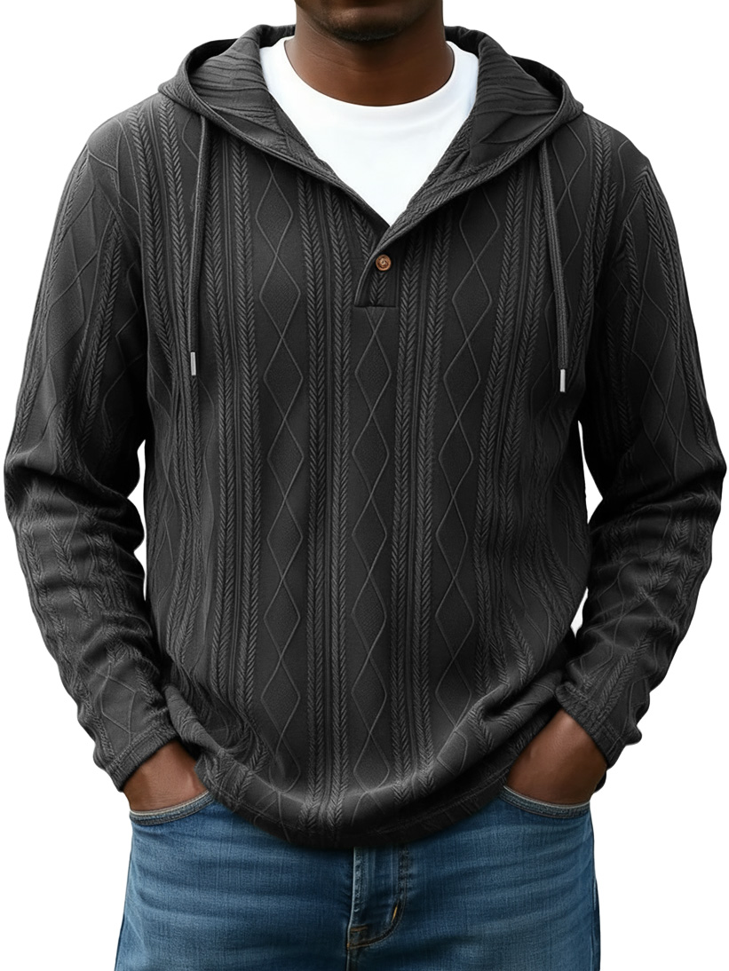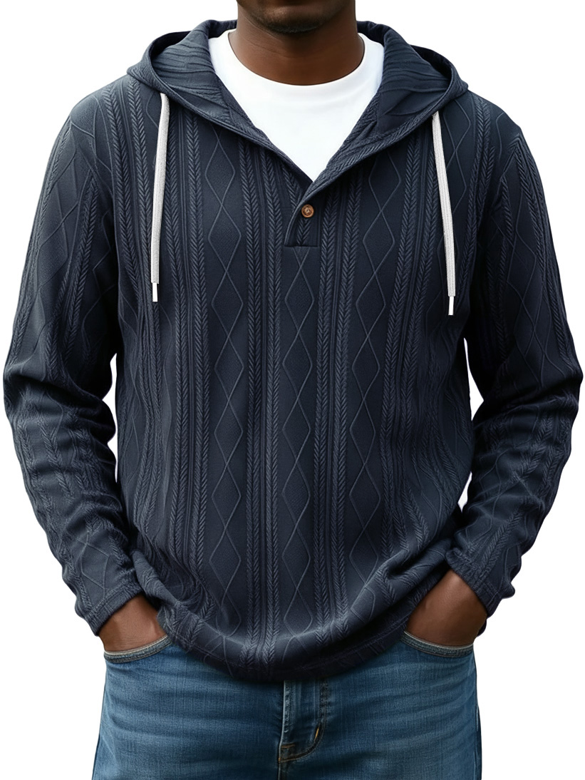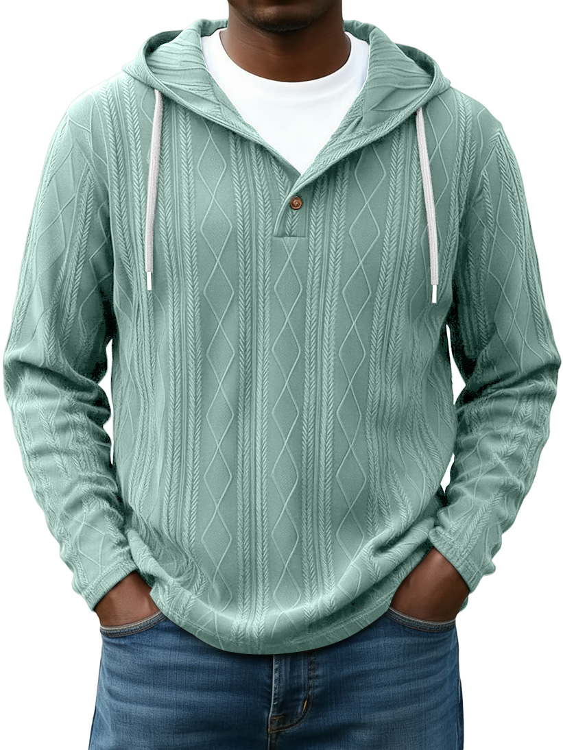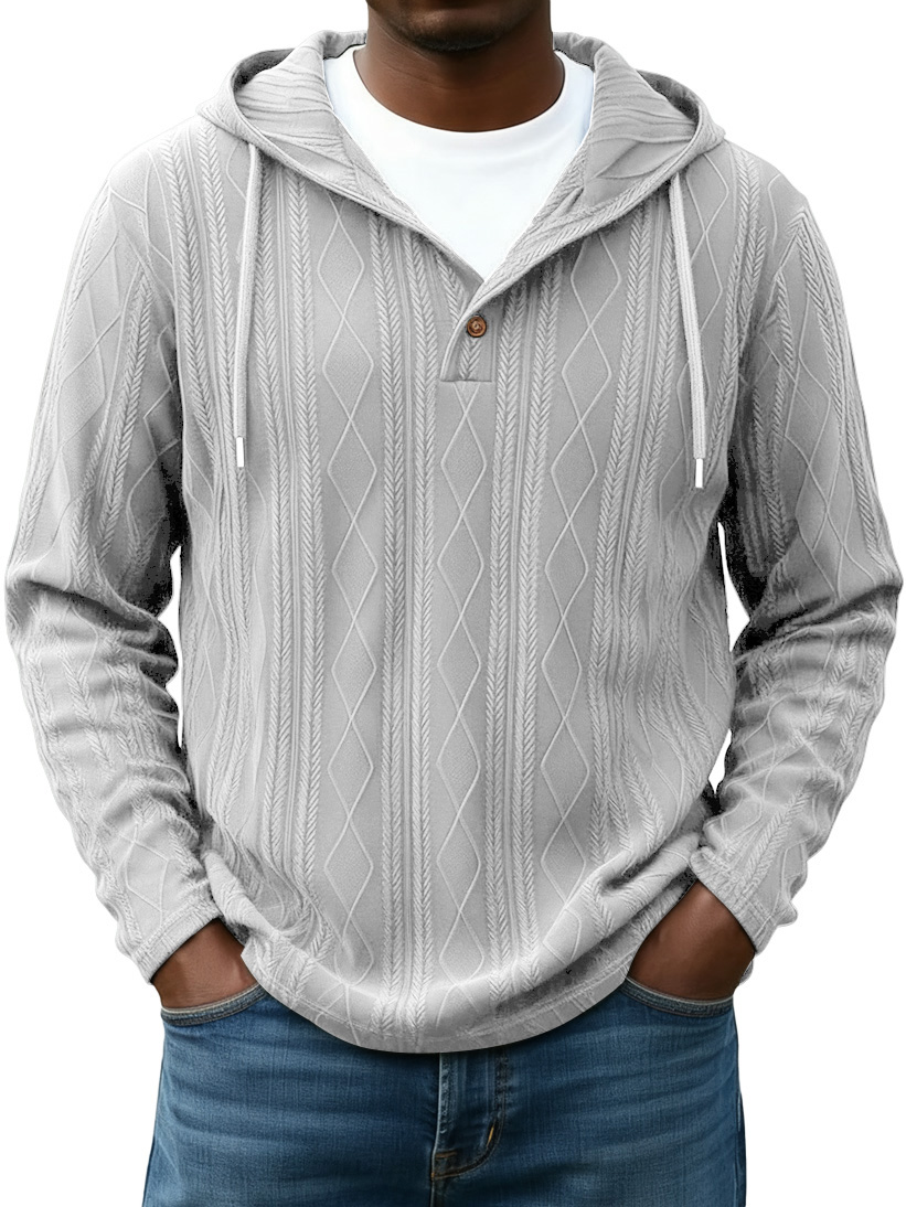 Men's Casual Solid Color Striped Diamond Jacquard Button Hooded Sweatshirt