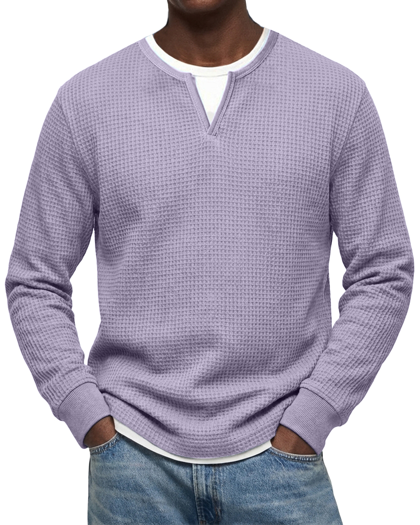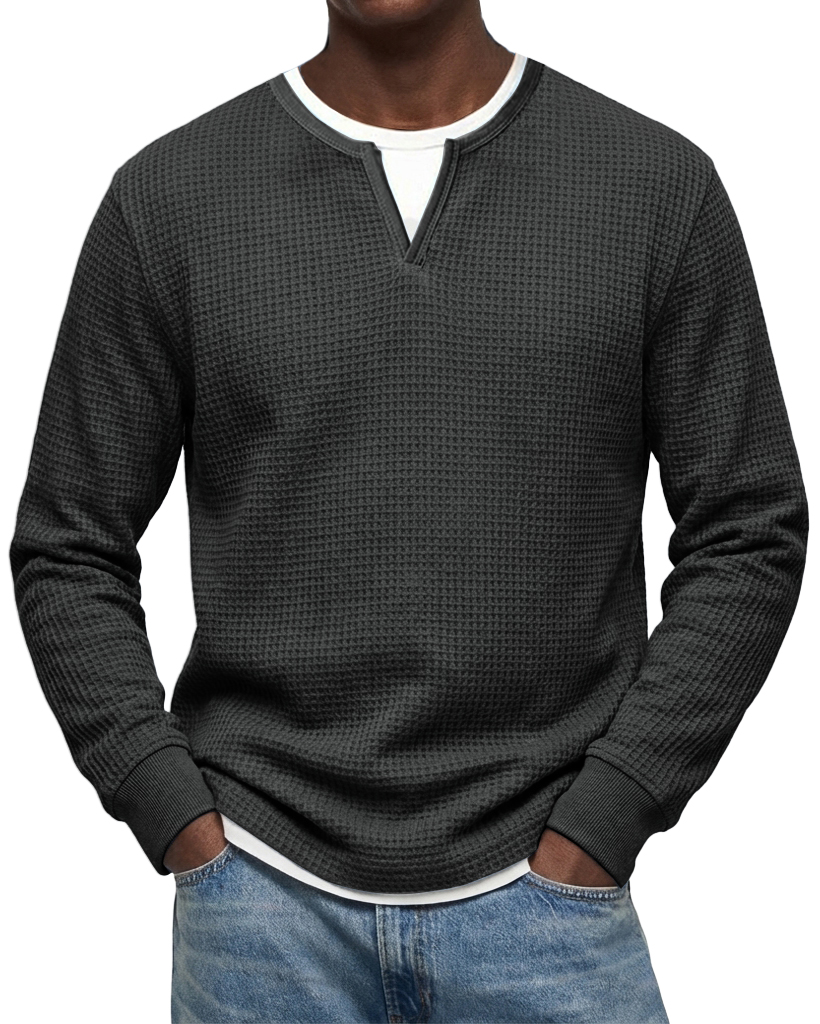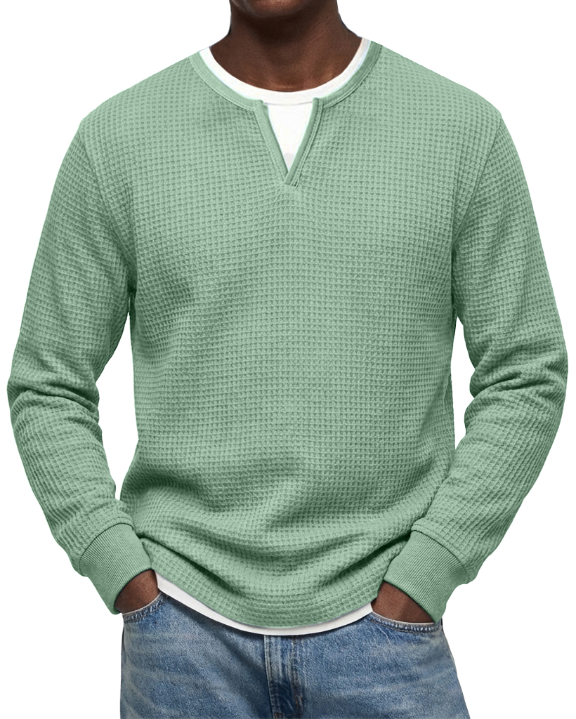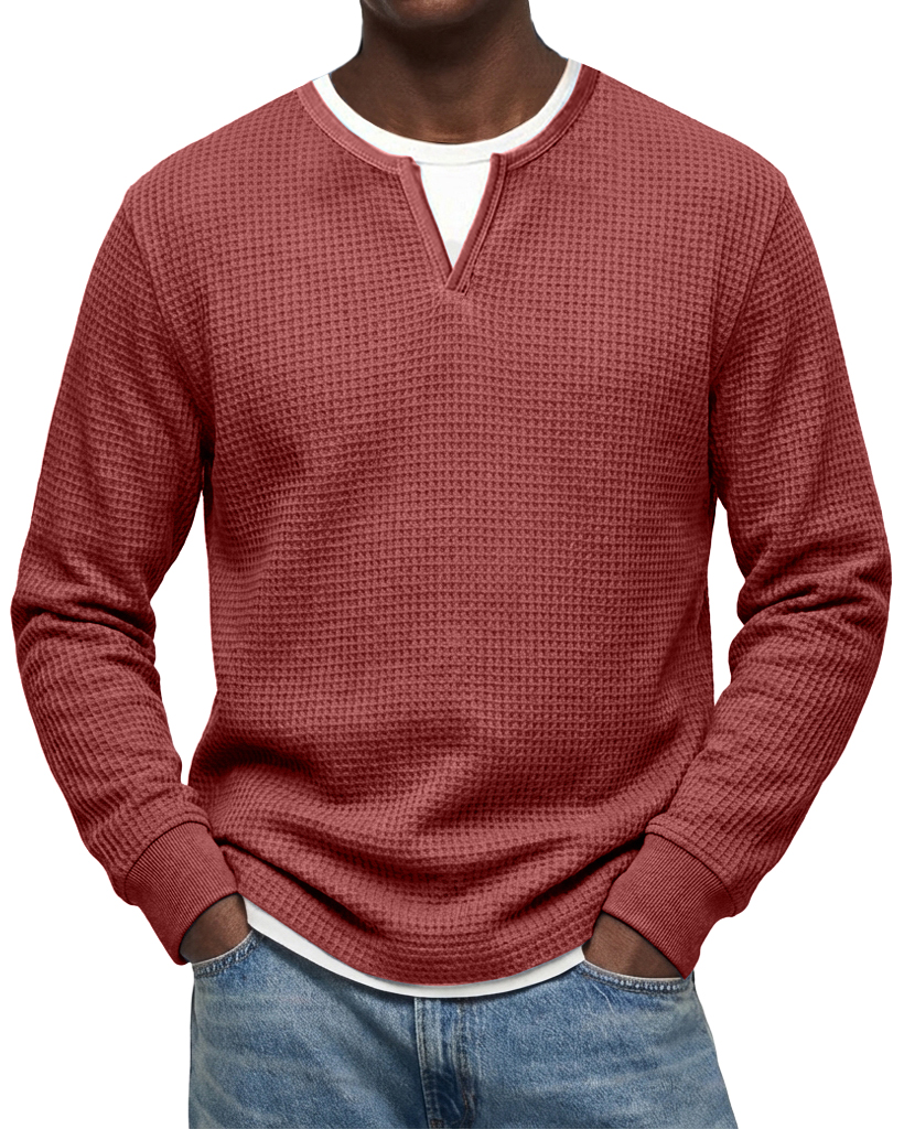 Men's Casual Urban V-neck Faux Two-Piece Waffle Knit Crew Neck Long-Sleeve T-Shirt