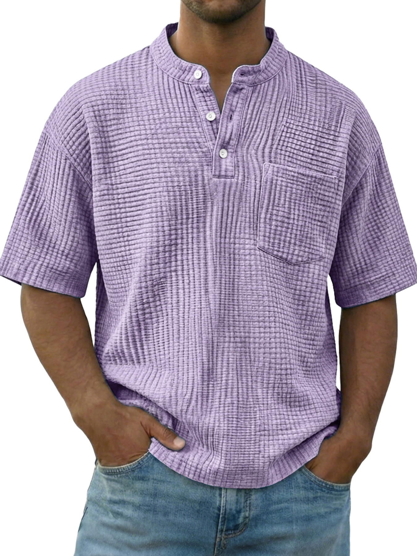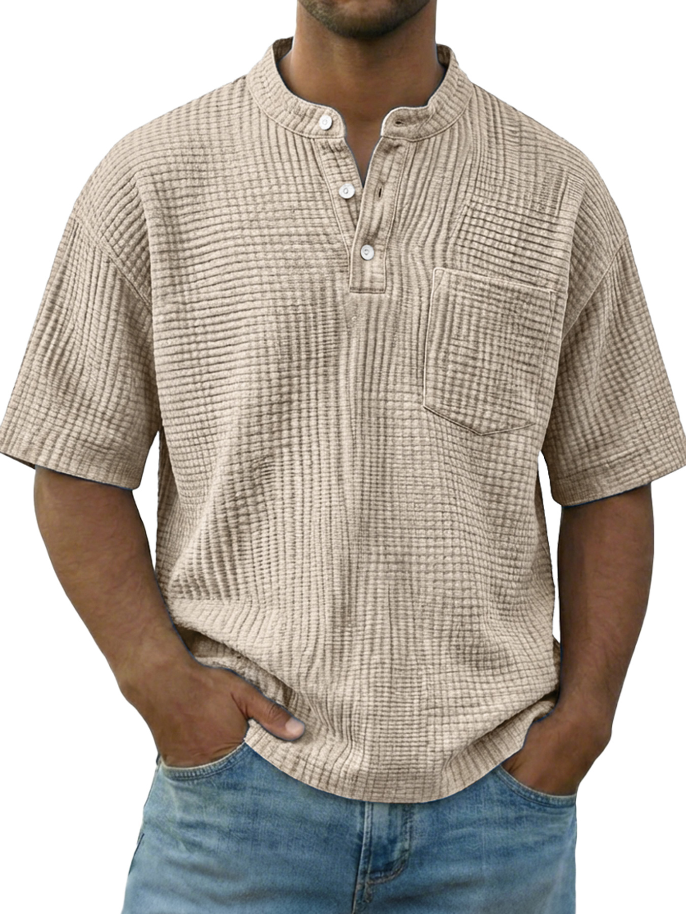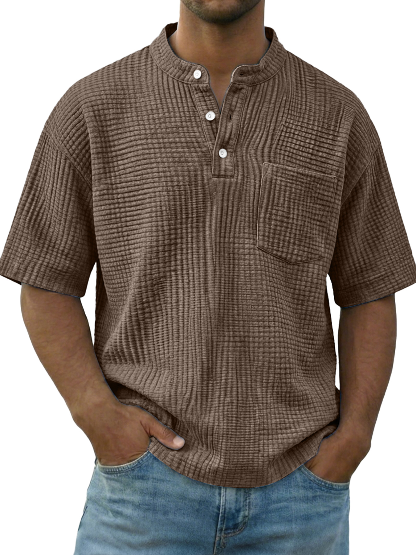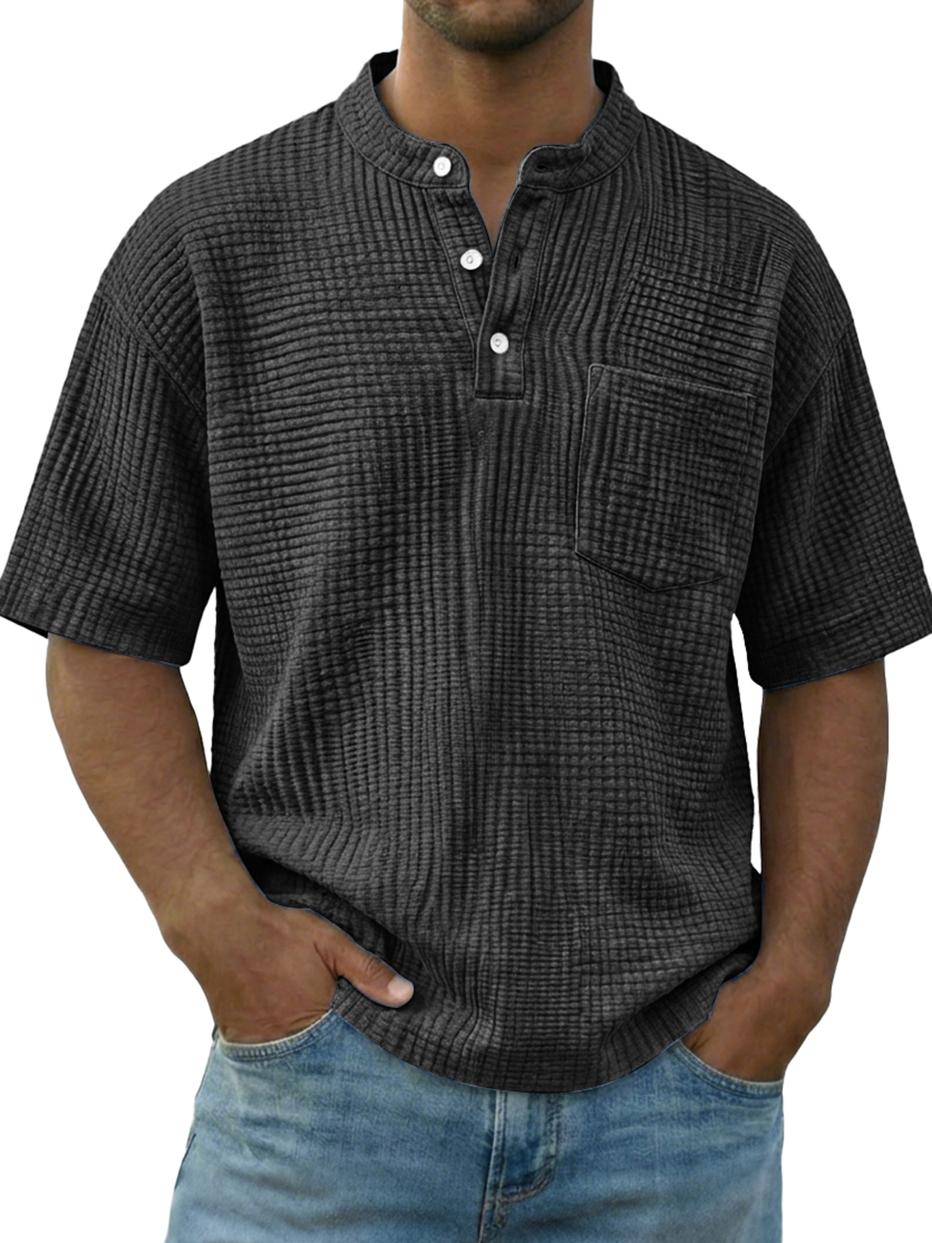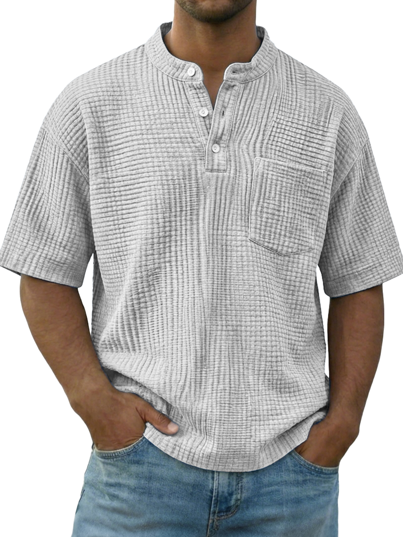 Men's Casual Wrinkled Comfortable Short-sleeved Henley Shirt With Pockets