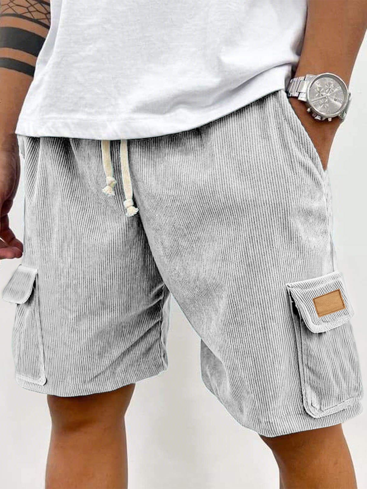 Men's Corduroy Multi-pocket Embroidered Label Loose Lace-up Shorts