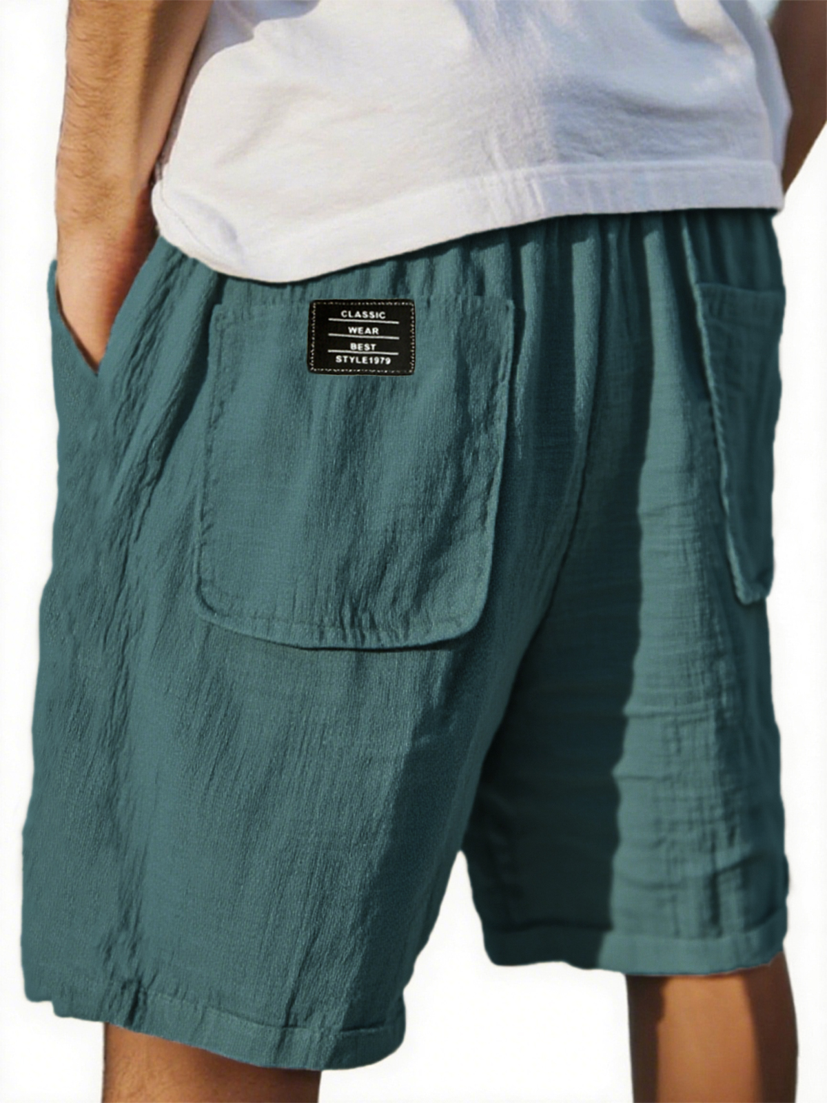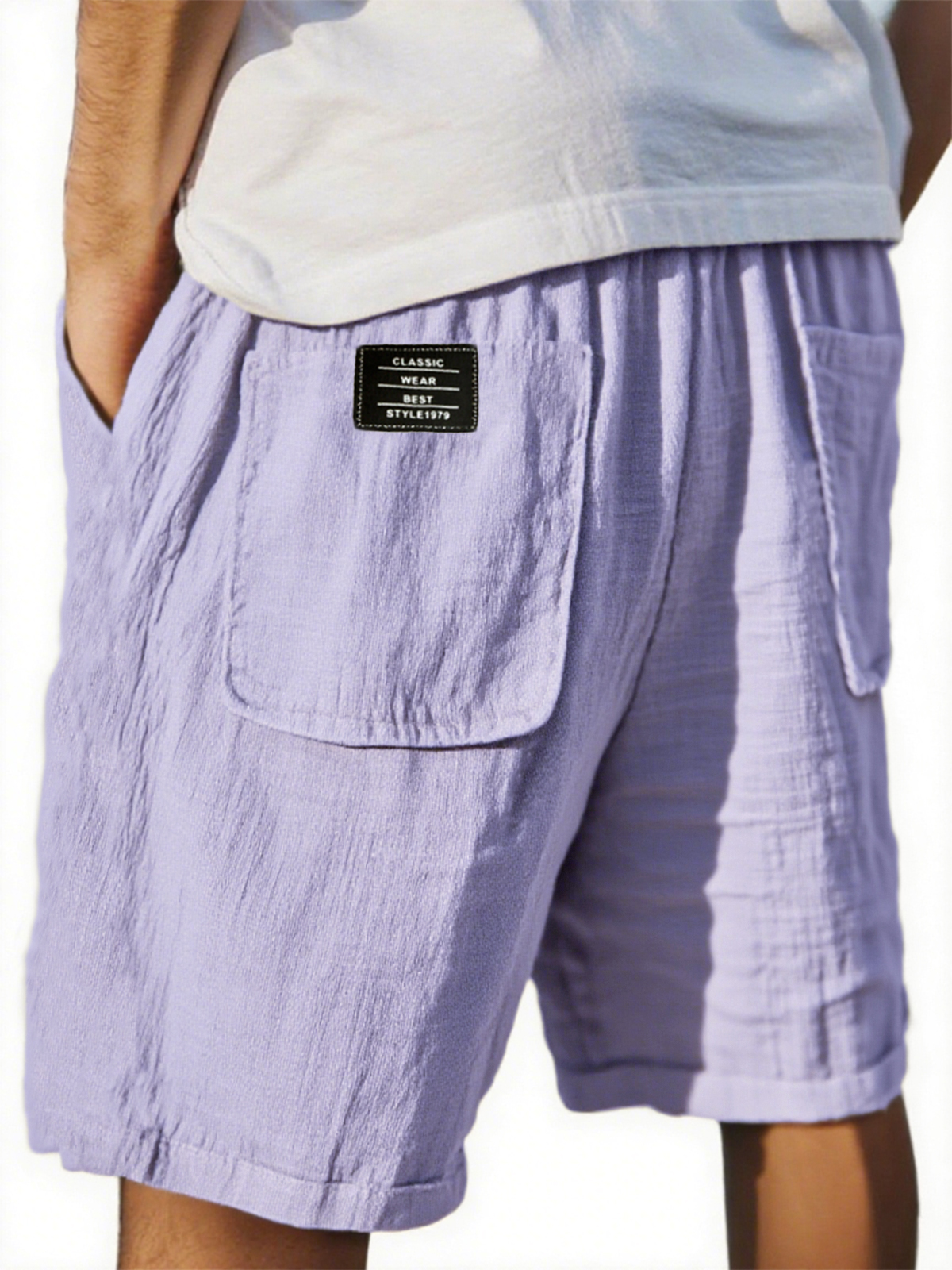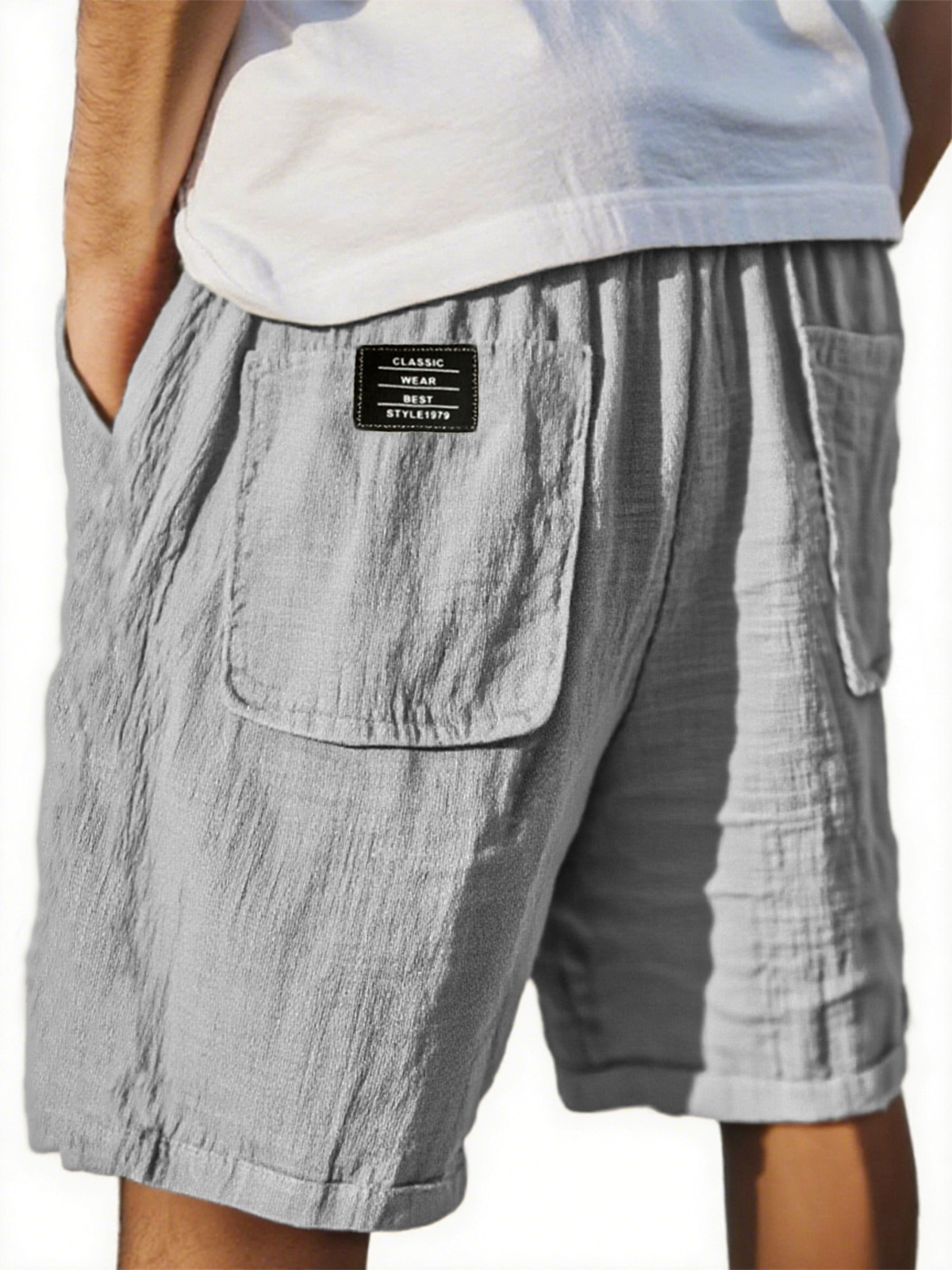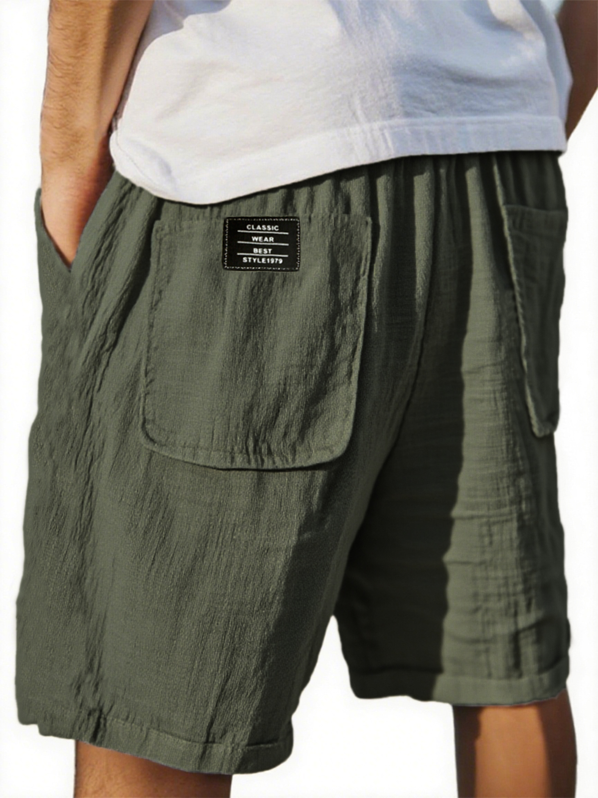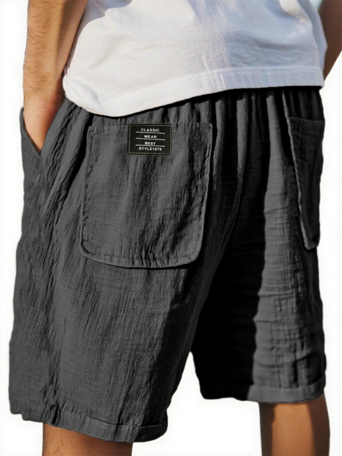 Men's Crinkled Linen Multi-Pocket Embroidered Label Comfort Shorts