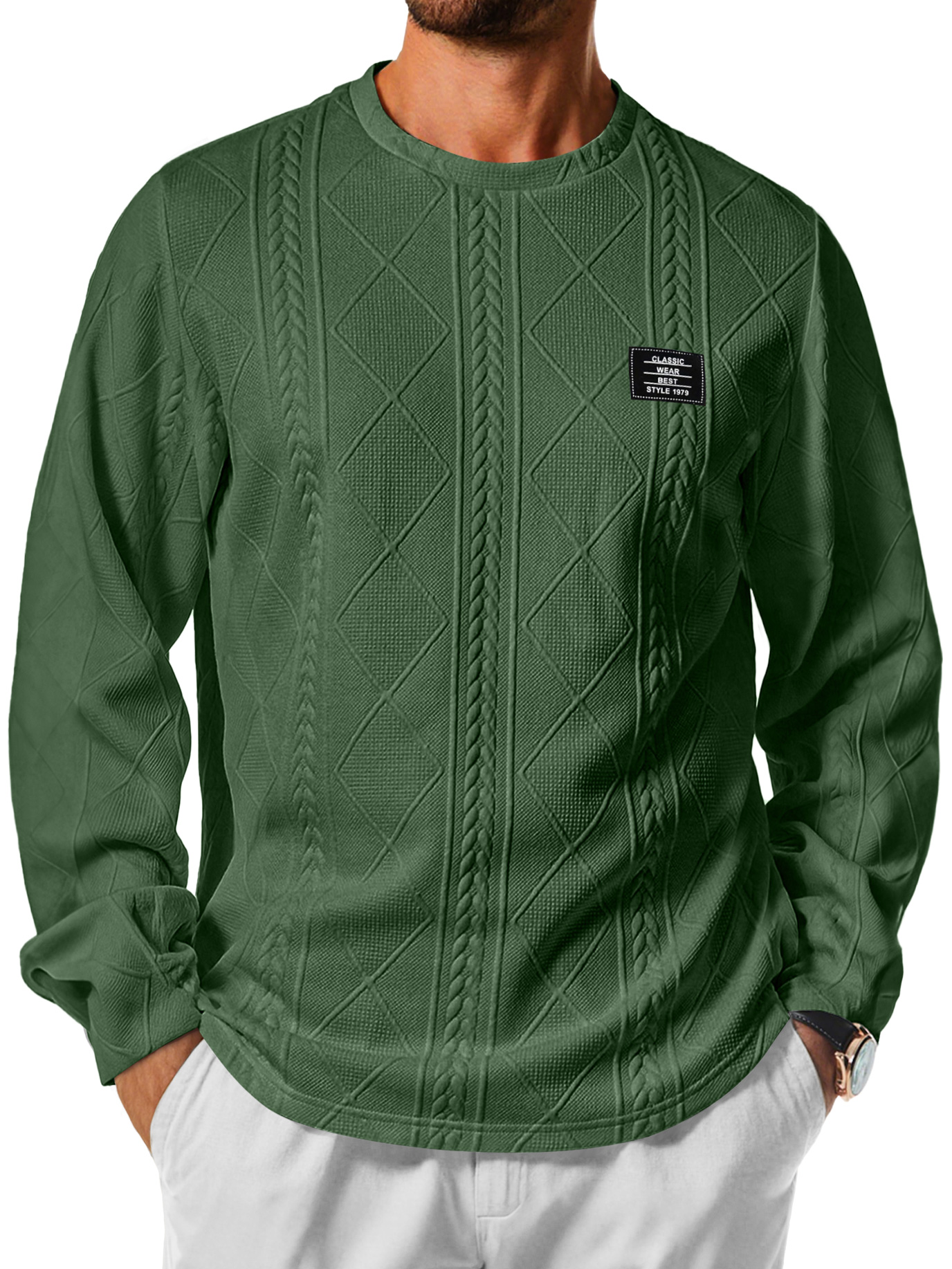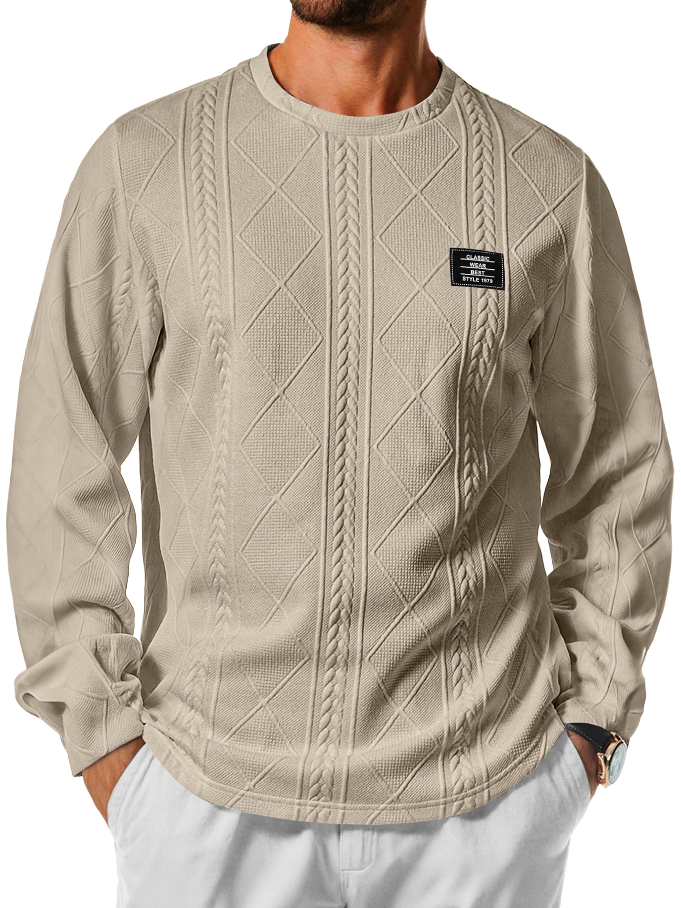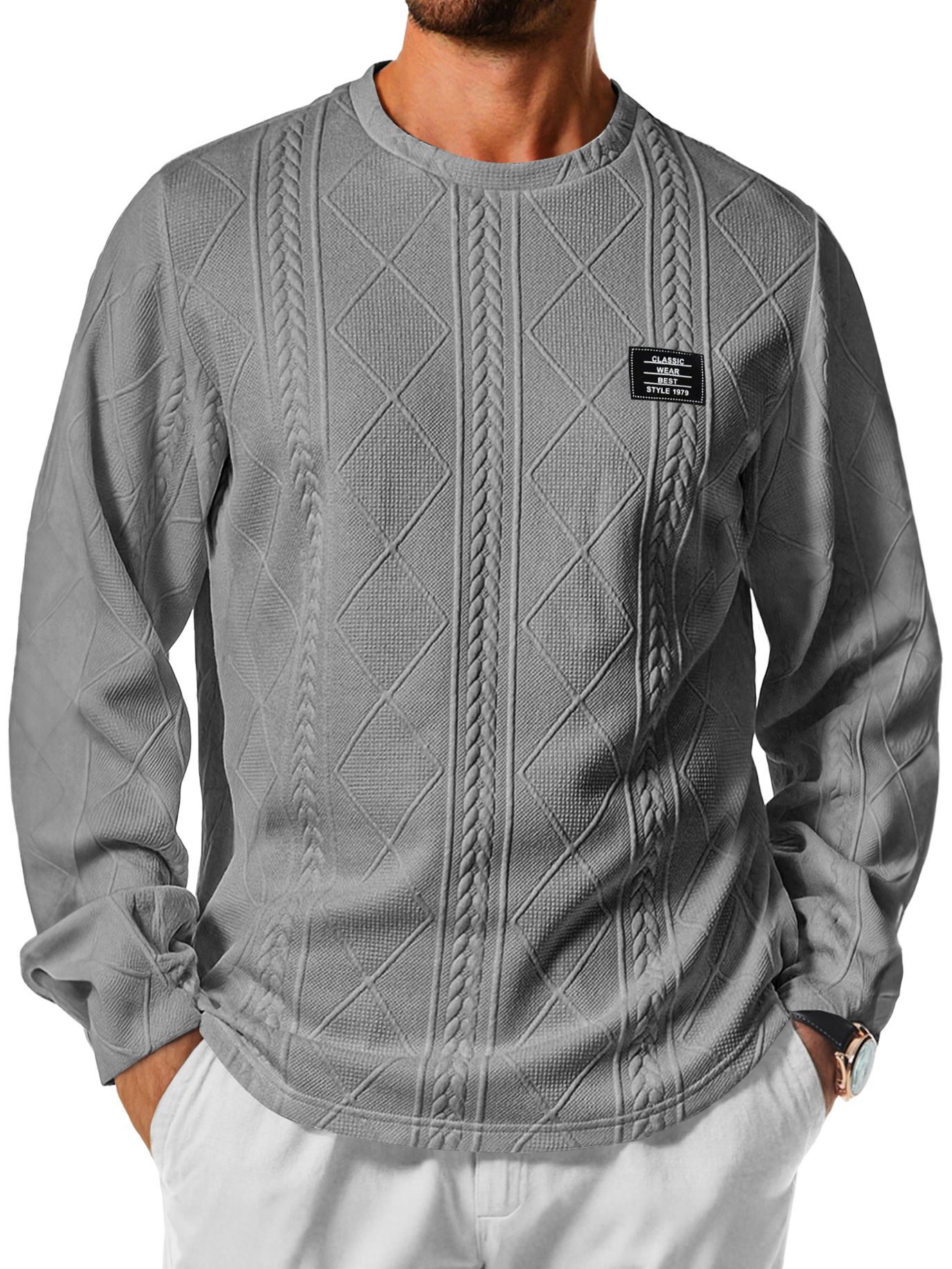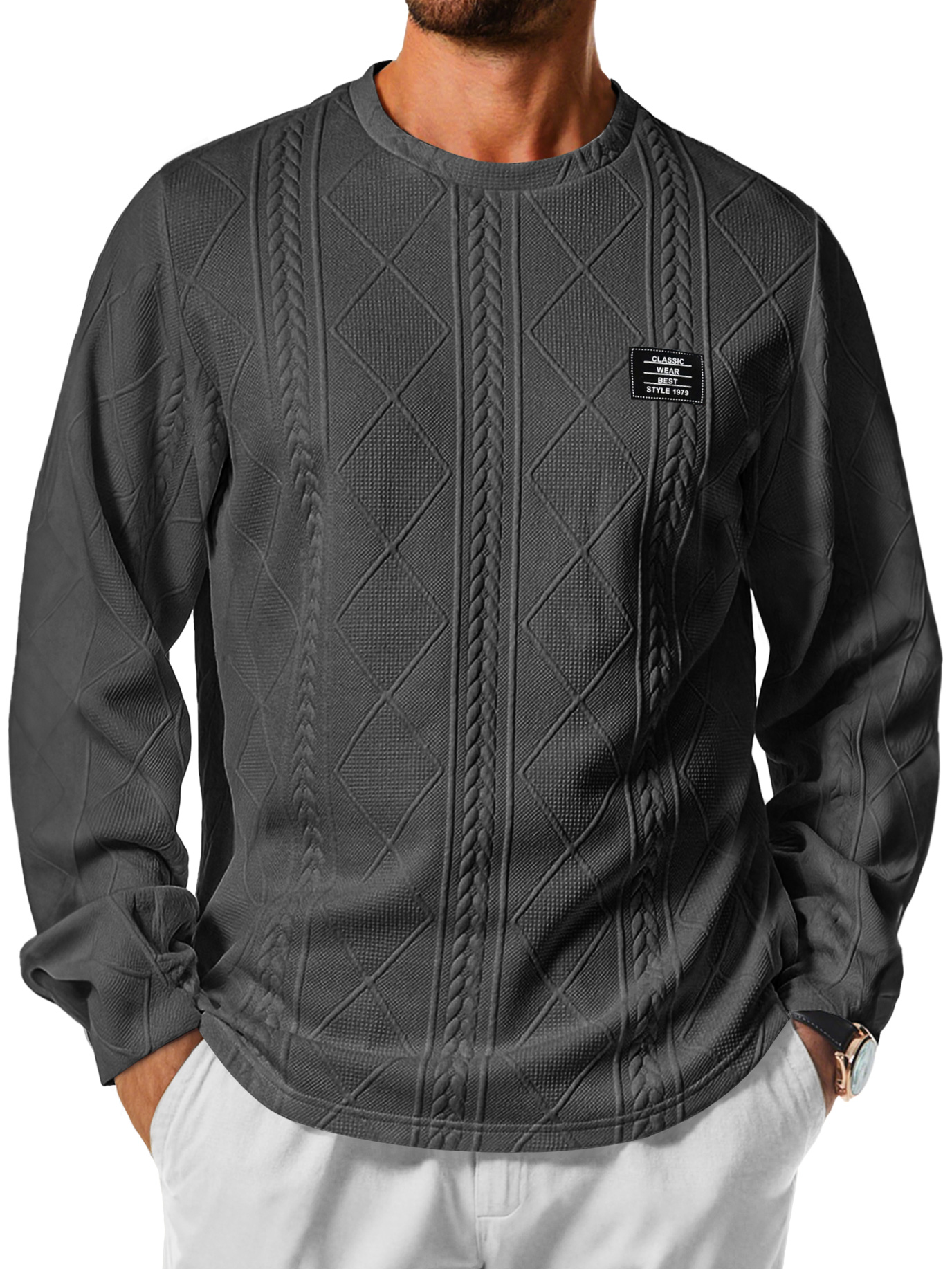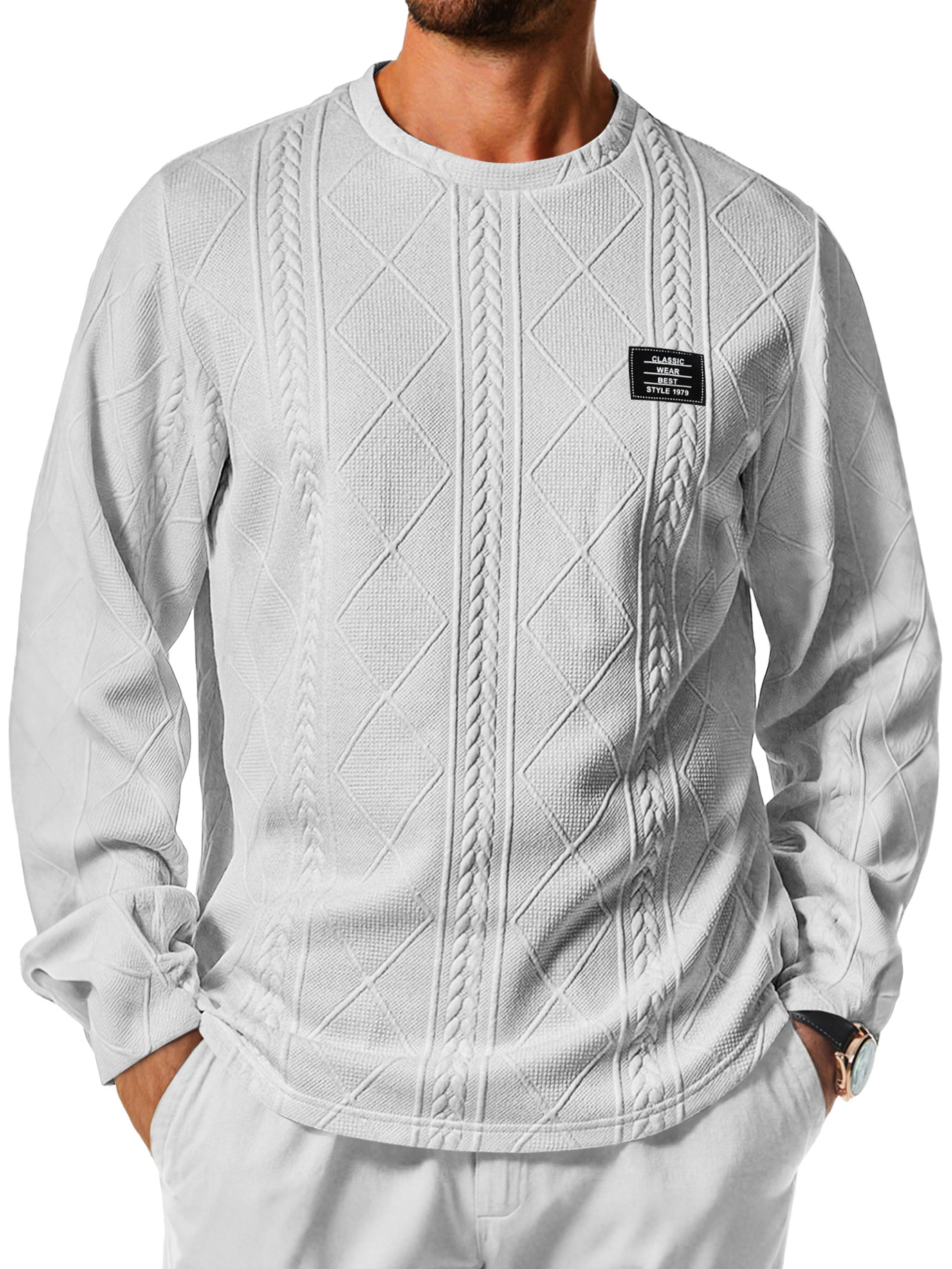Men's Daily Round Neck Jacquard Texture Embroidered Logo Casual Long-sleeved T-shirt