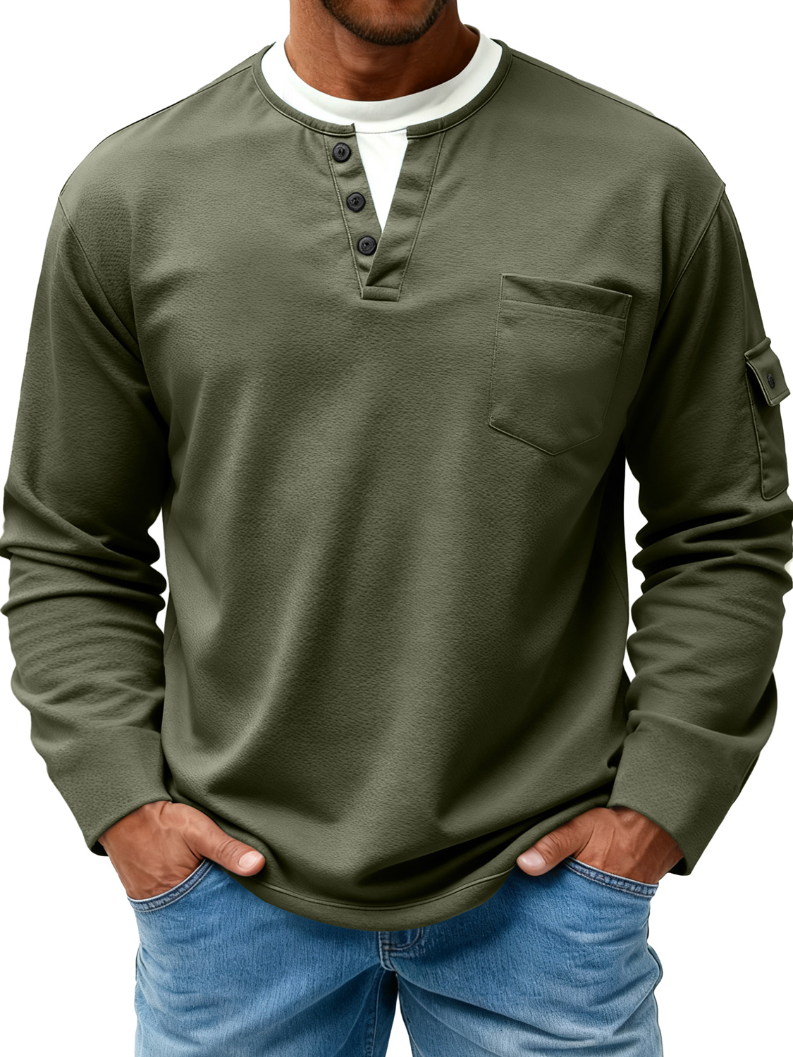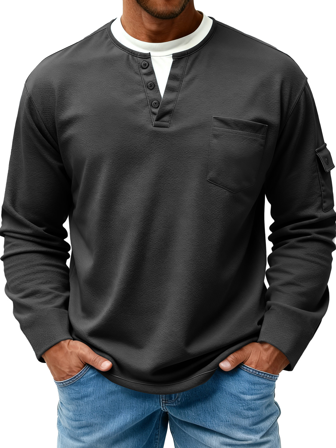 Men's Double-Layer Collar Faux Two-Piece Casual Long-Sleeve T-Shirt with Side Pockets