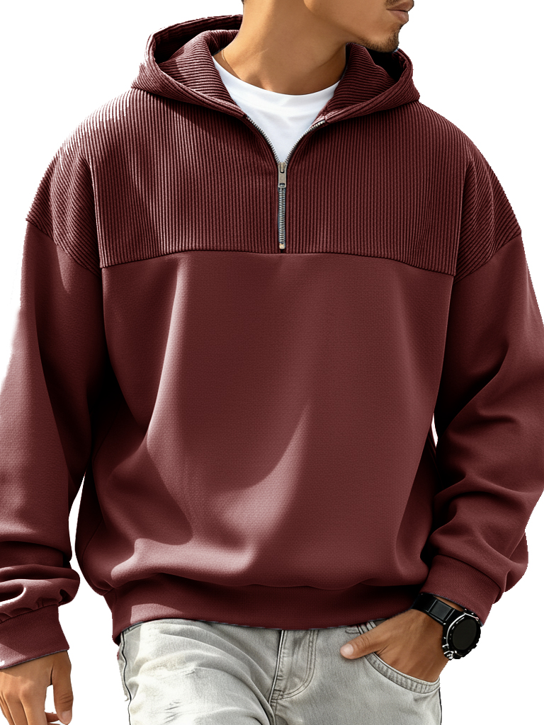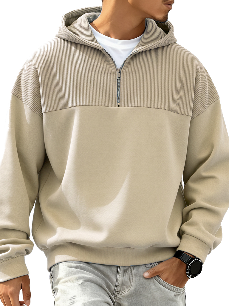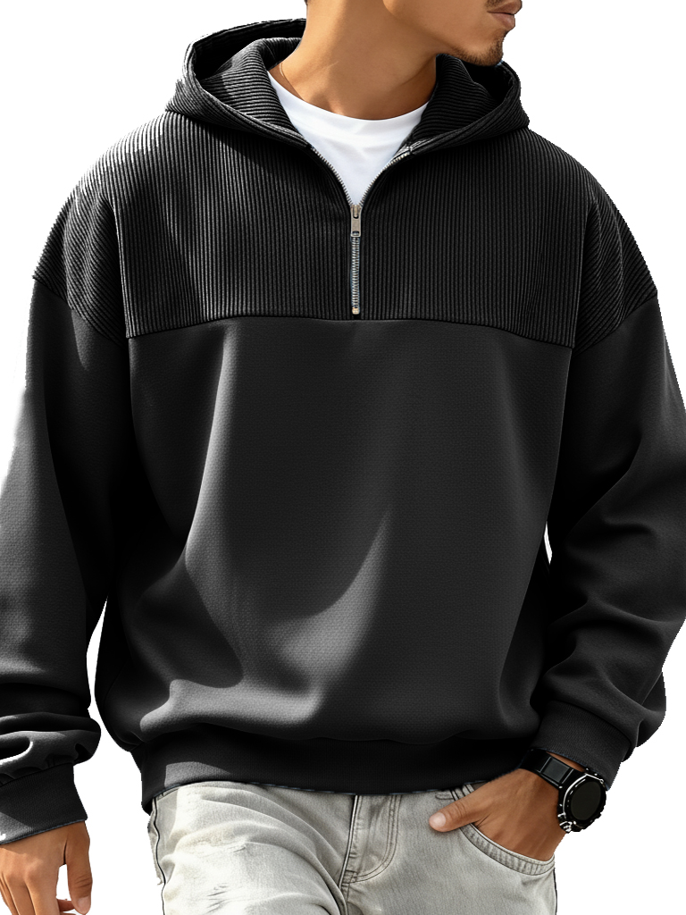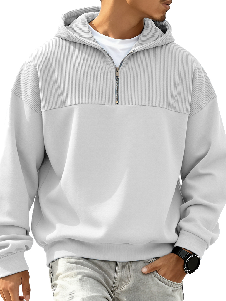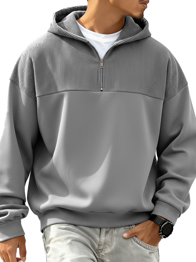 Men's Fashion Casual Patchwork Ribbed Fabric Long-Sleeve Hooded Zipper Top