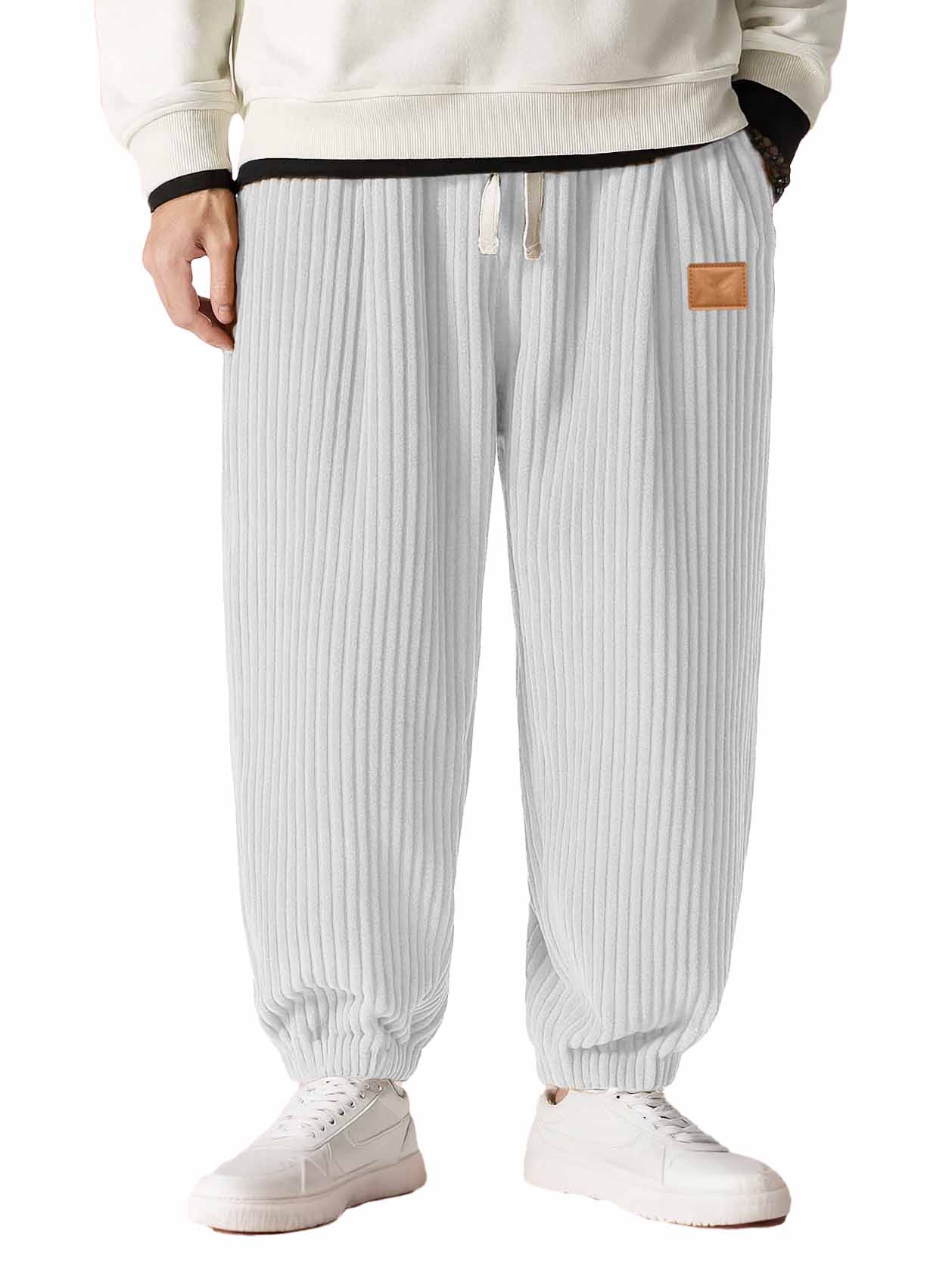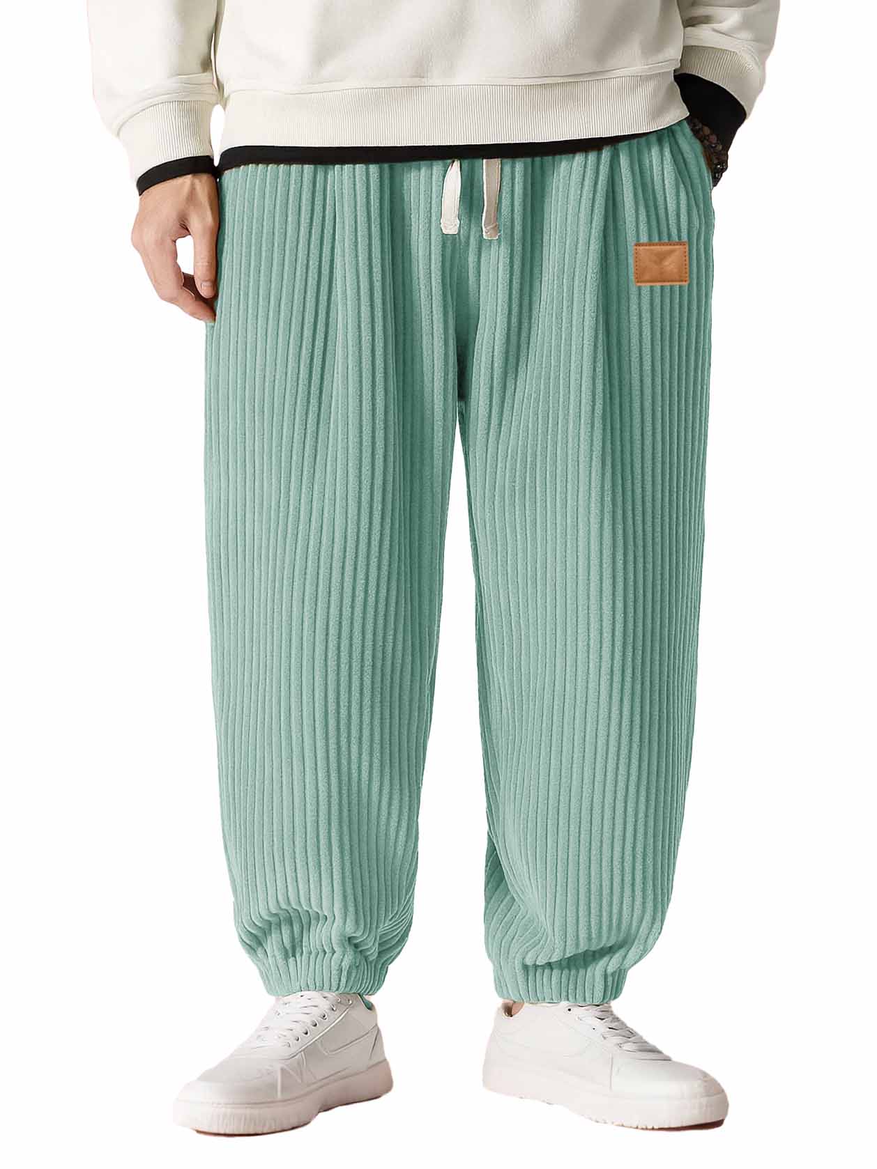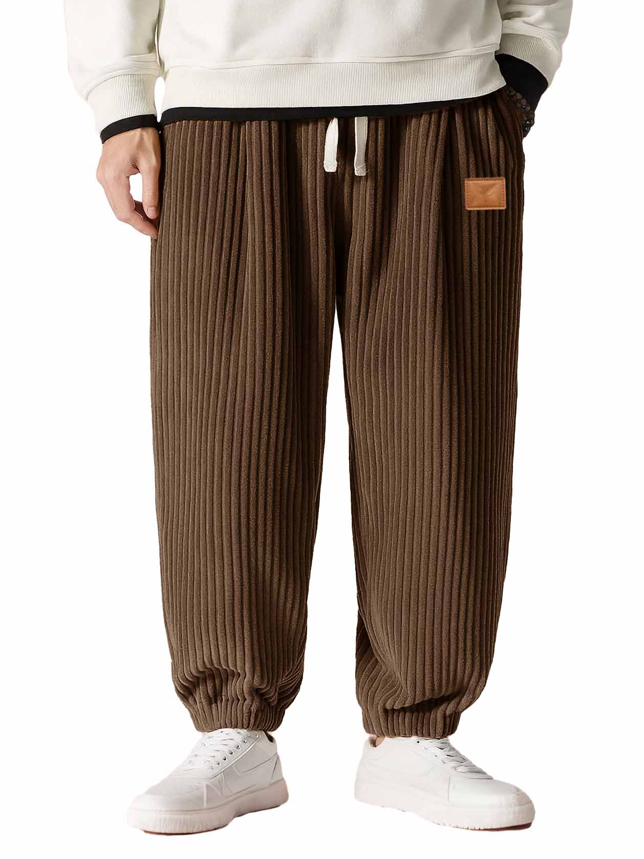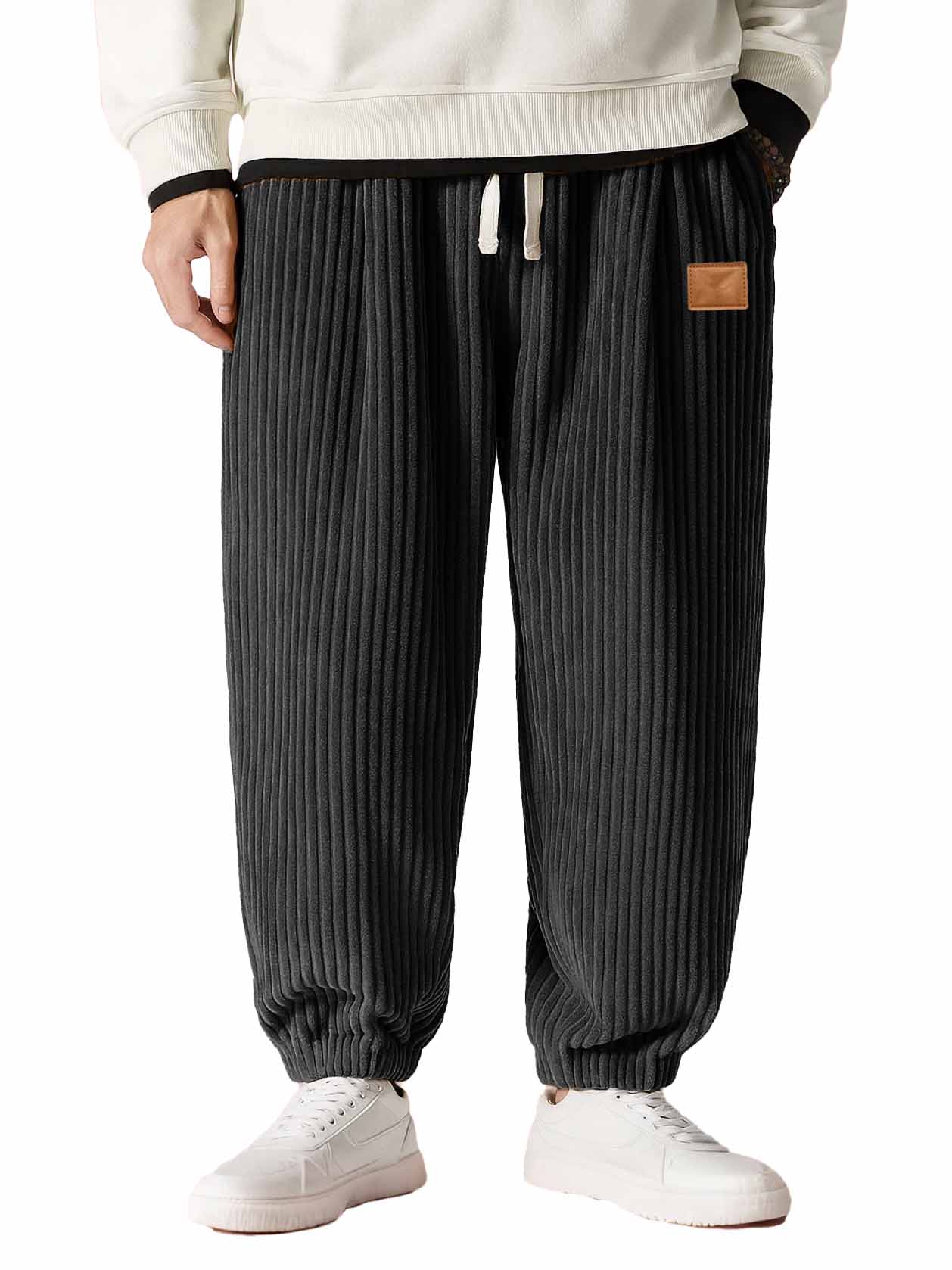Men's Fashion Casual Thick Corduroy Fabric Leather Patch Embroidered Drawstring Loose Pocket Trousers