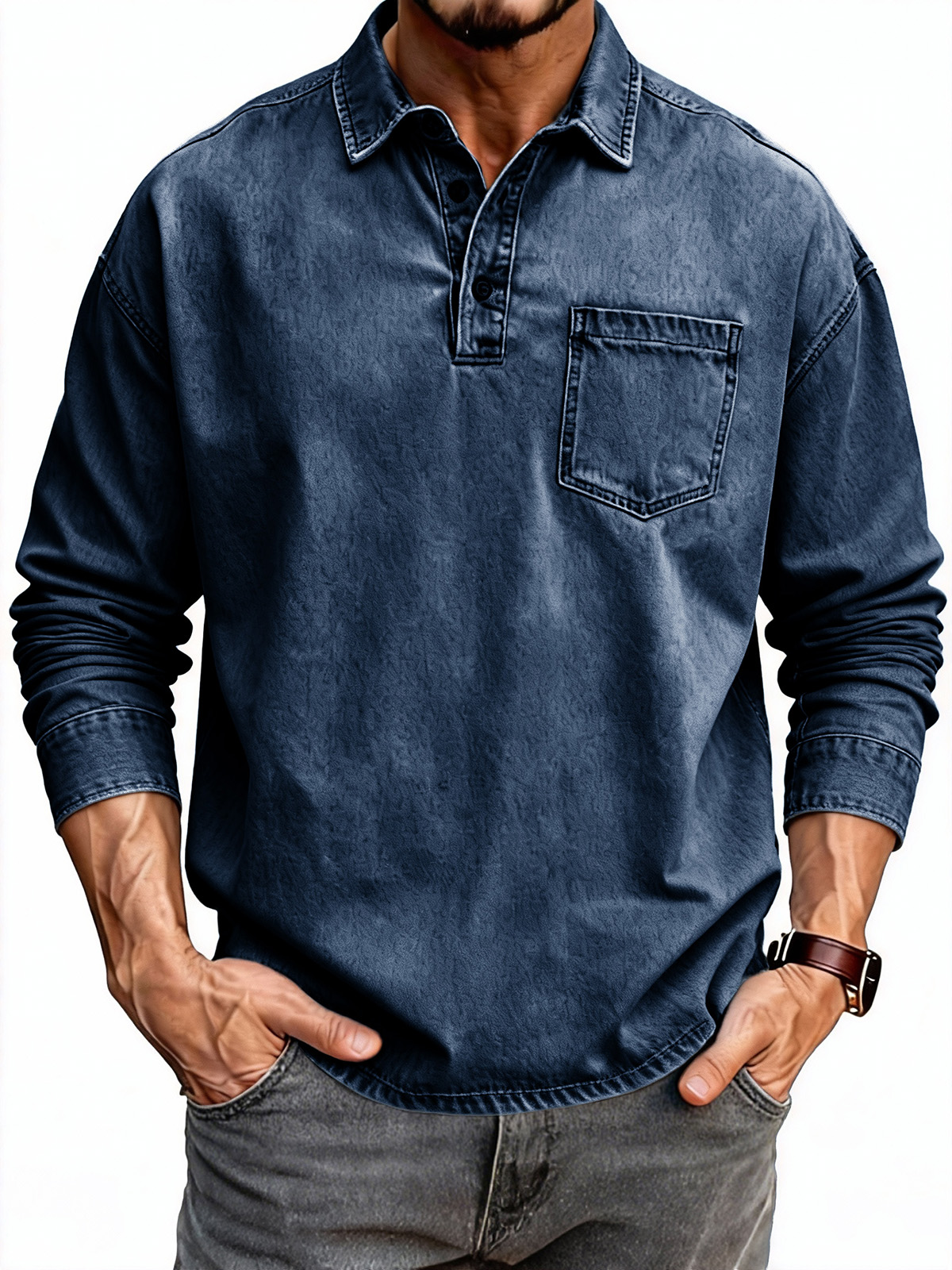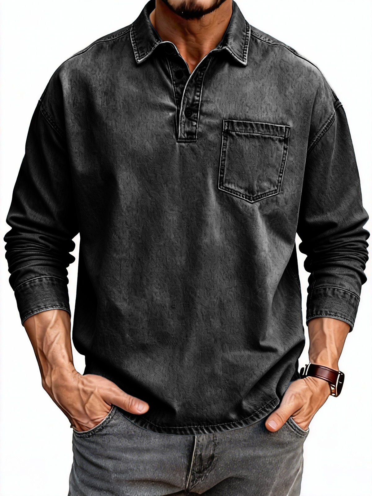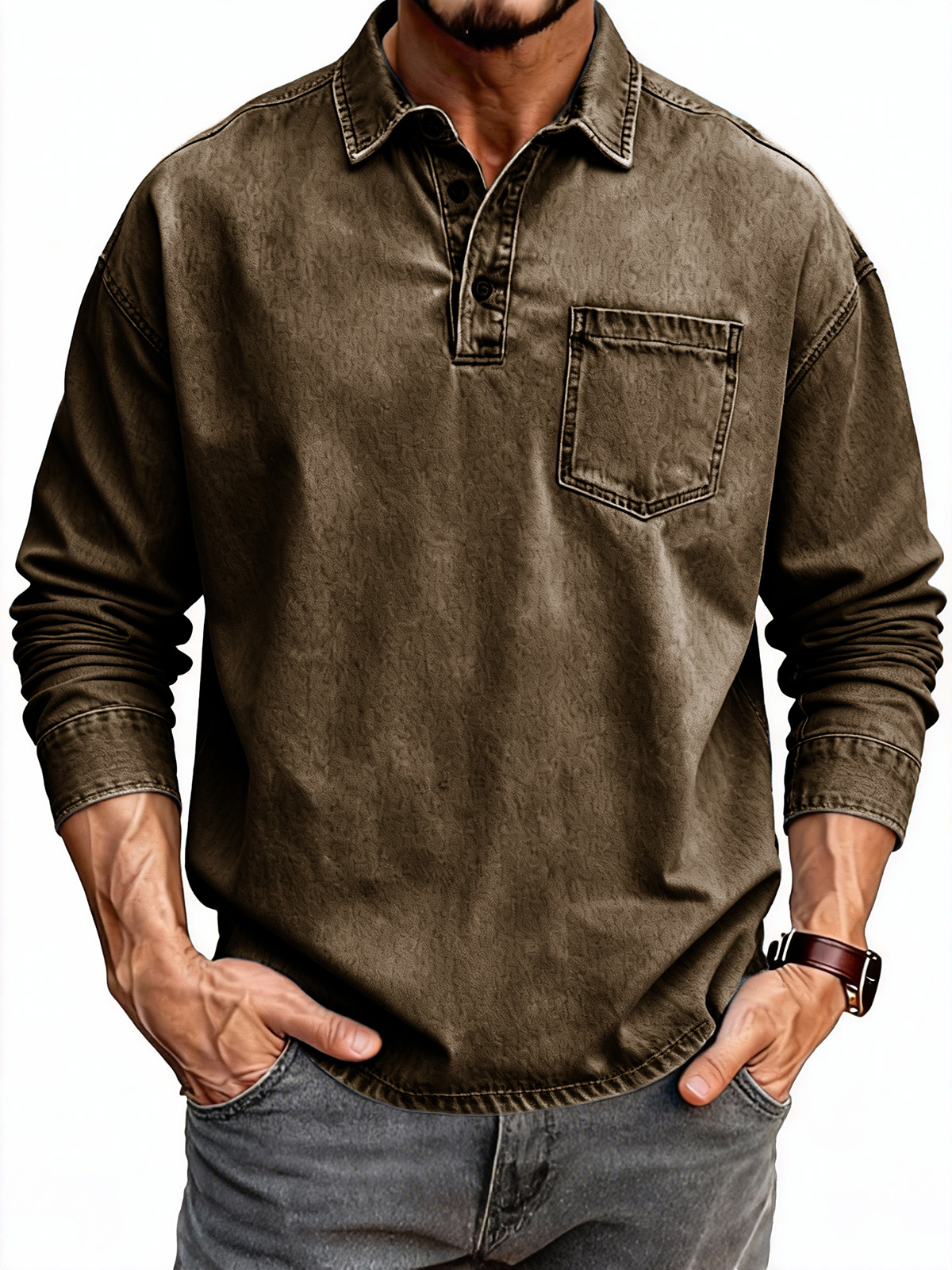 Men's Fashion Retro Distressed Lapel Pocket Long-Sleeve Polo Shirt