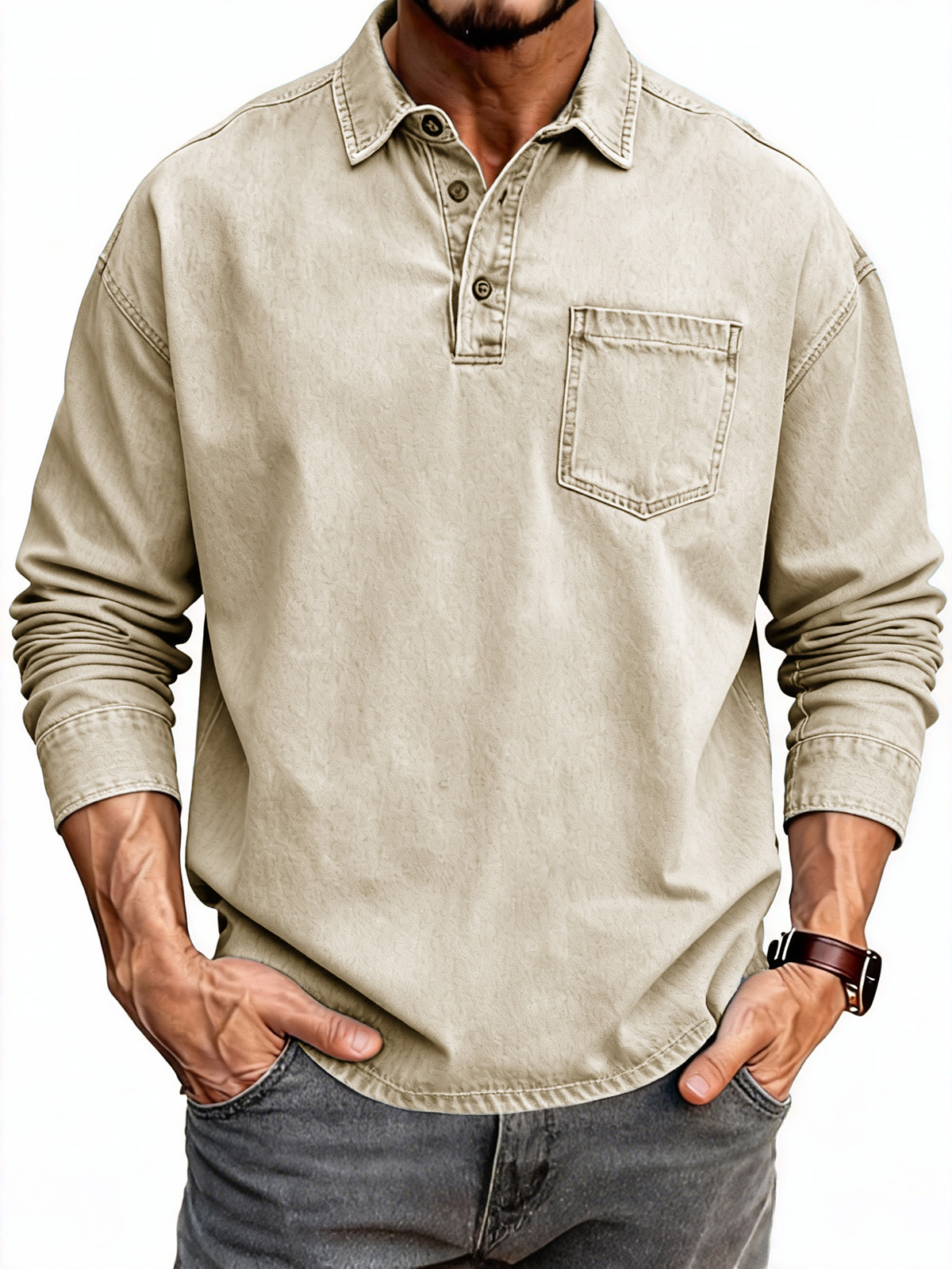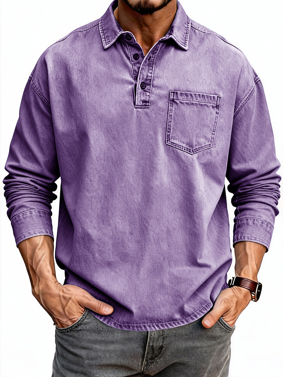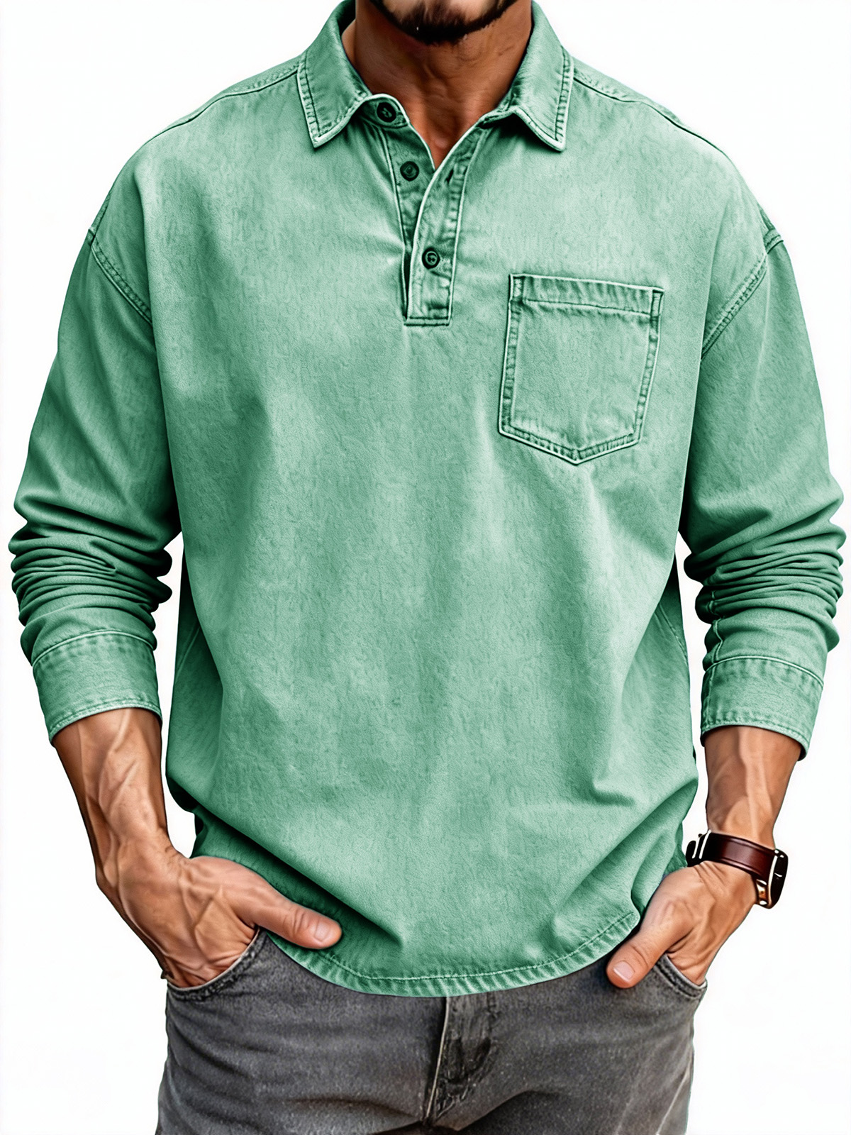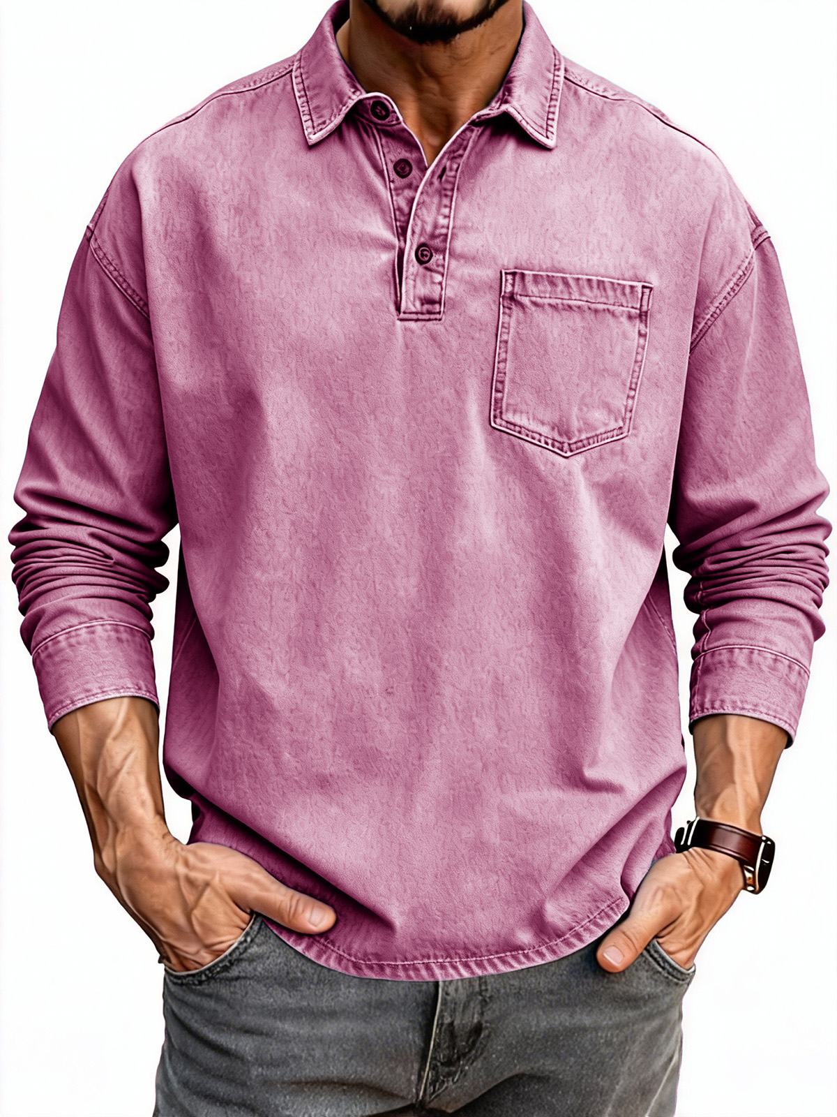 Men's Fashion Retro Distressed Lapel Pocket Long-Sleeve Polo Shirt