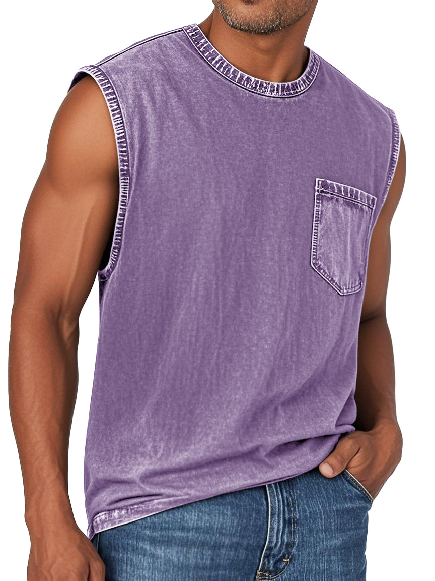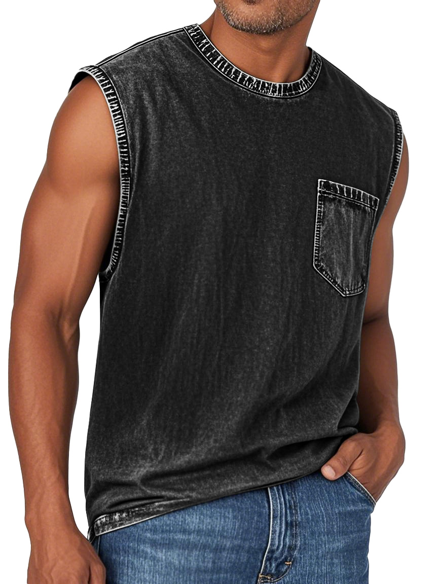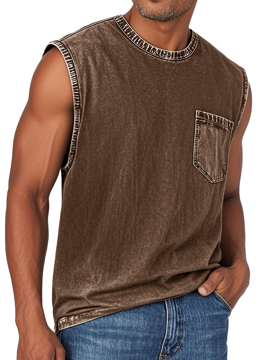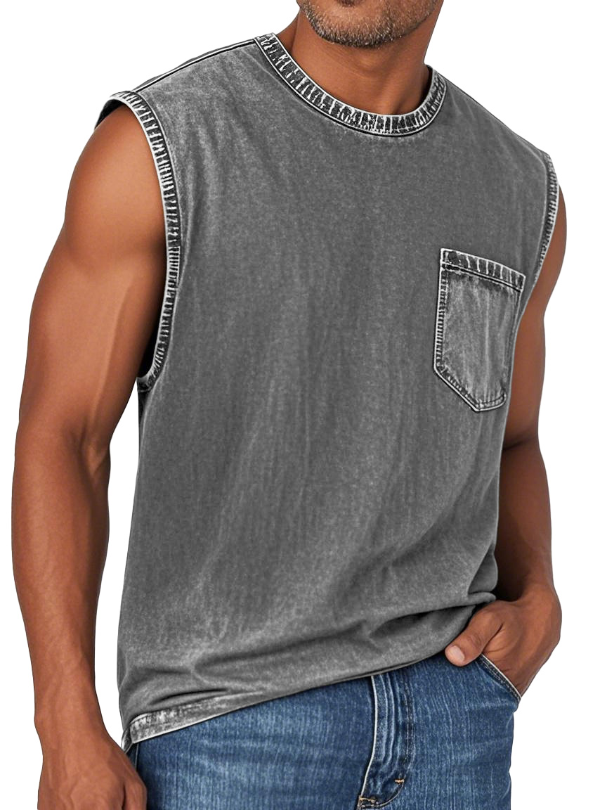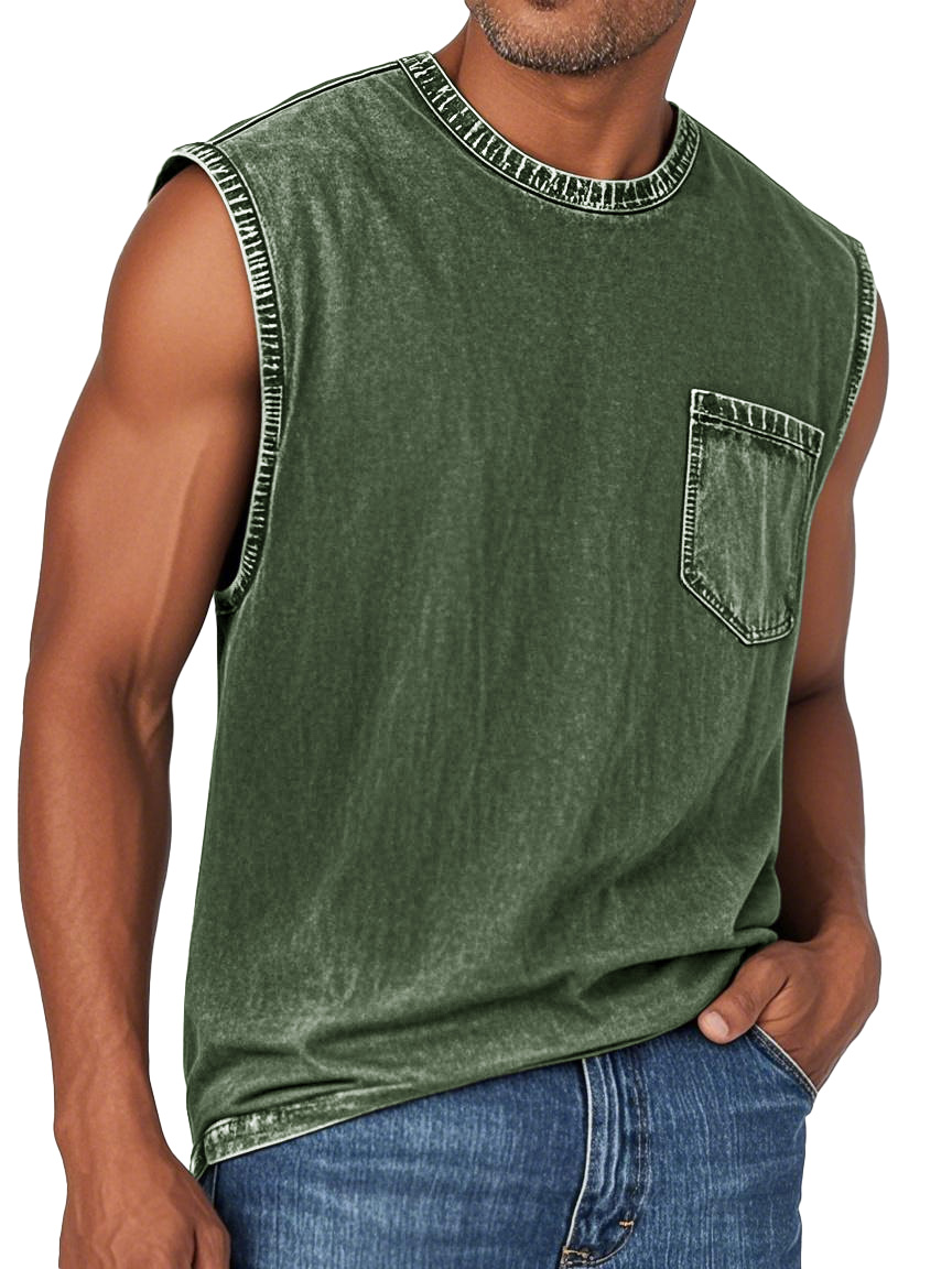 Men's Fashion Retro Washed Round Neck Pocket Sleeveless T-shirt
