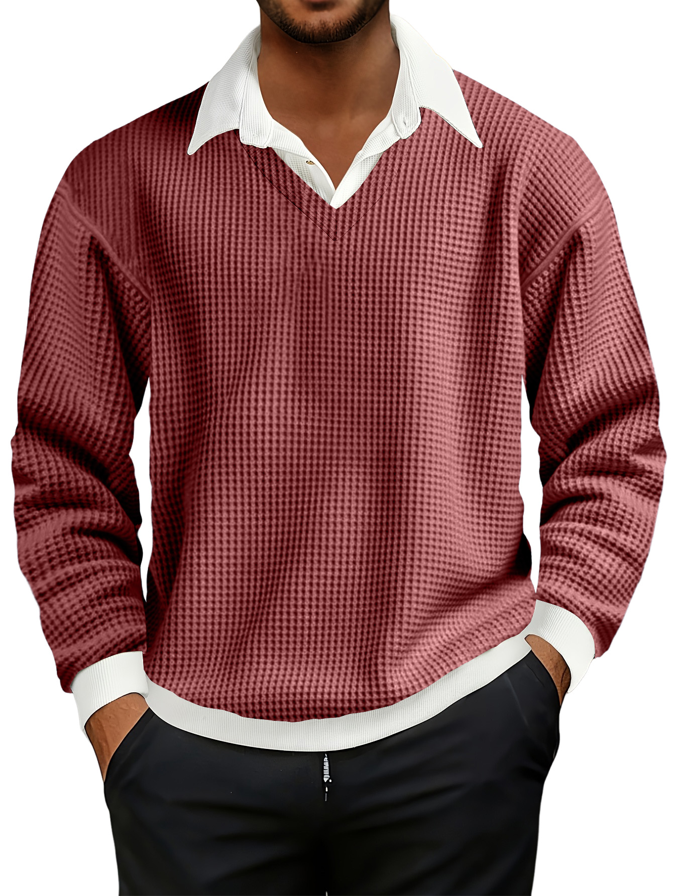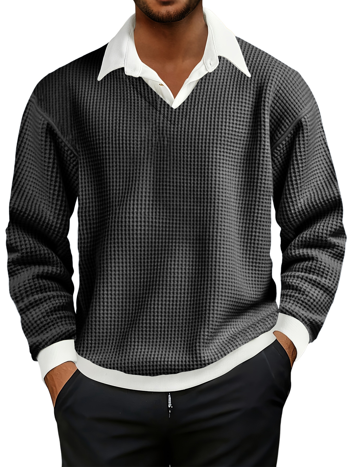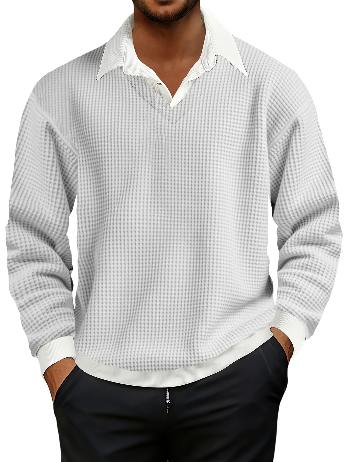 Men's Fashionable Casual Waffle Faux Two-piece Polo Sweatshirt