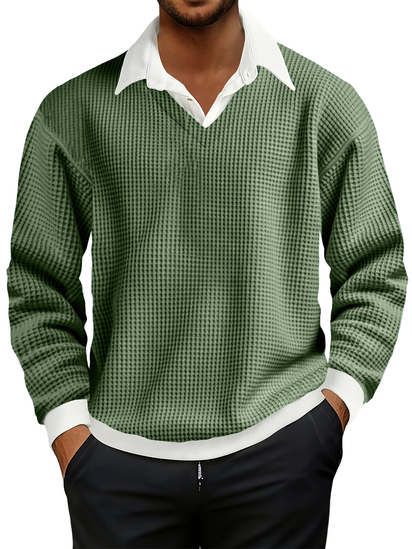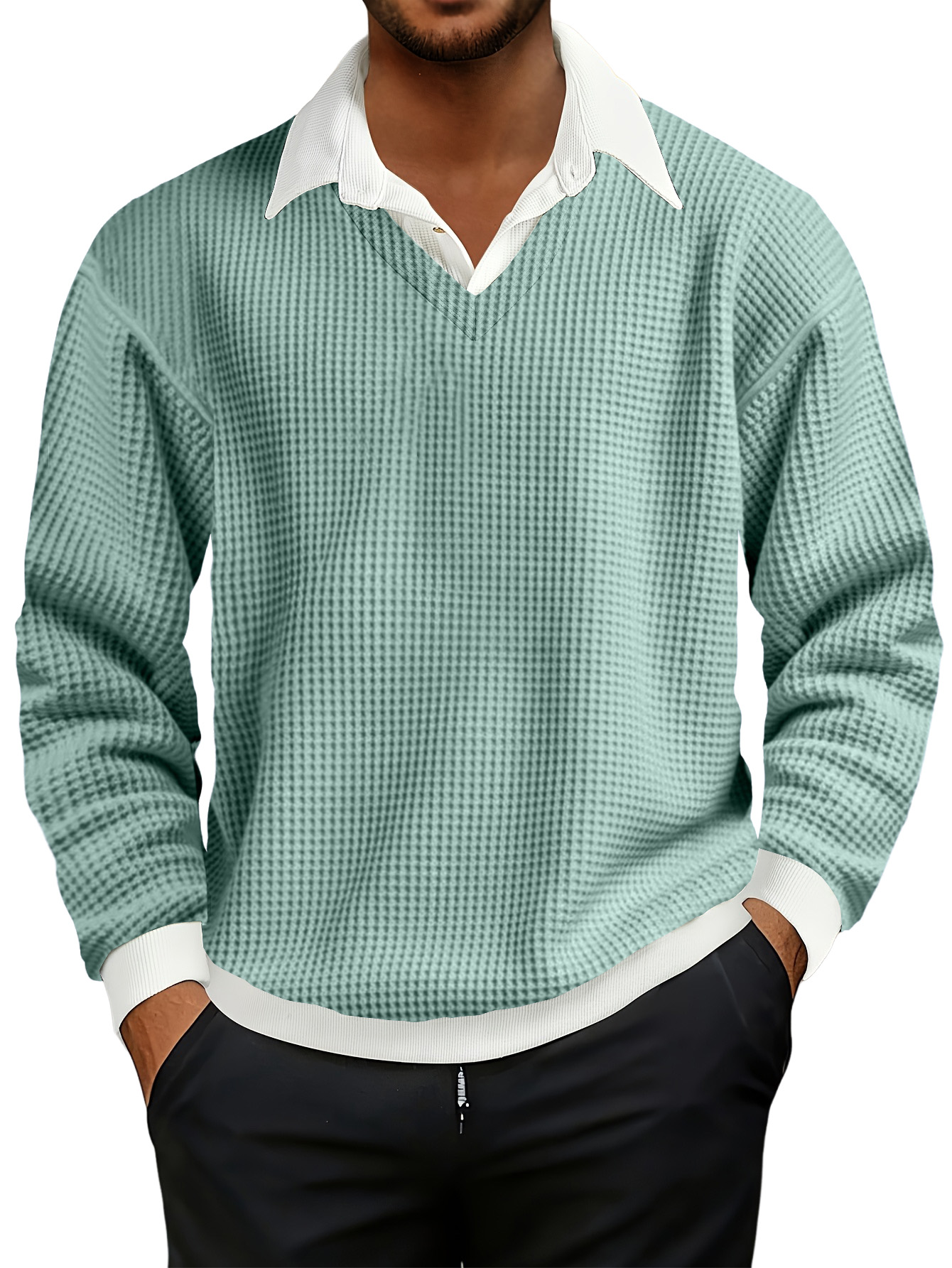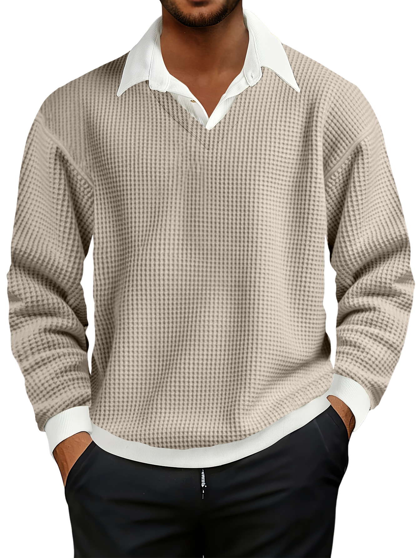 Men's Fashionable Casual Waffle Faux Two-piece Polo Sweatshirt