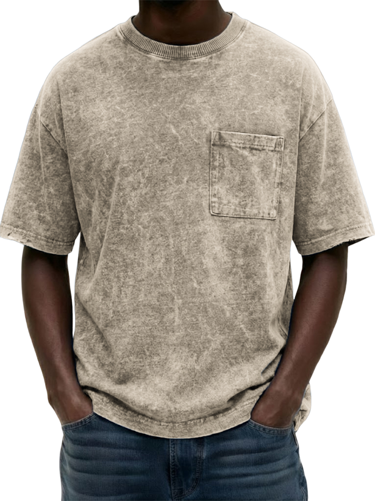 Men's Heavyweight Pure Cotton Washed Distressed Vintage Short-Sleeve T-Shirt with Chest Pocket