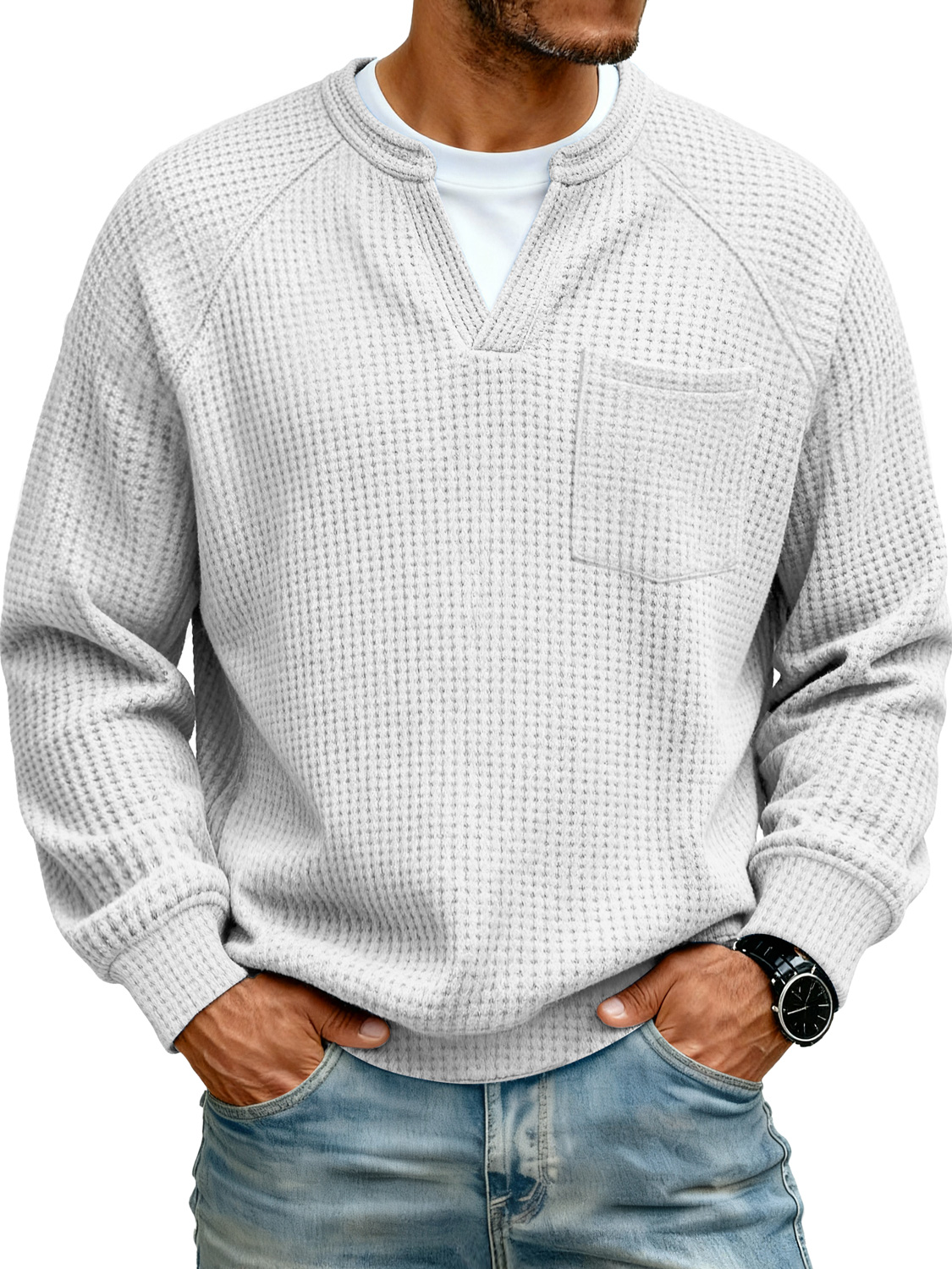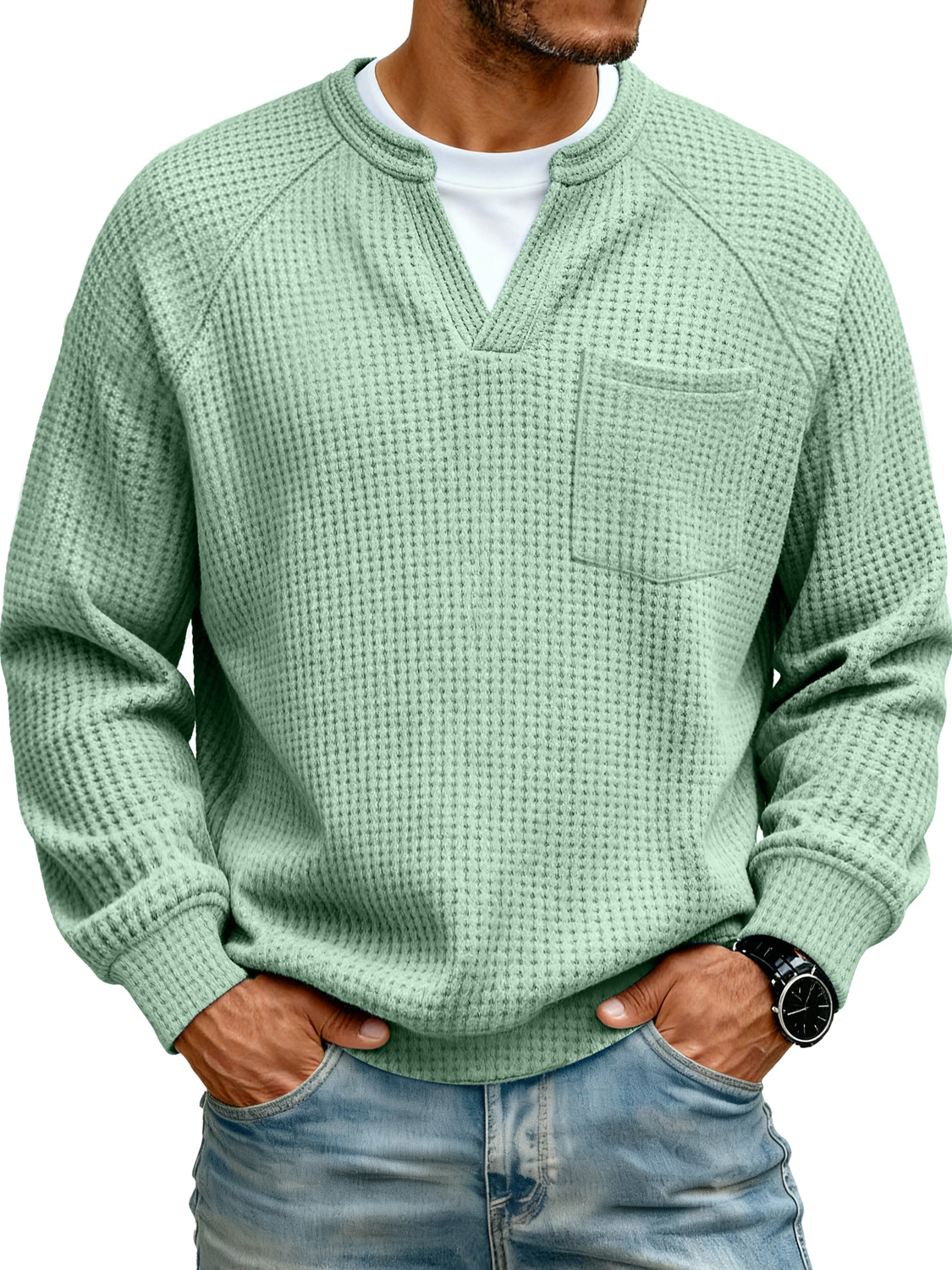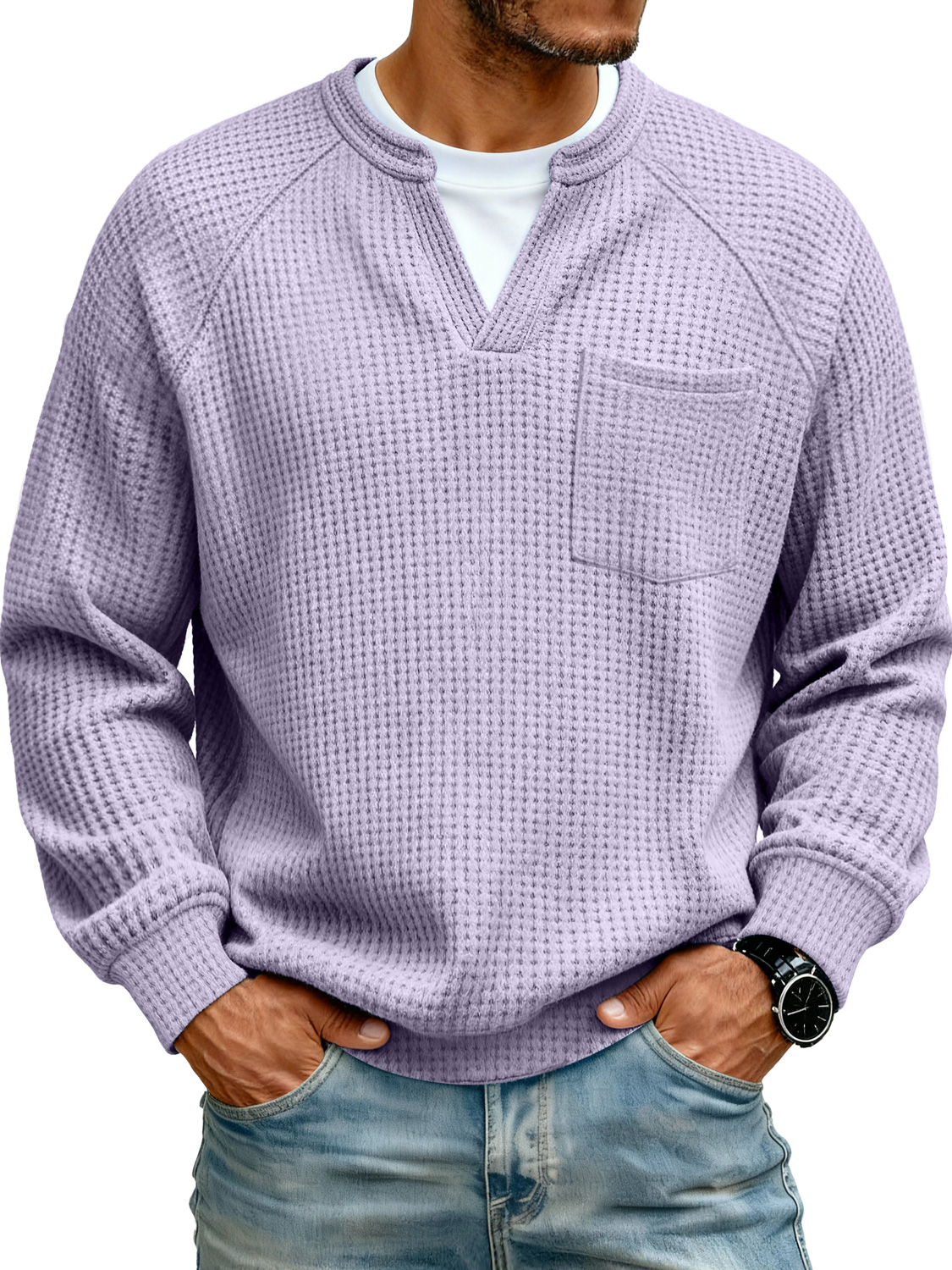 Men's Raglan Waffle Knit Faux Two-Piece Casual Pocket Long-Sleeve T-Shirt
