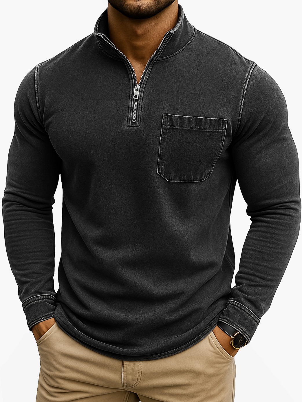 Men's Retro Casual Washed Distressed Quarter Zip Pocket Long Sleeve T-Shirt