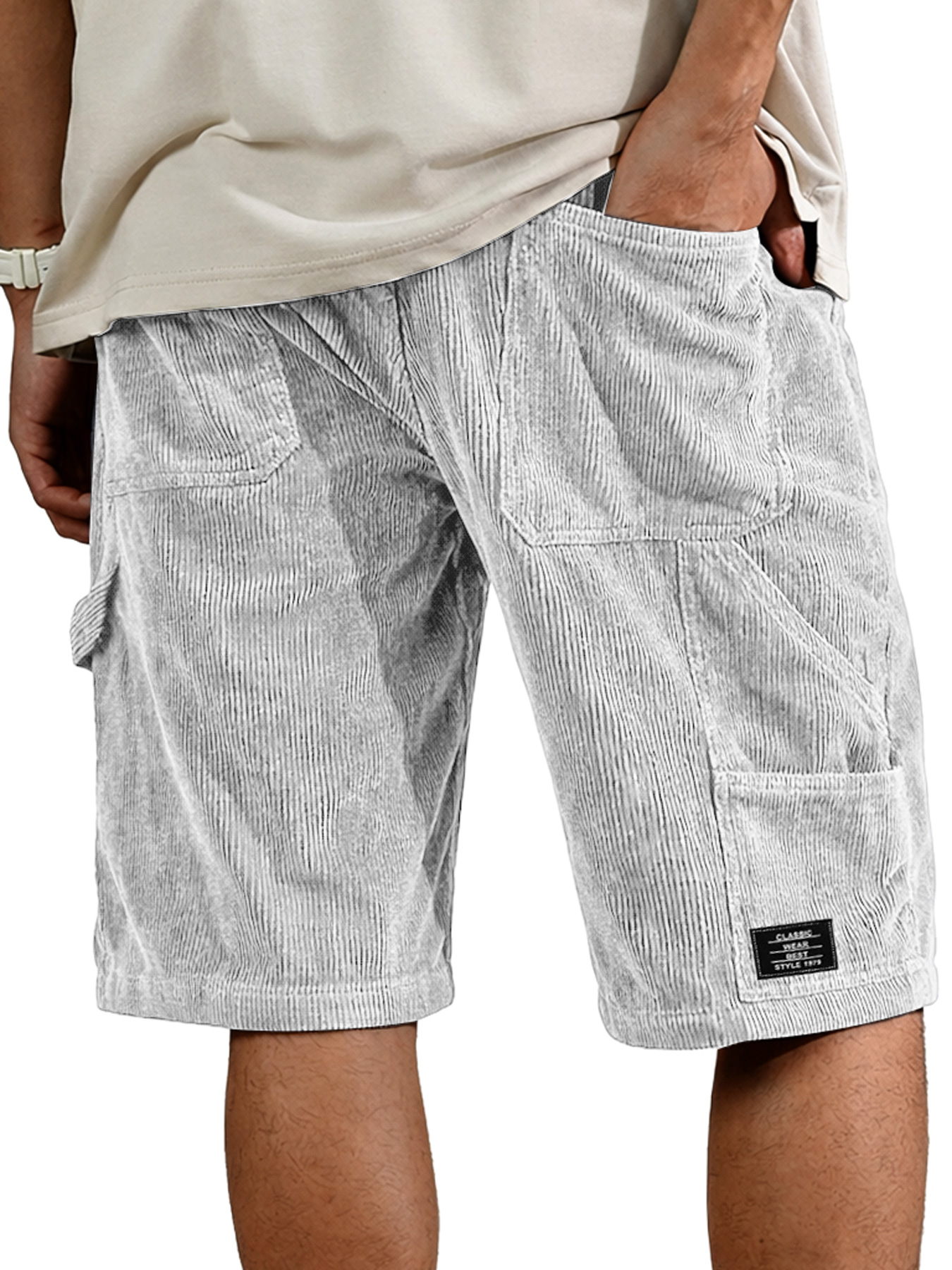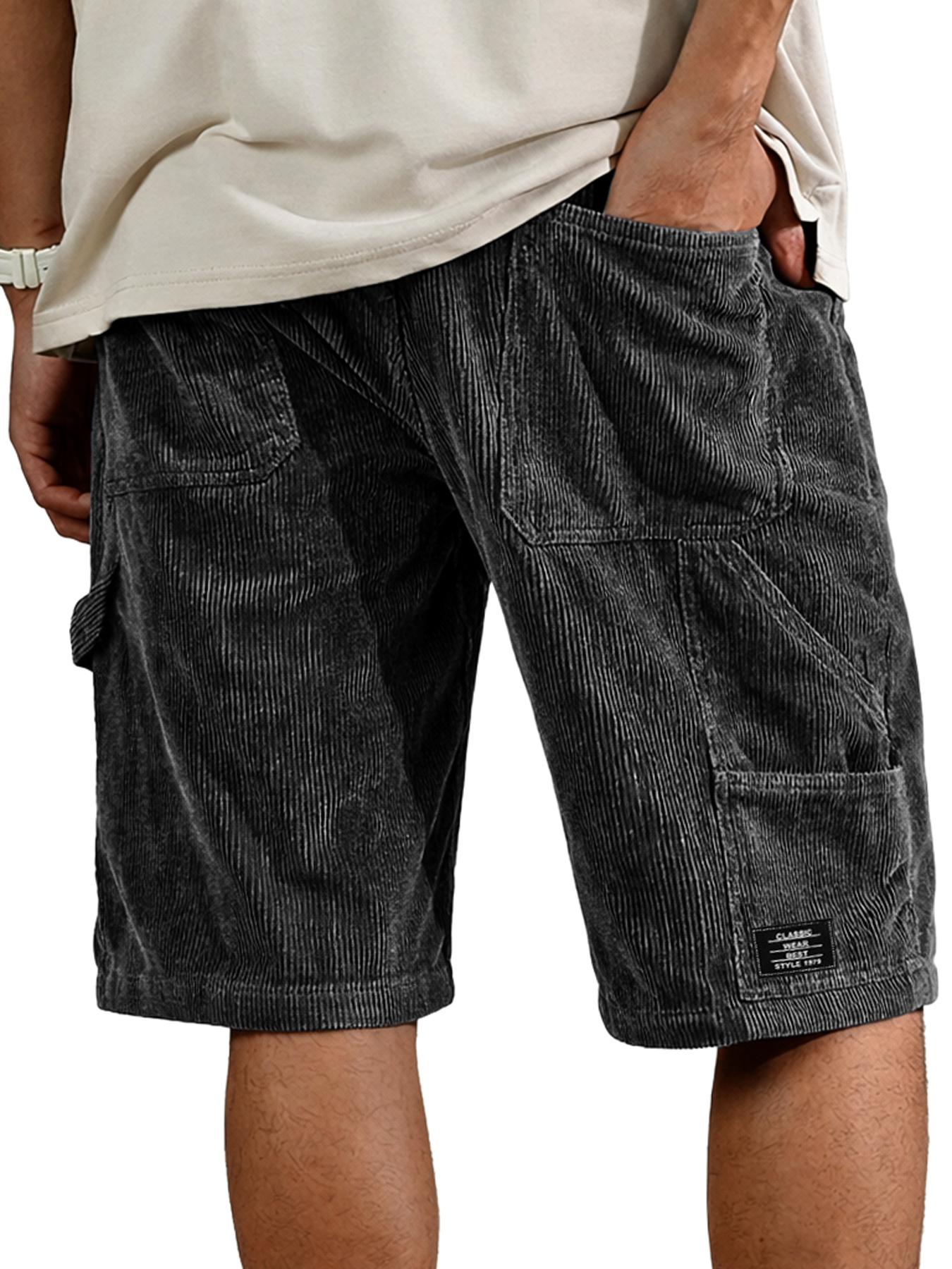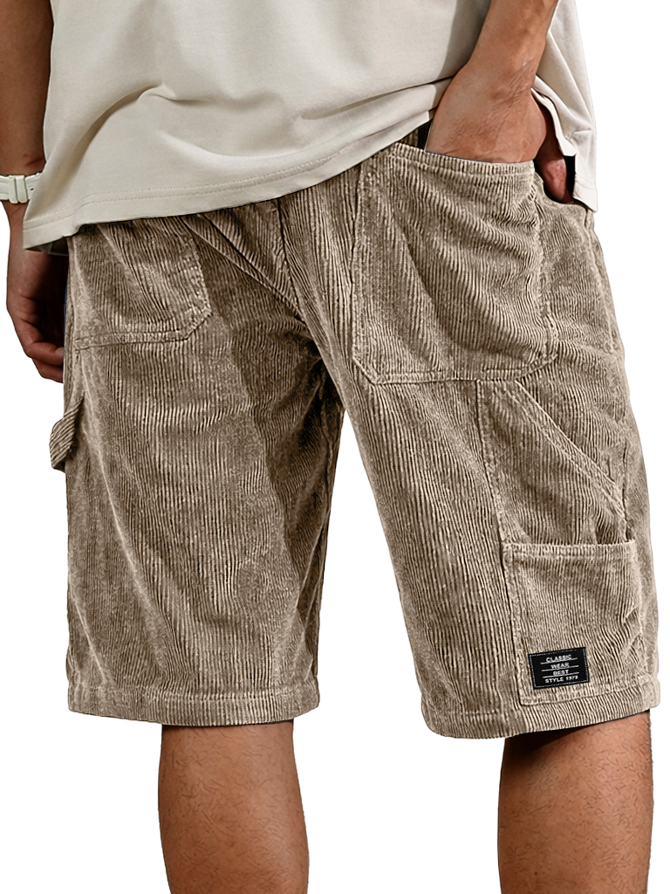 Men's Retro Corduroy Multi-Pocket Embroidered Logo Casual Cargo Shorts