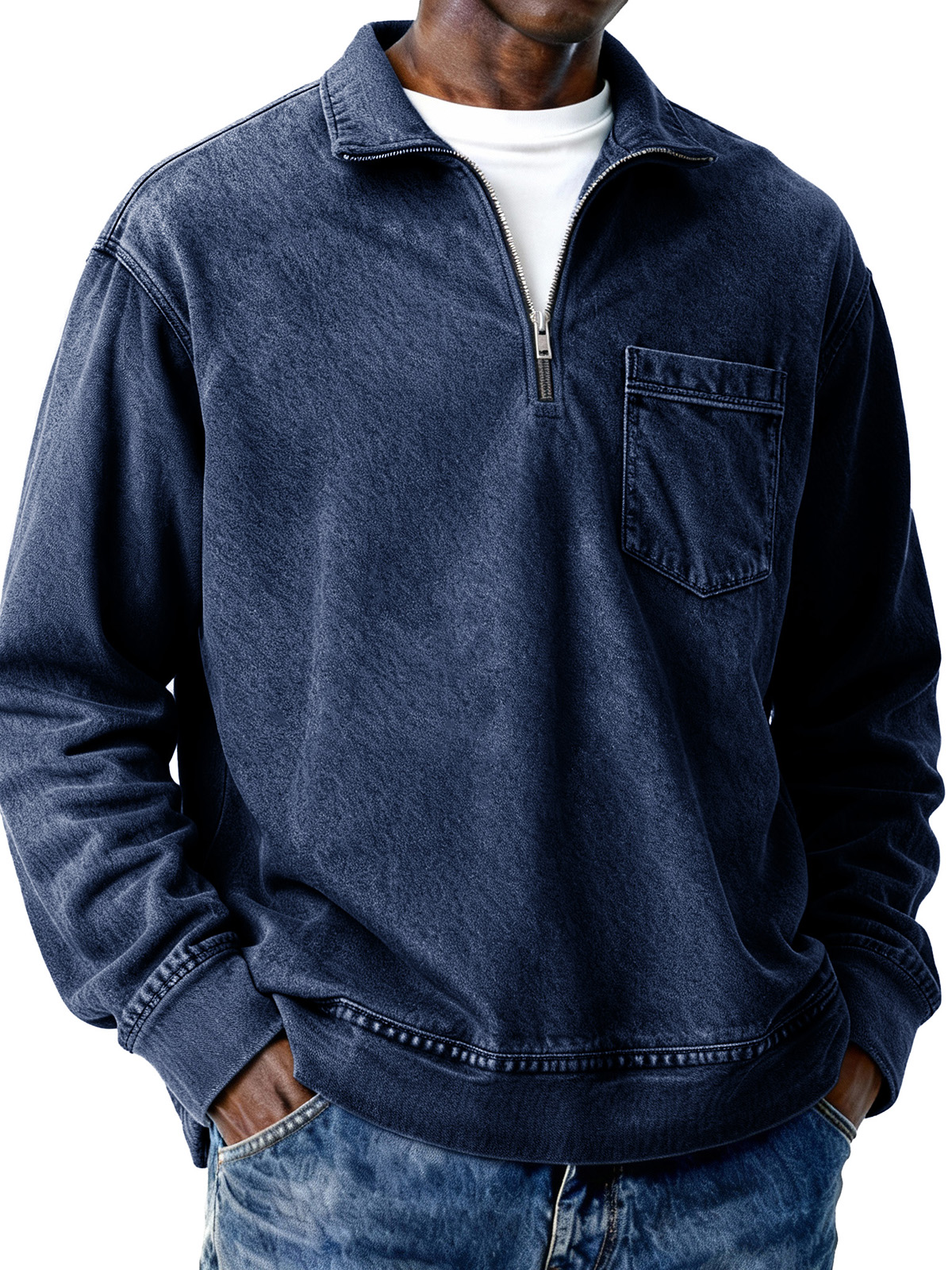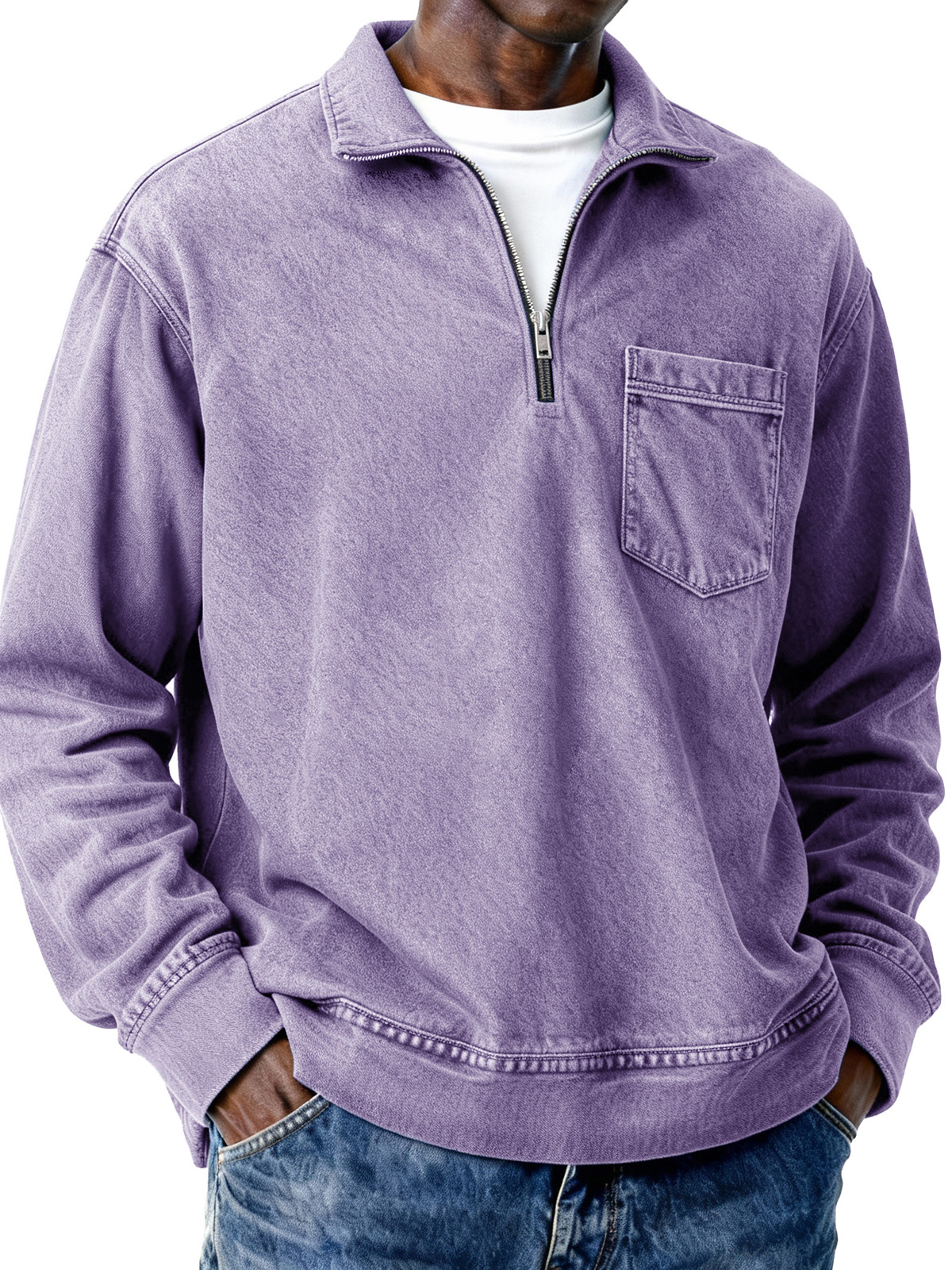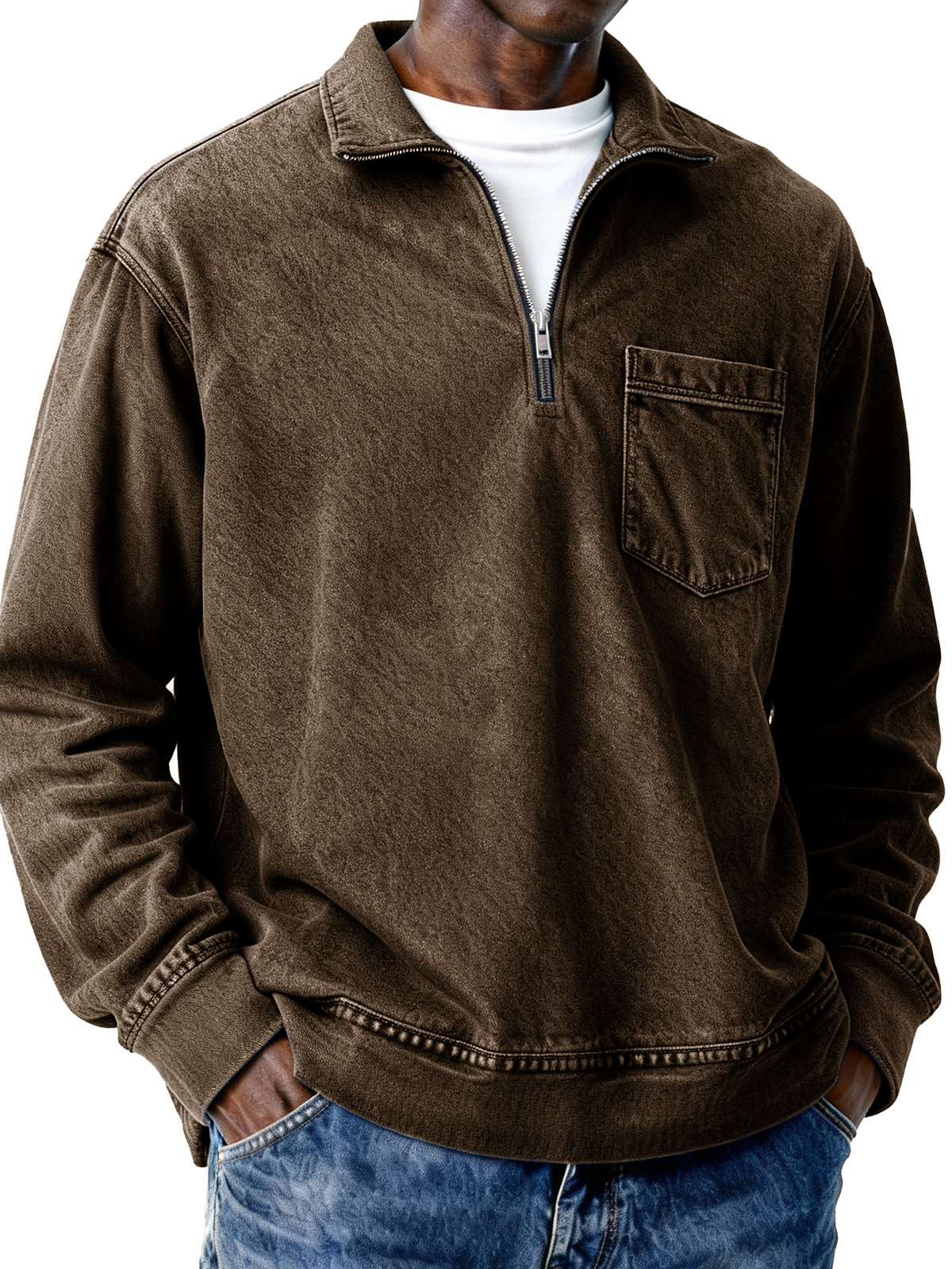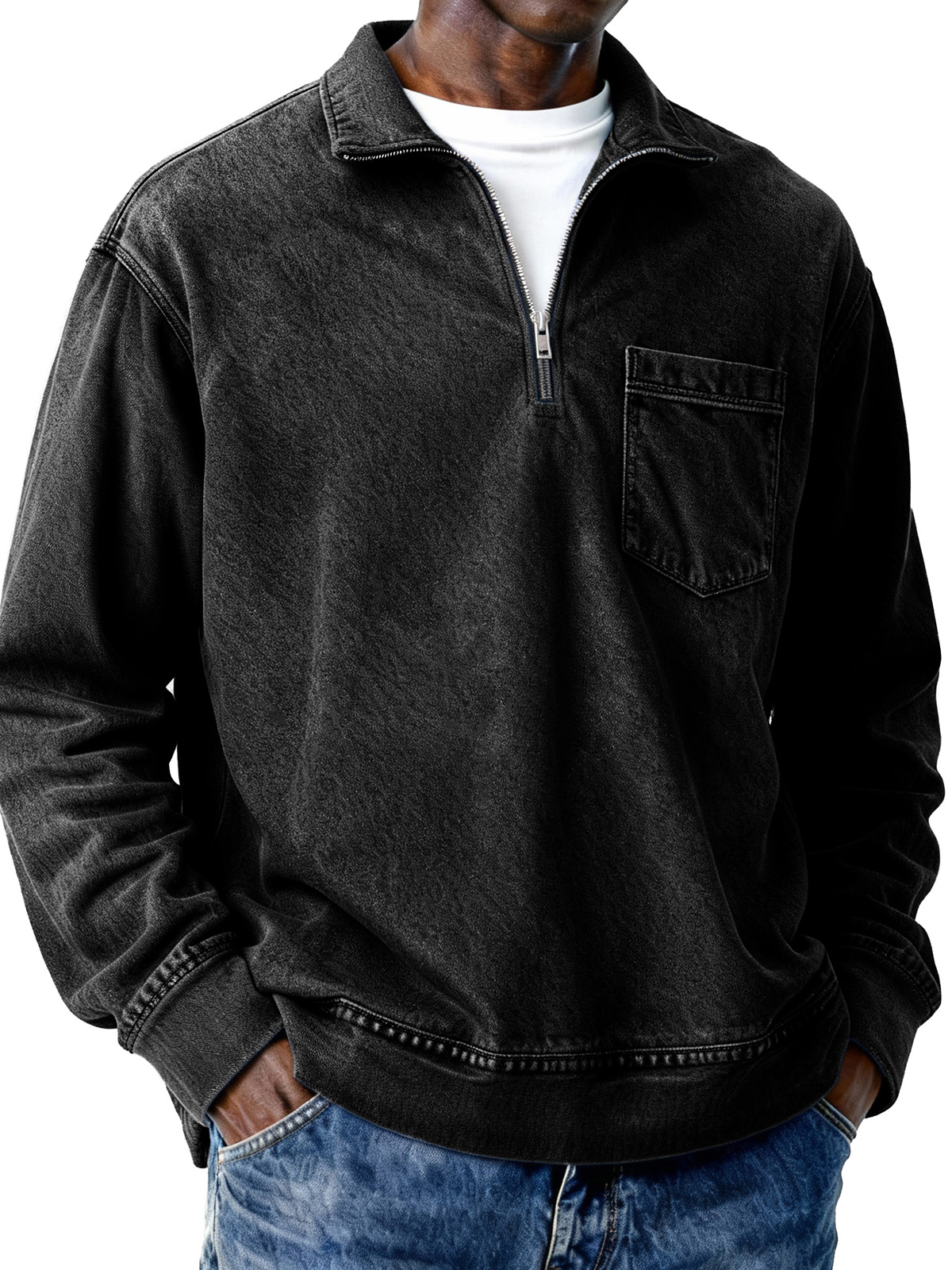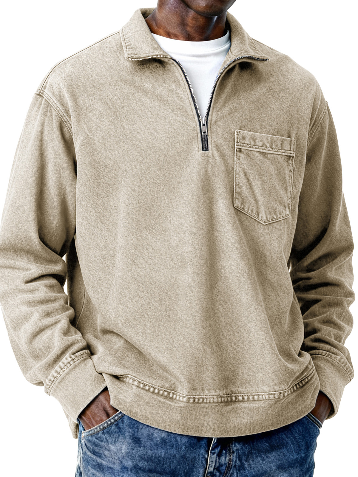 Men's Retro Distressed Zipper Loose Long-Sleeve Polo Shirt