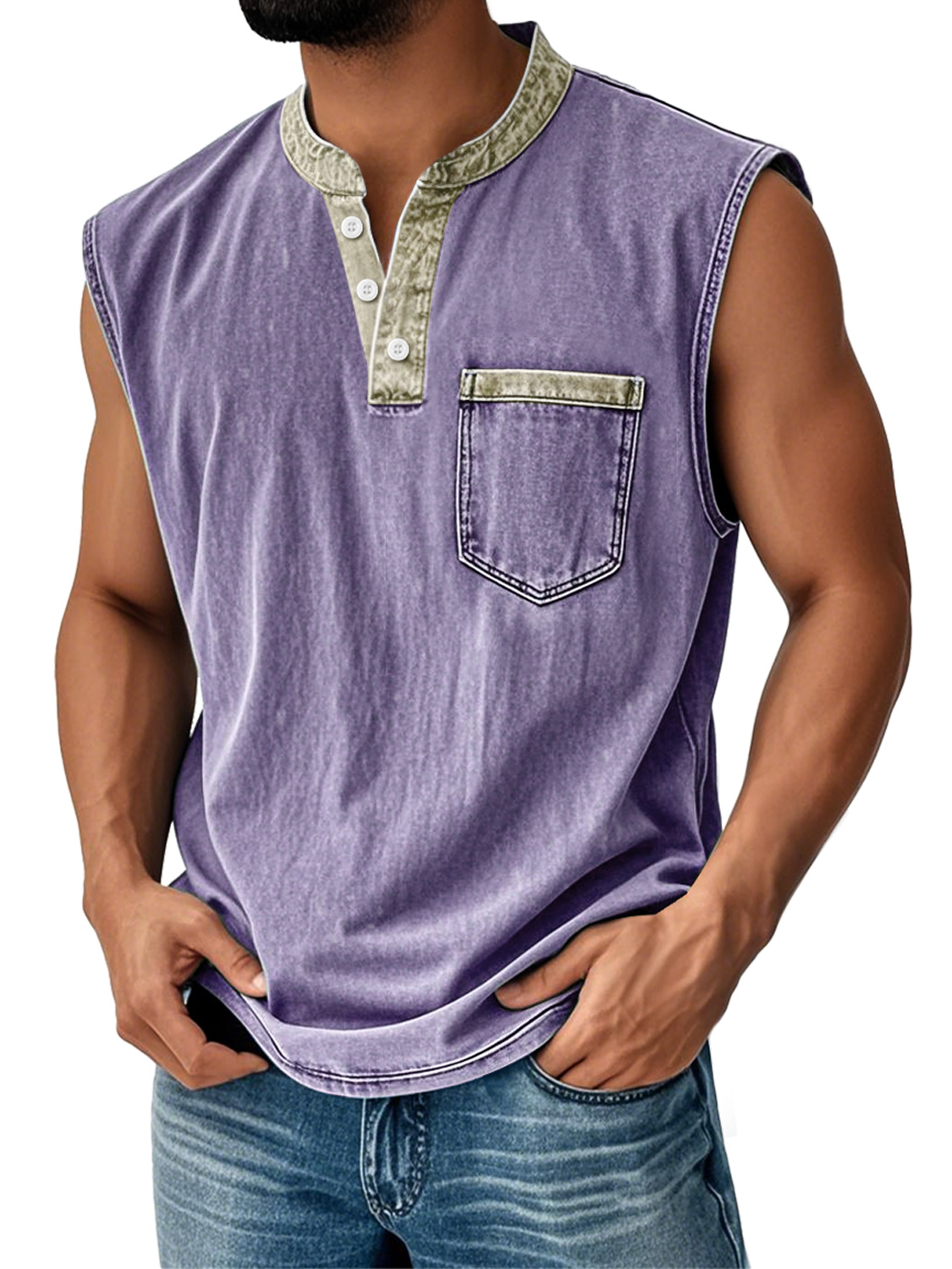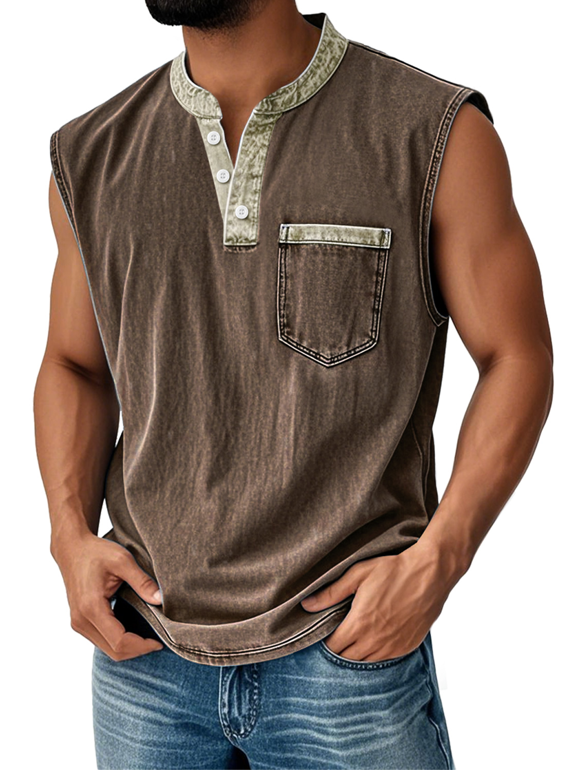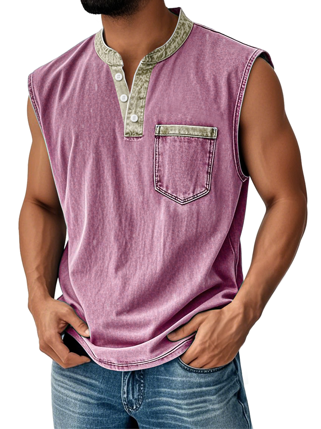 Men's Retro Everyday Colorblock Stand Collar Pocket Casual Sleeveless Henley Shirt