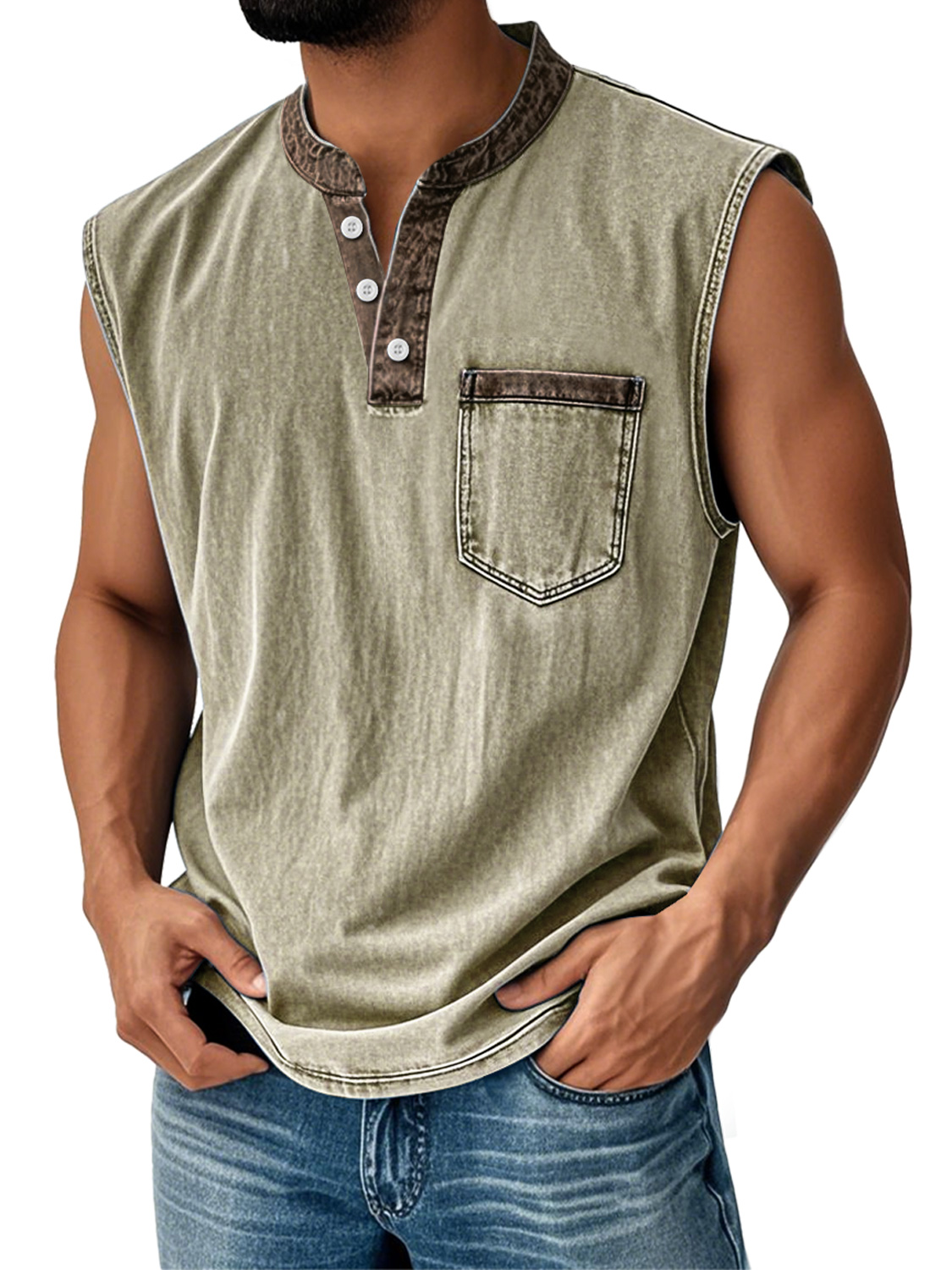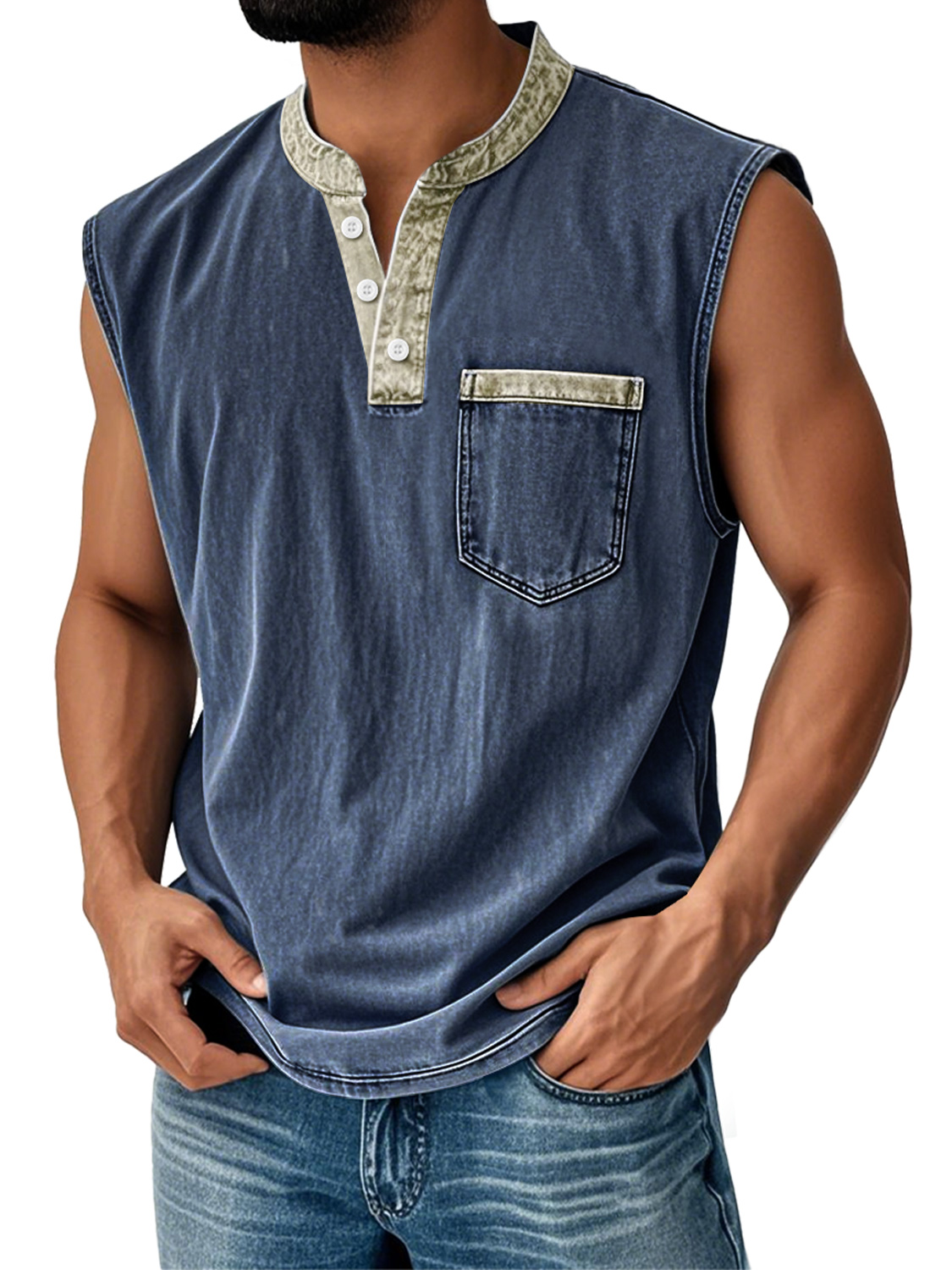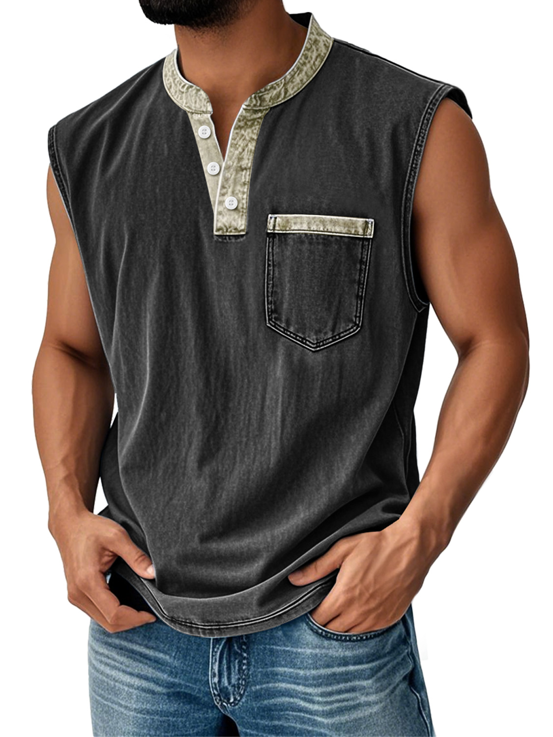 Men's Retro Everyday Colorblock Stand Collar Pocket Casual Sleeveless Henley Shirt