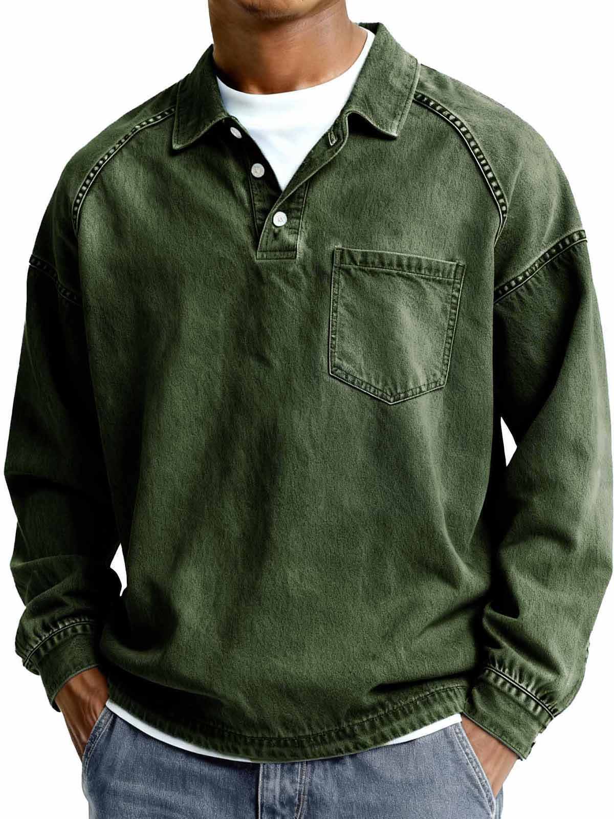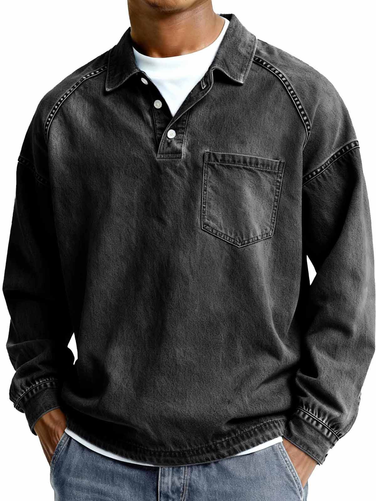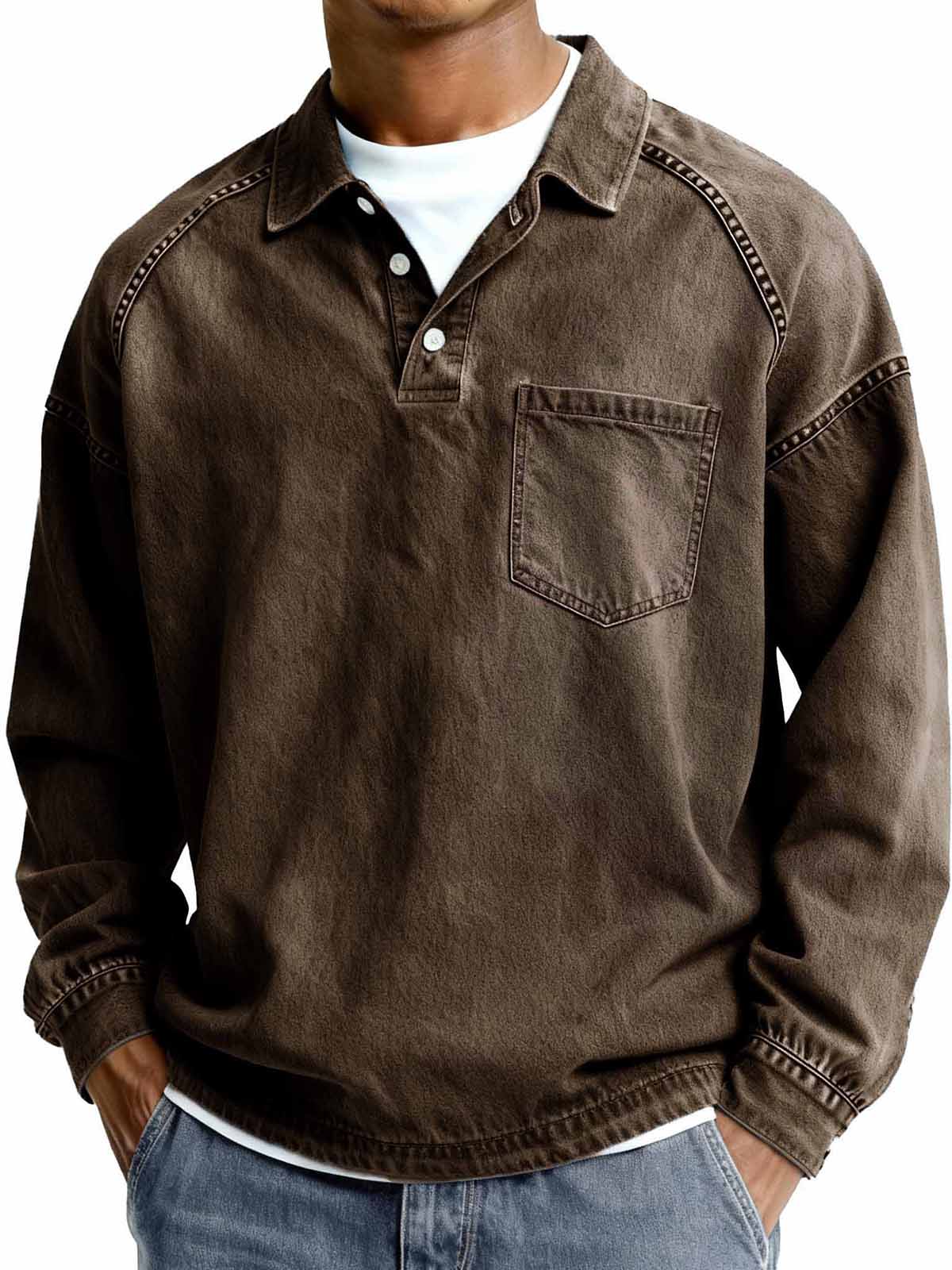 Men's Retro Fashion Distressed Turn-Down Collar Long-Sleeve Loose Polo Shirt