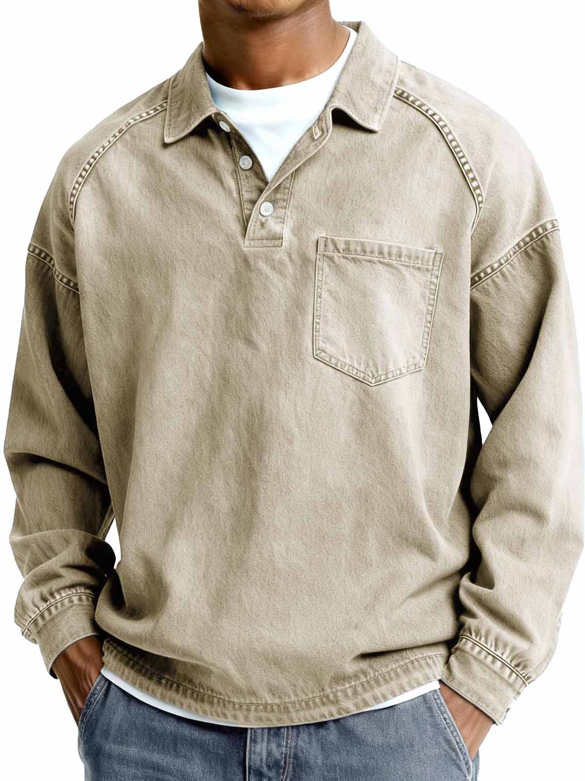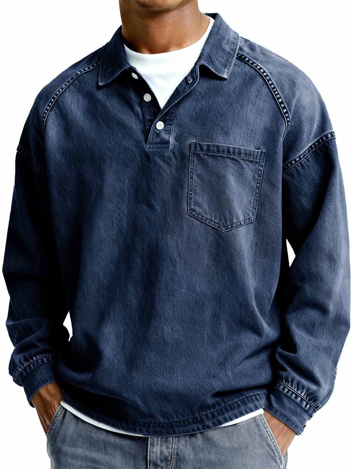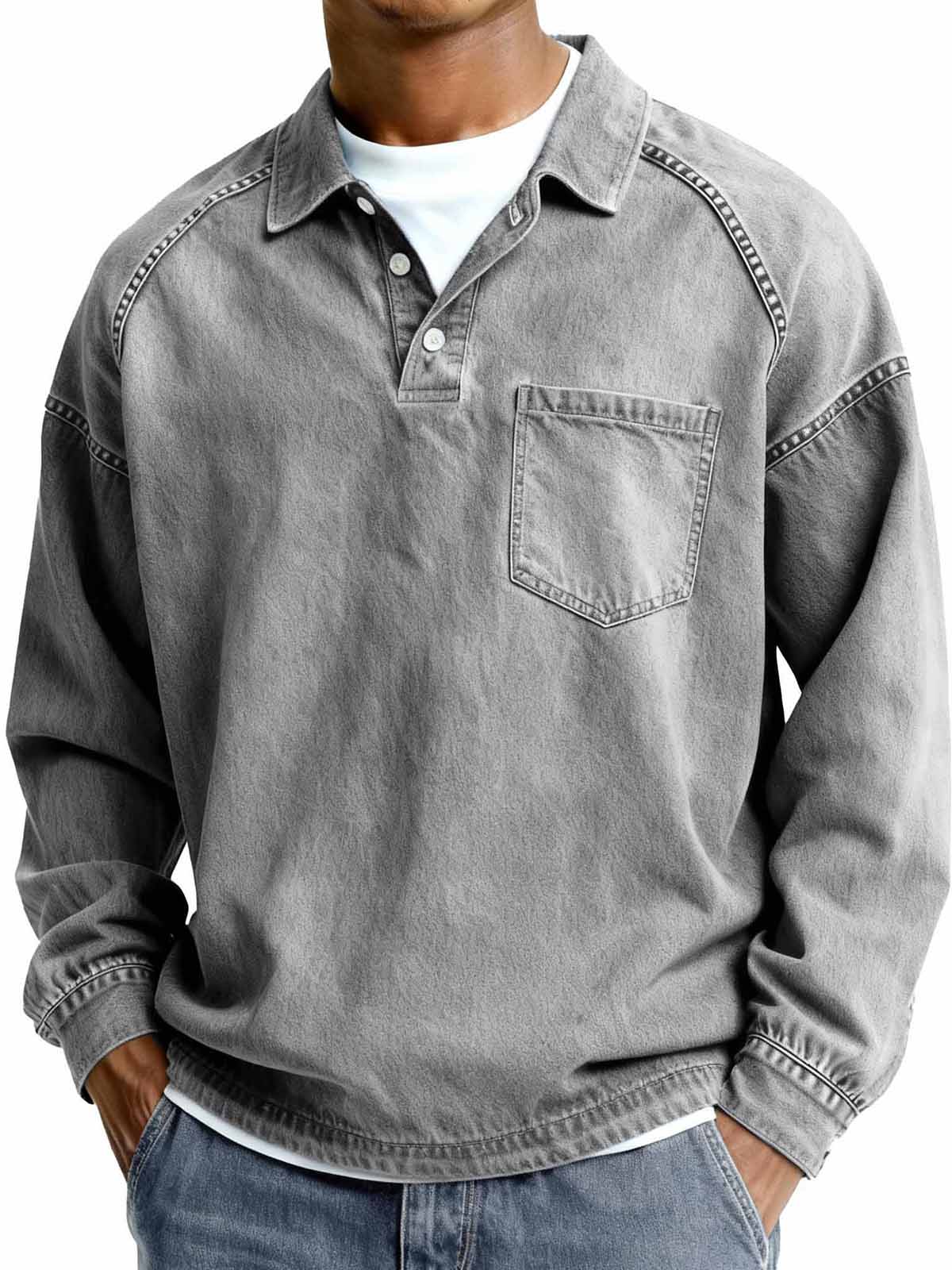 Men's Retro Fashion Distressed Turn-Down Collar Long-Sleeve Loose Polo Shirt