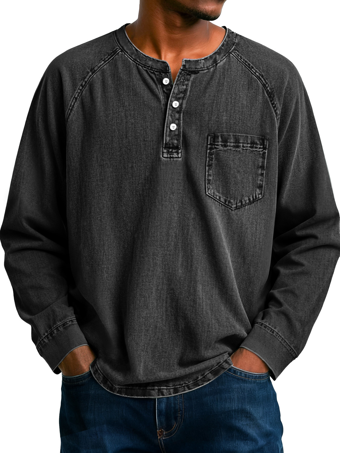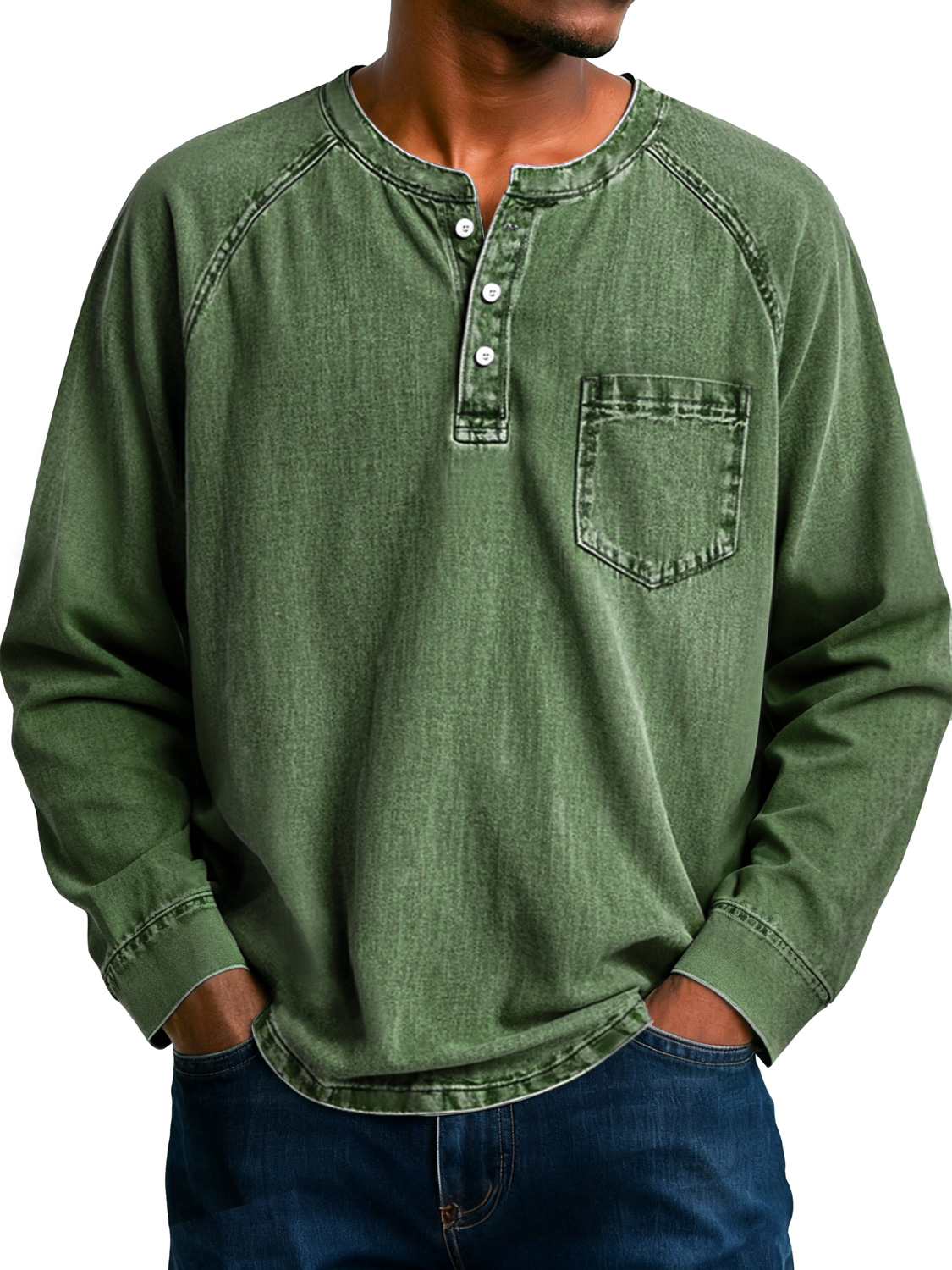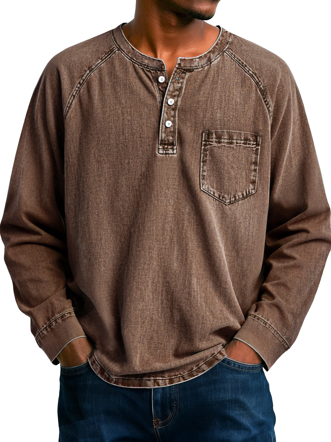 Men's Retro Raglan Pocket Casual Long-Sleeve Henley Shirt