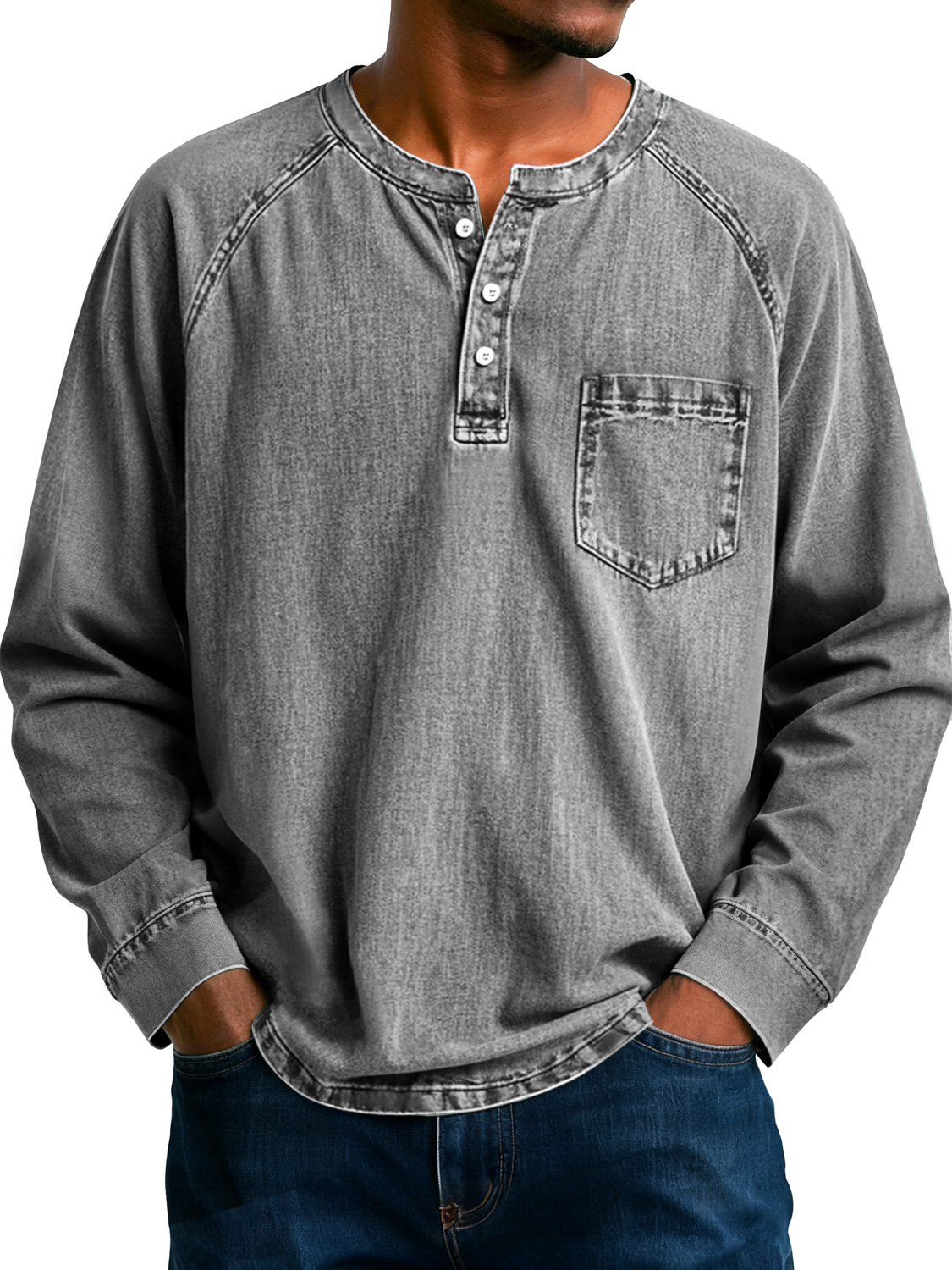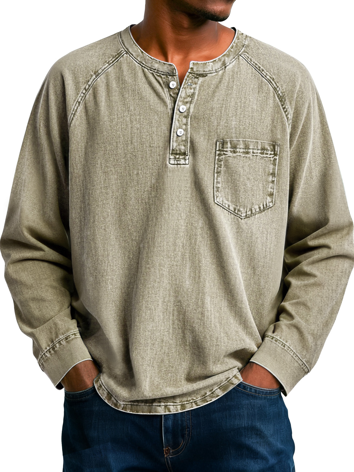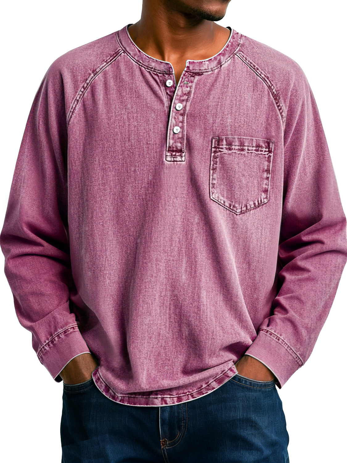 Men's Retro Raglan Pocket Casual Long-Sleeve Henley Shirt
