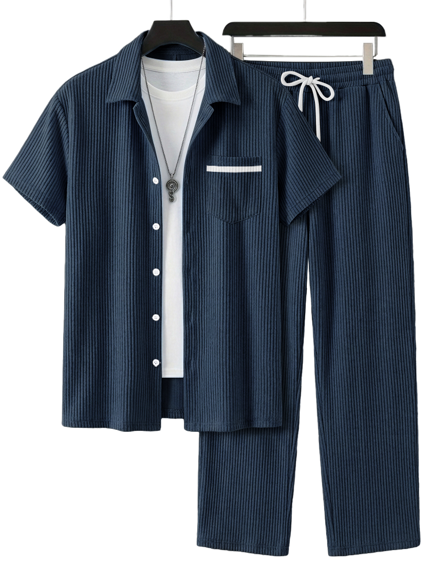 Men's Simple Casual Ribbed Pocket Short-Sleeved Shirt and Casual Pants Set OOTD