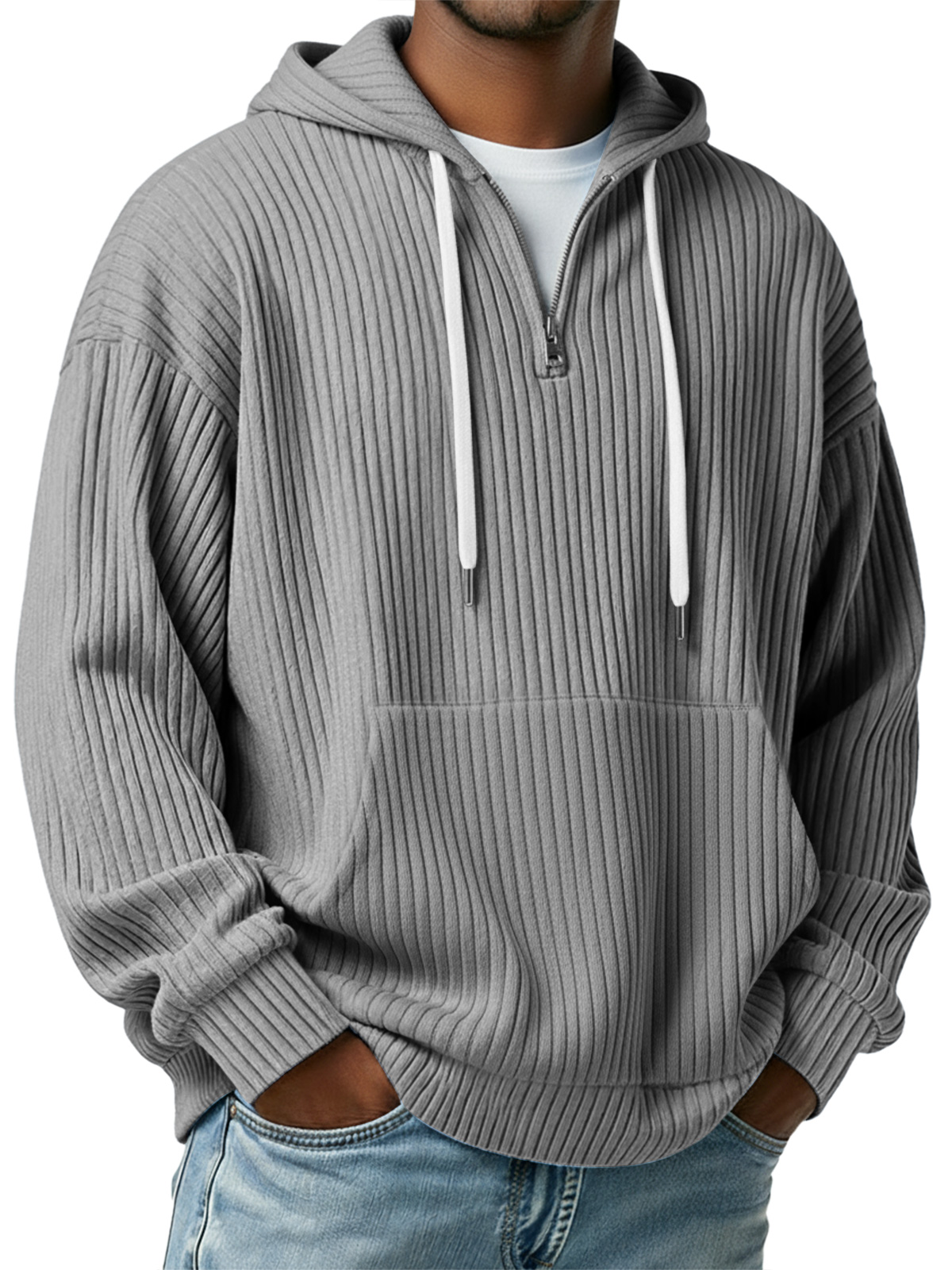 Men's Simple Ribbed Hooded Zipper Casual Loose Sweatshirt