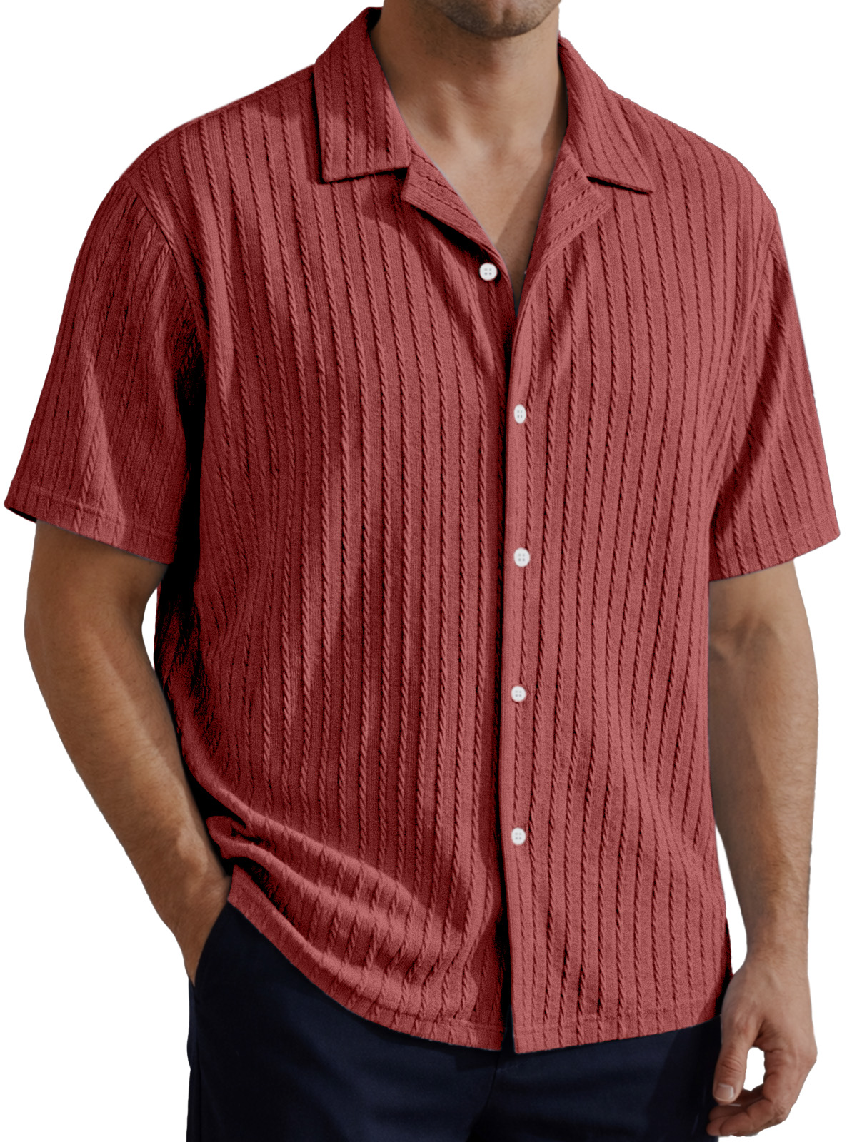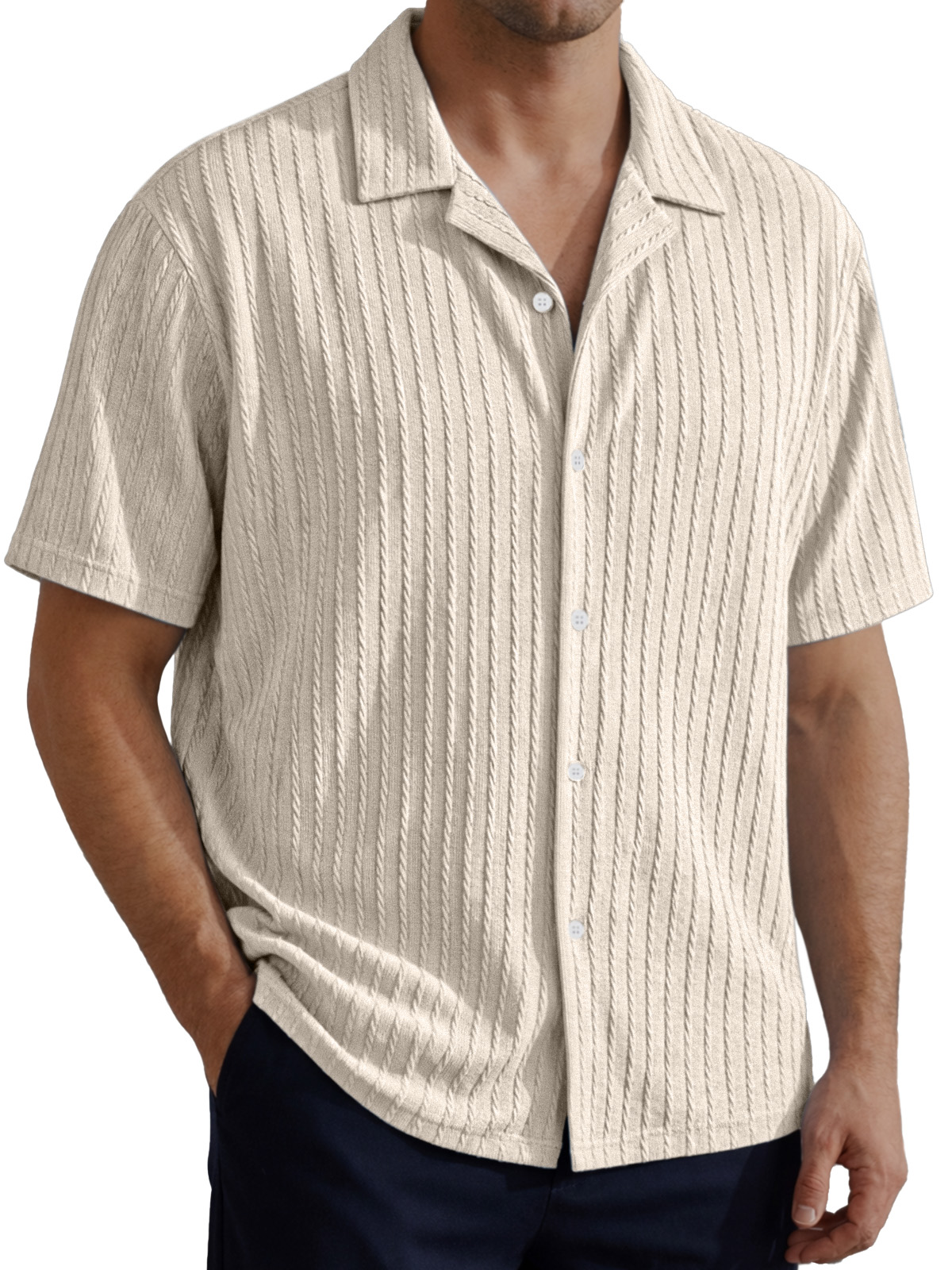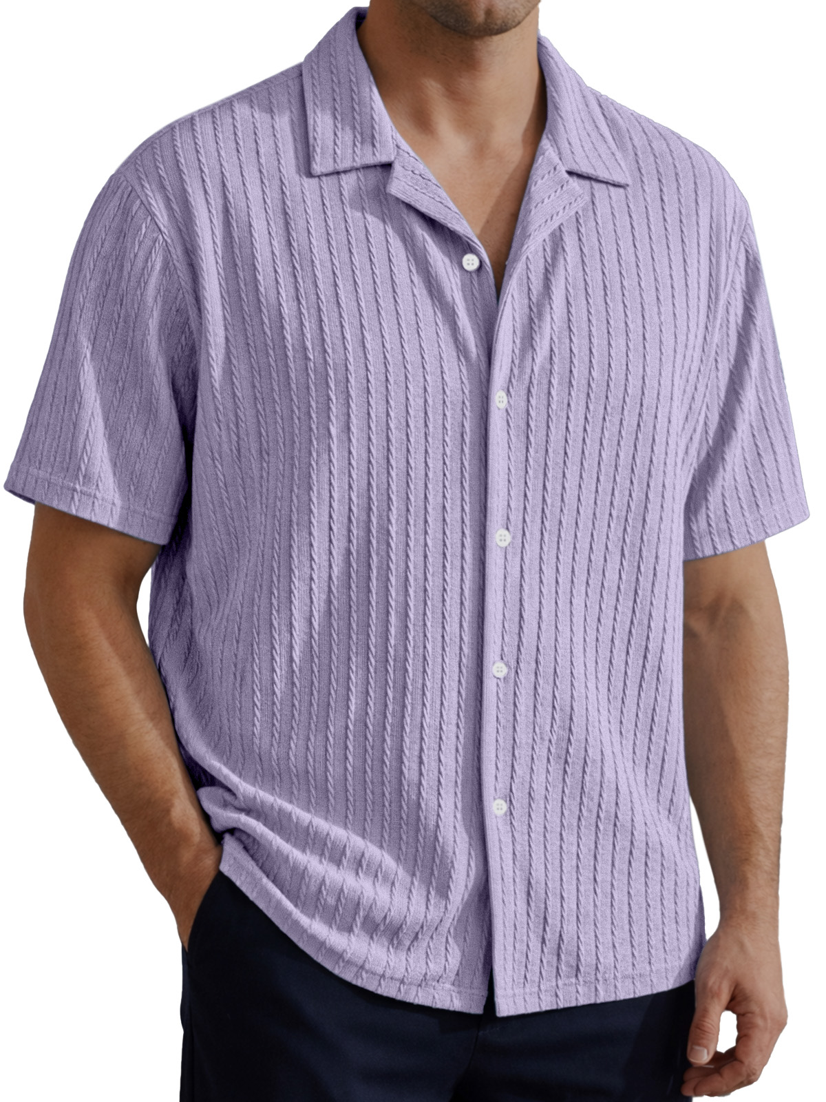 Men's Simple Solid Color Cable Knit Textured Short-Sleeve Collared Shirt