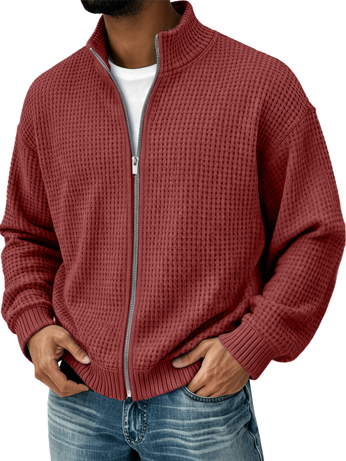 Men's Simple Stand Collar Waffle Casual Zip-Up Jacket