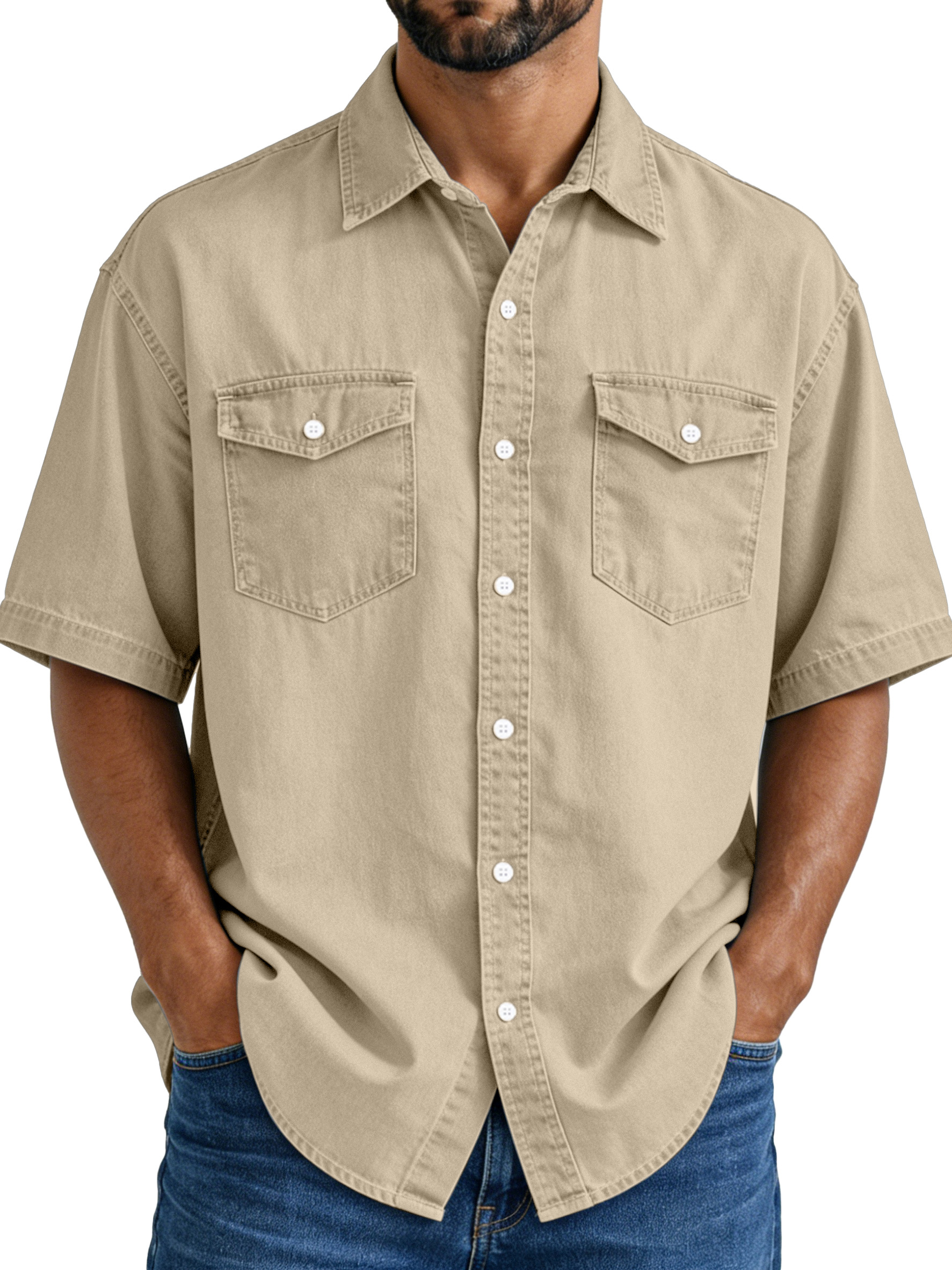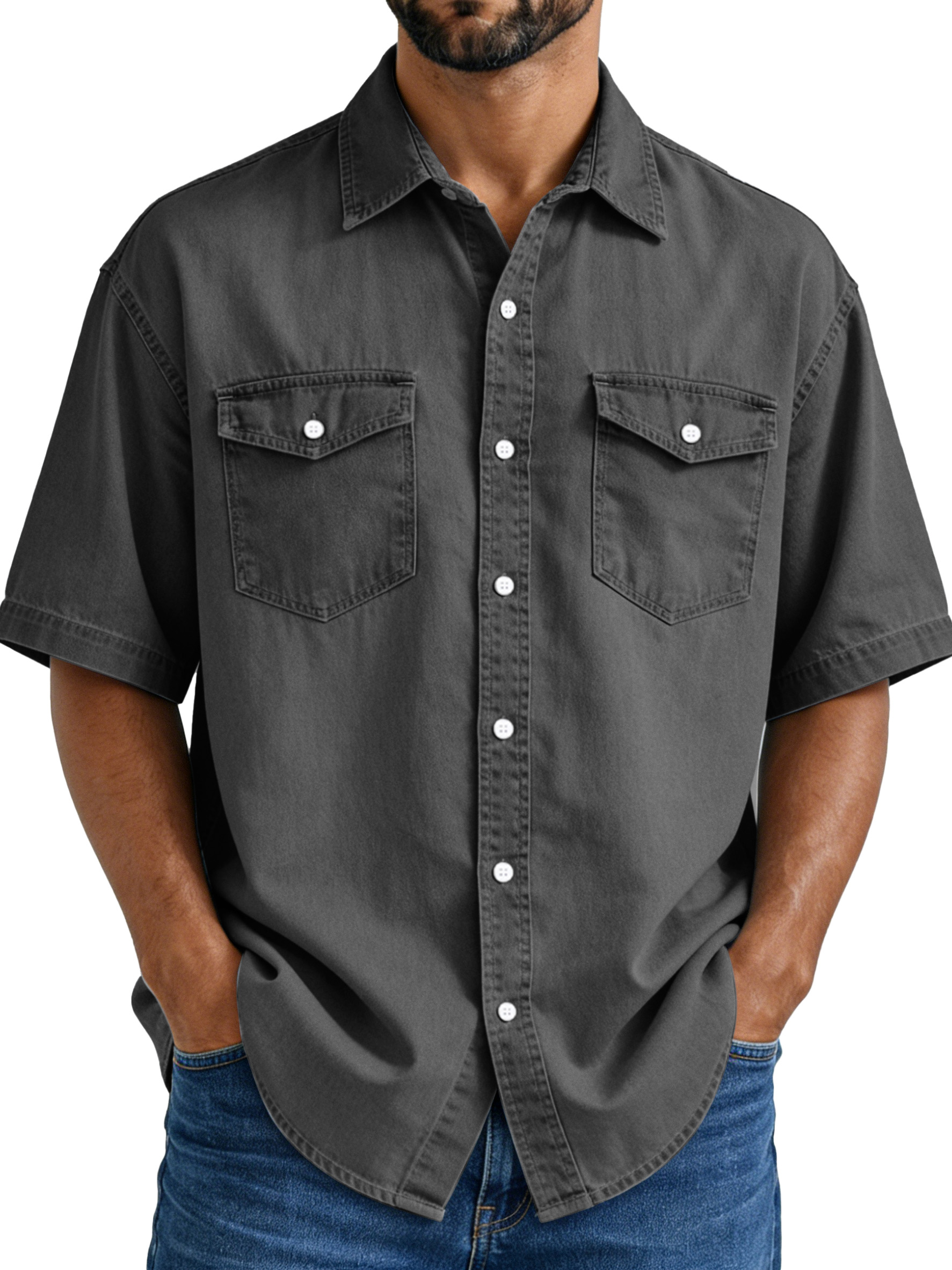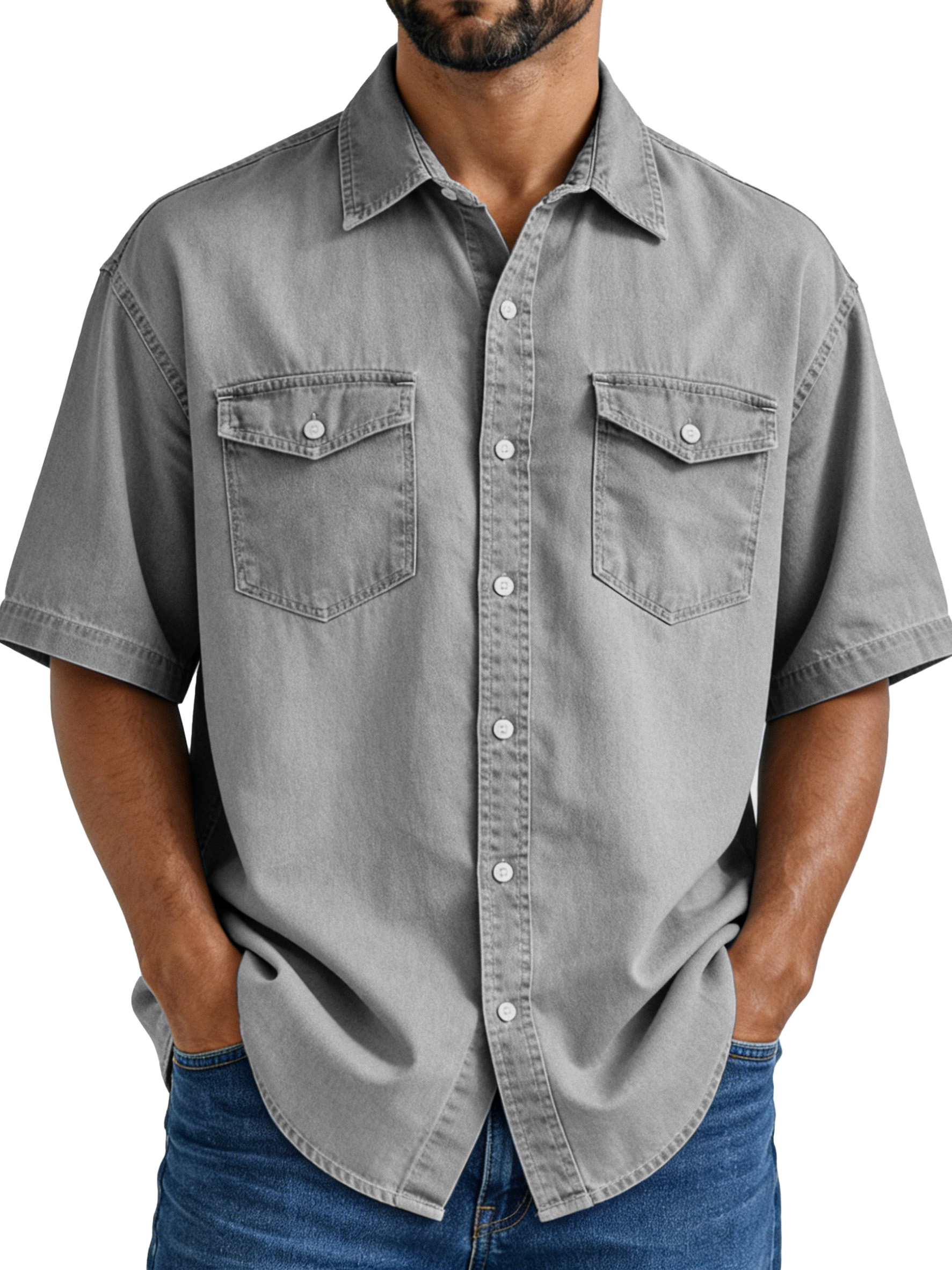 Men's Simple Vintage Double-pocket Lapel Button-down Short-sleeved Shirt
