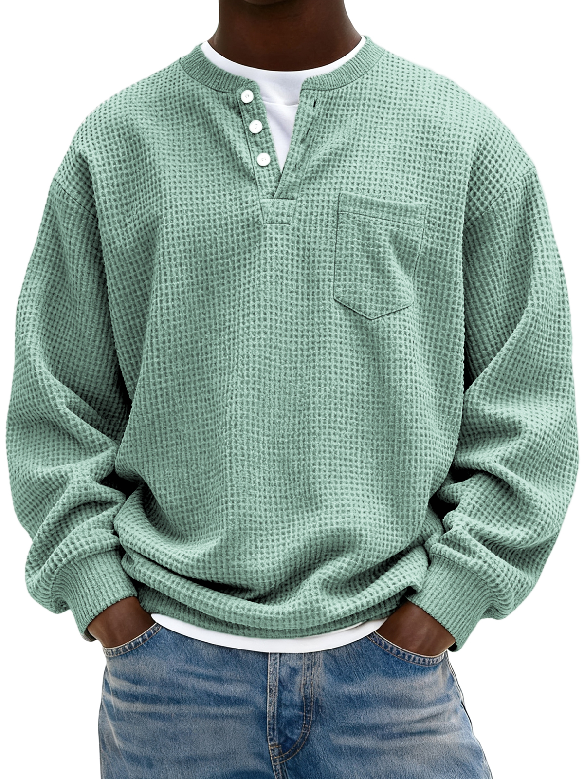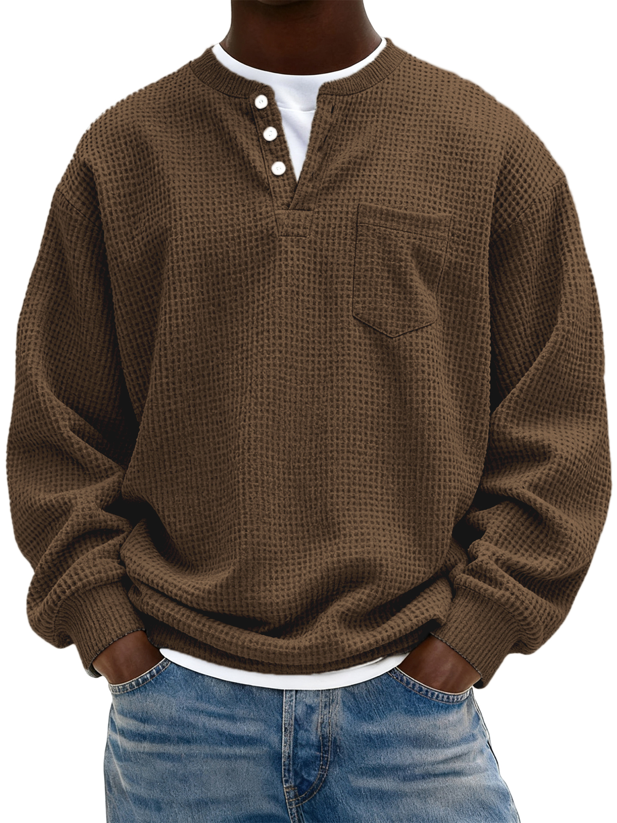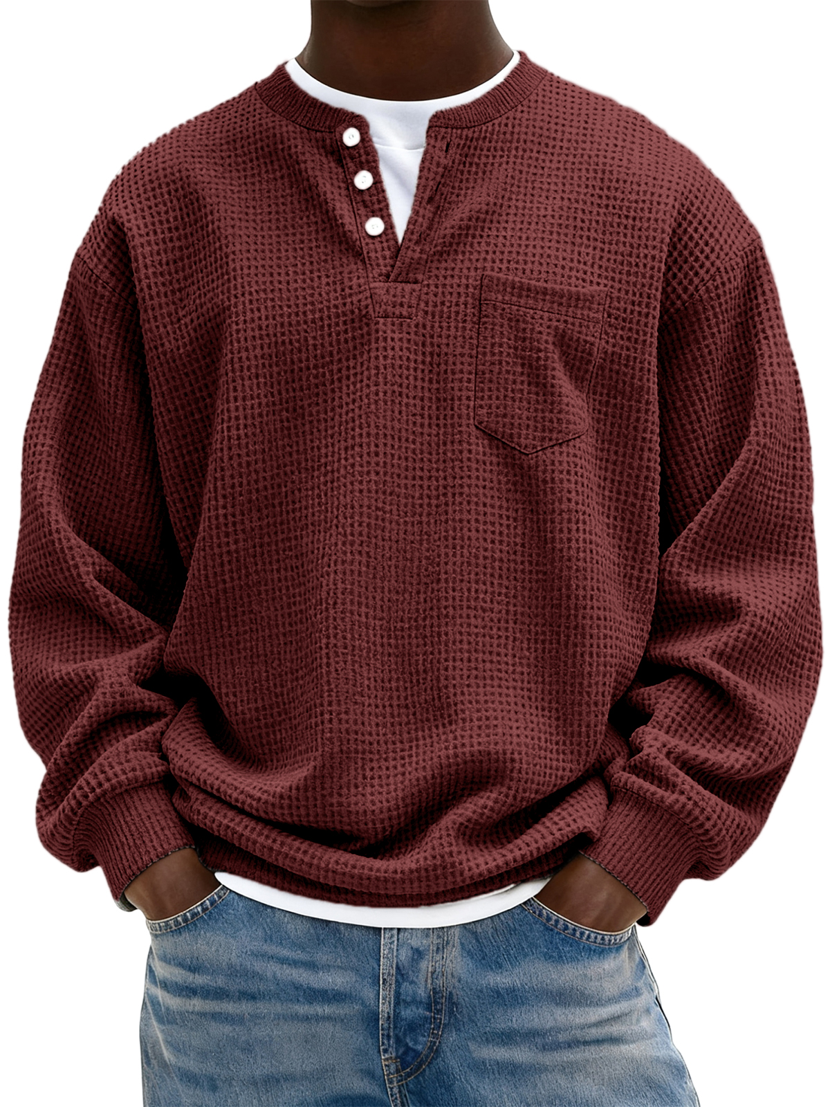 Men's Simple Waffle Henley Pullover with Chest Pocket