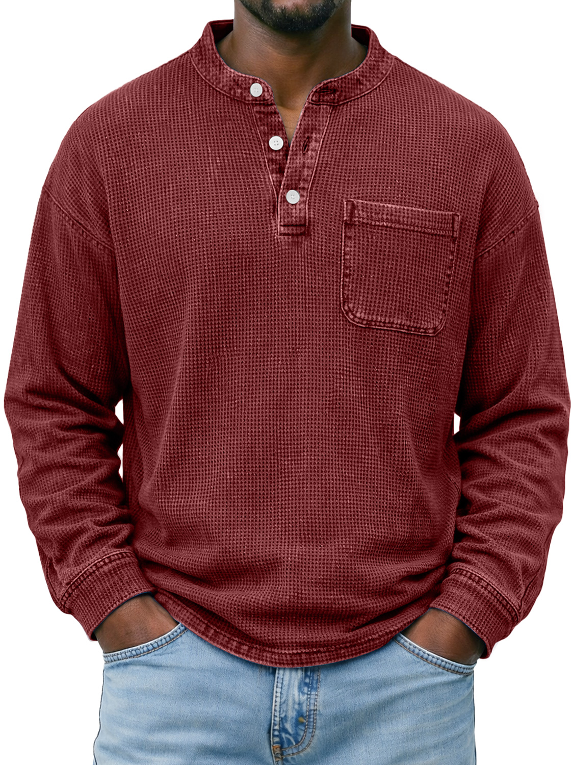 Men's Simple Waffle-knit Casual Long-sleeved Henley Shirt With Pocket