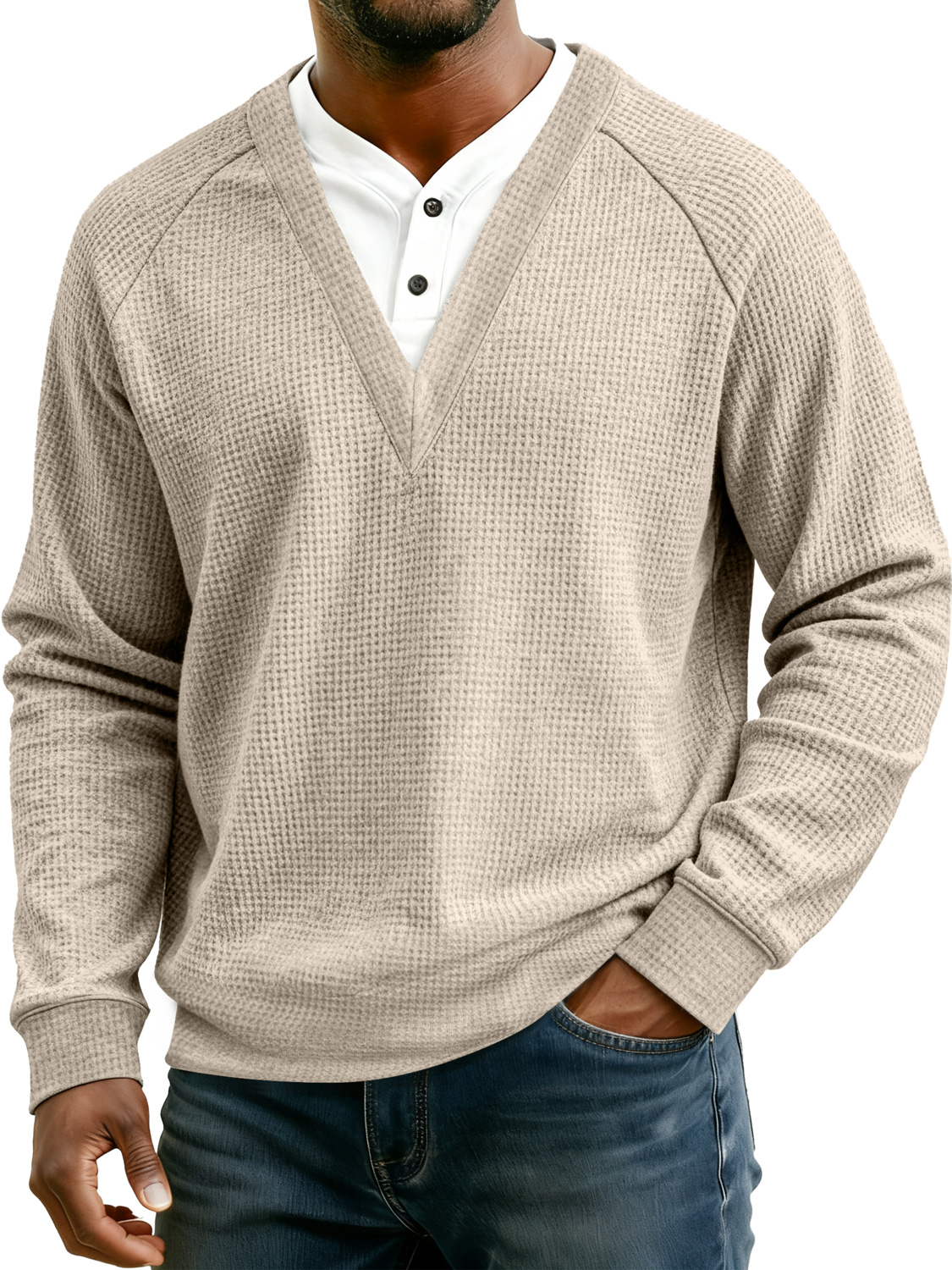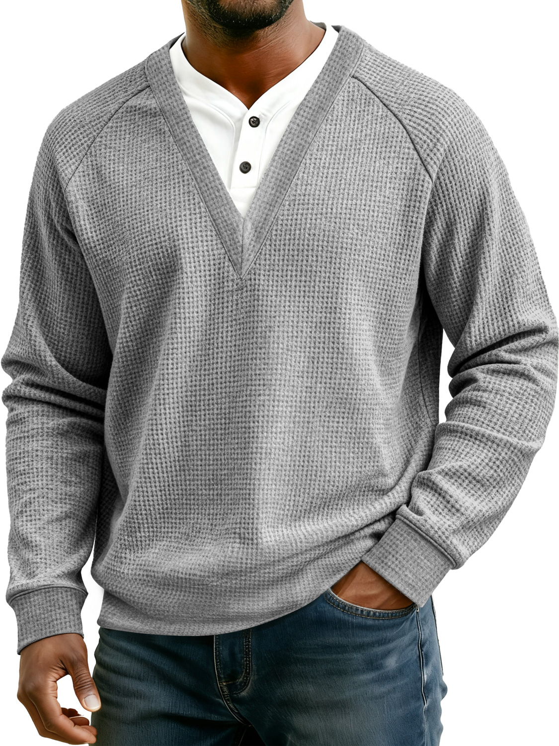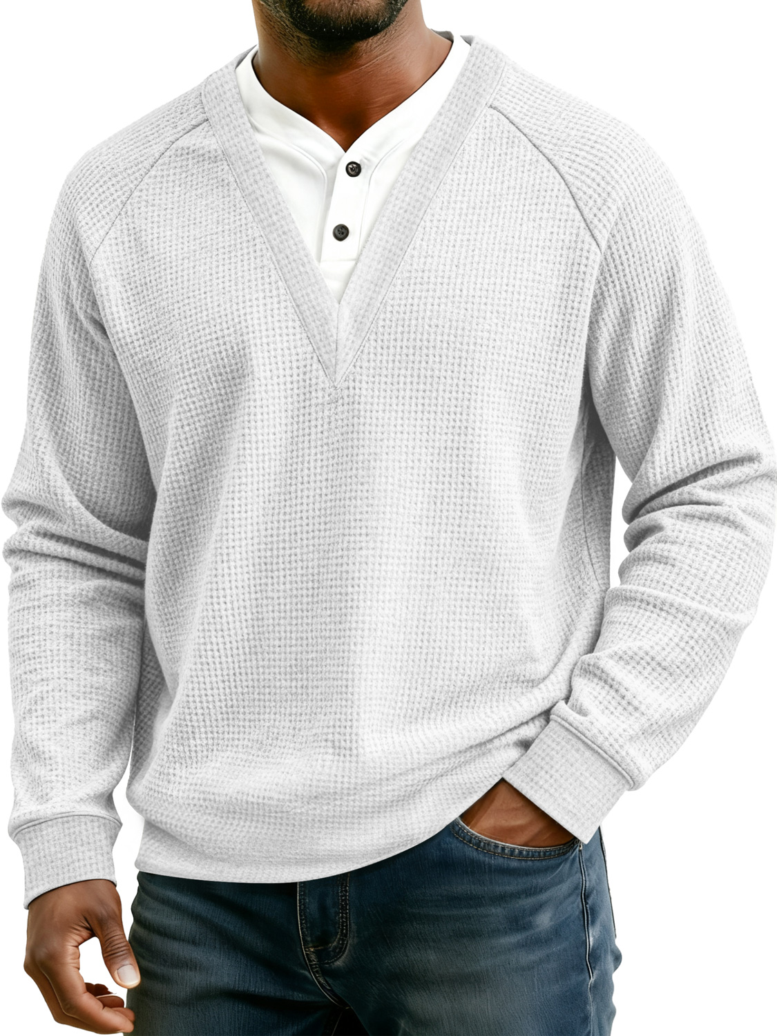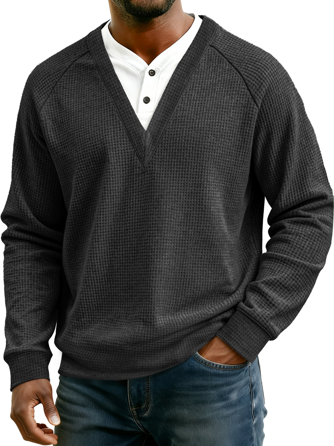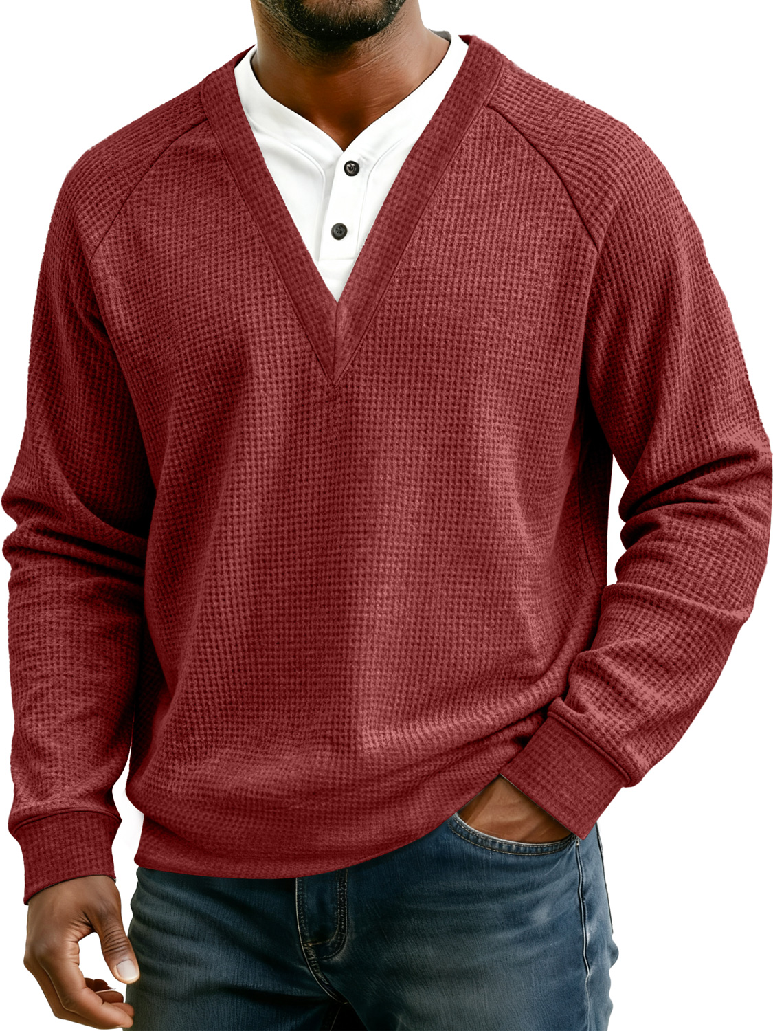 Men's Simple Waffle V-neck Fake Two-piece Casual Long-sleeved T-shirt