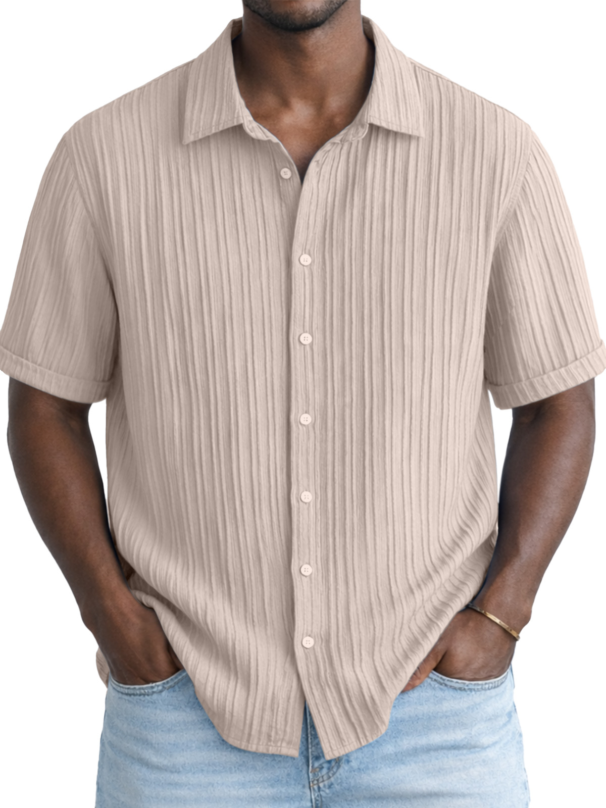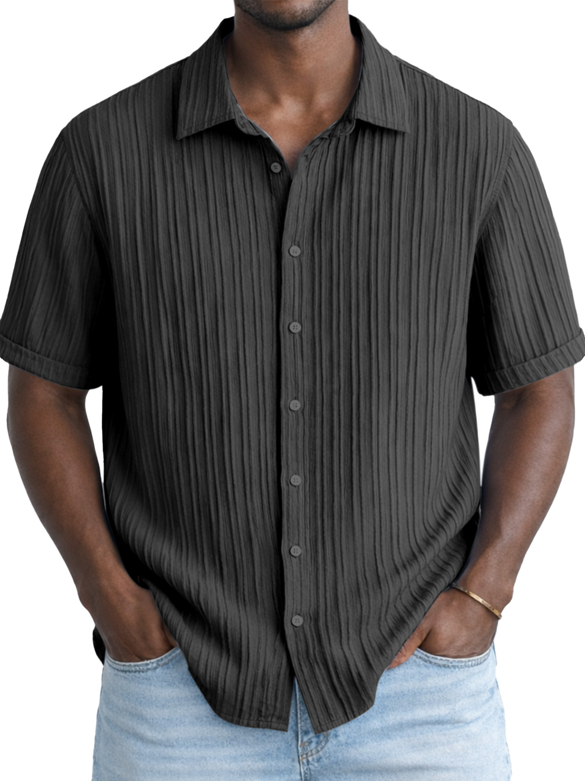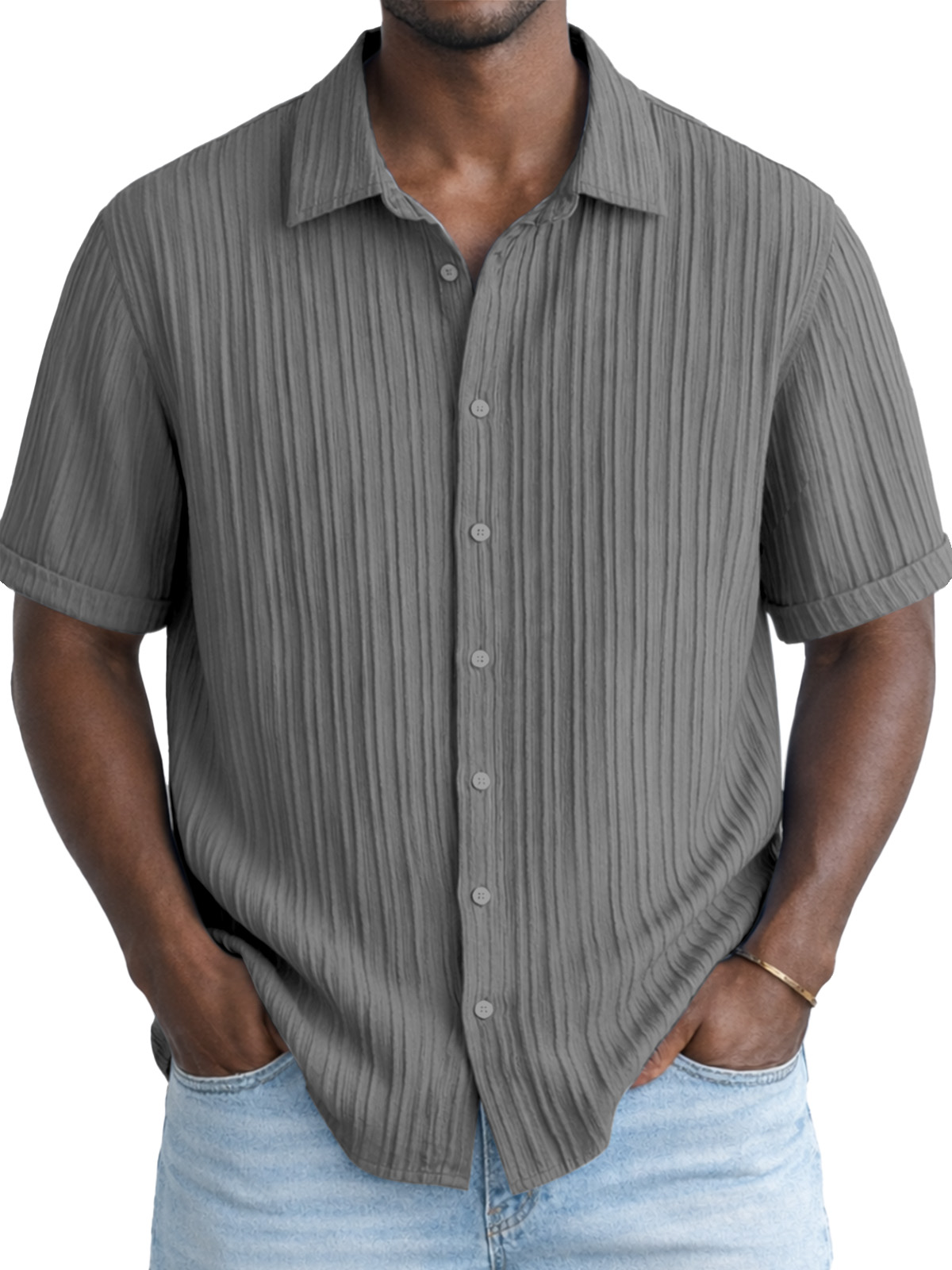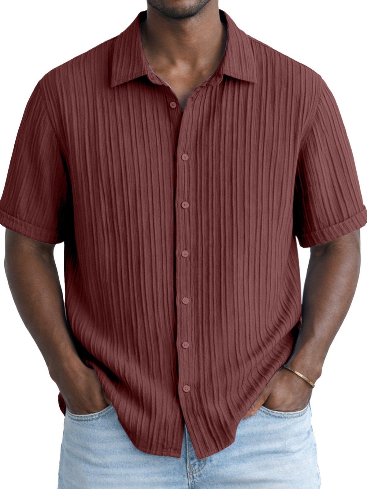 Men's Solid Color Breathable Vertical Stripe Simple Short-Sleeve Shirt