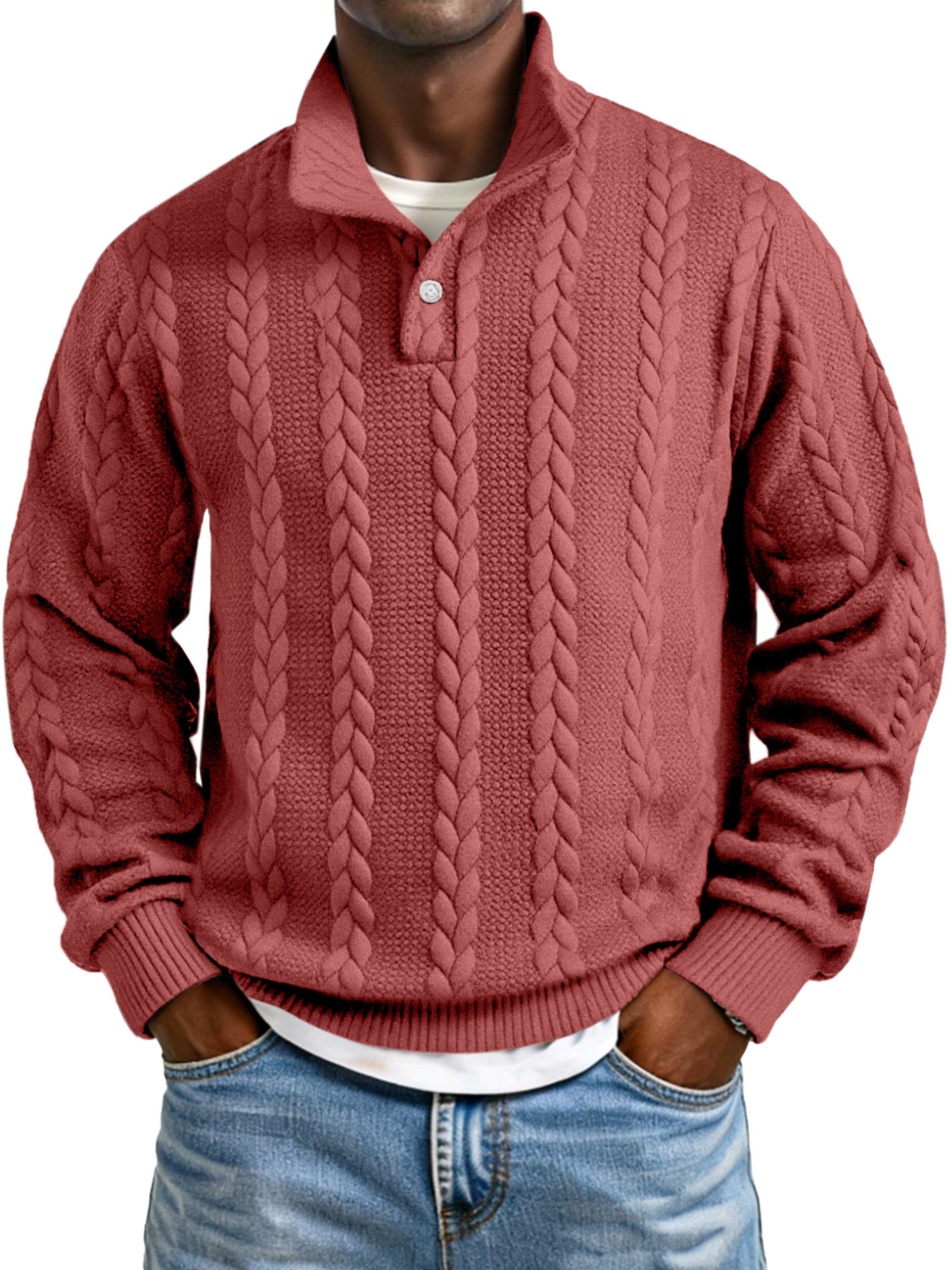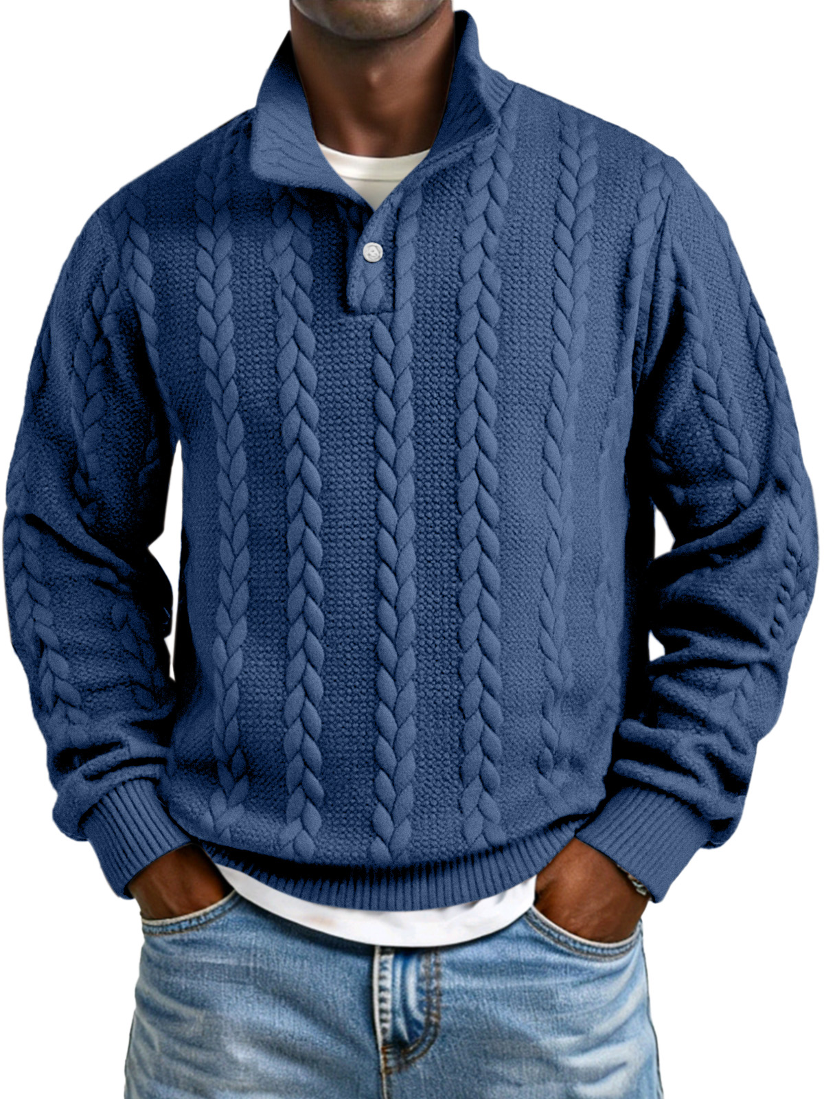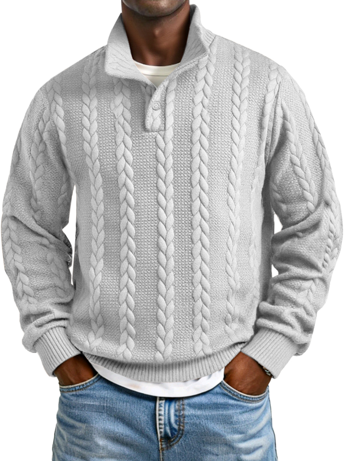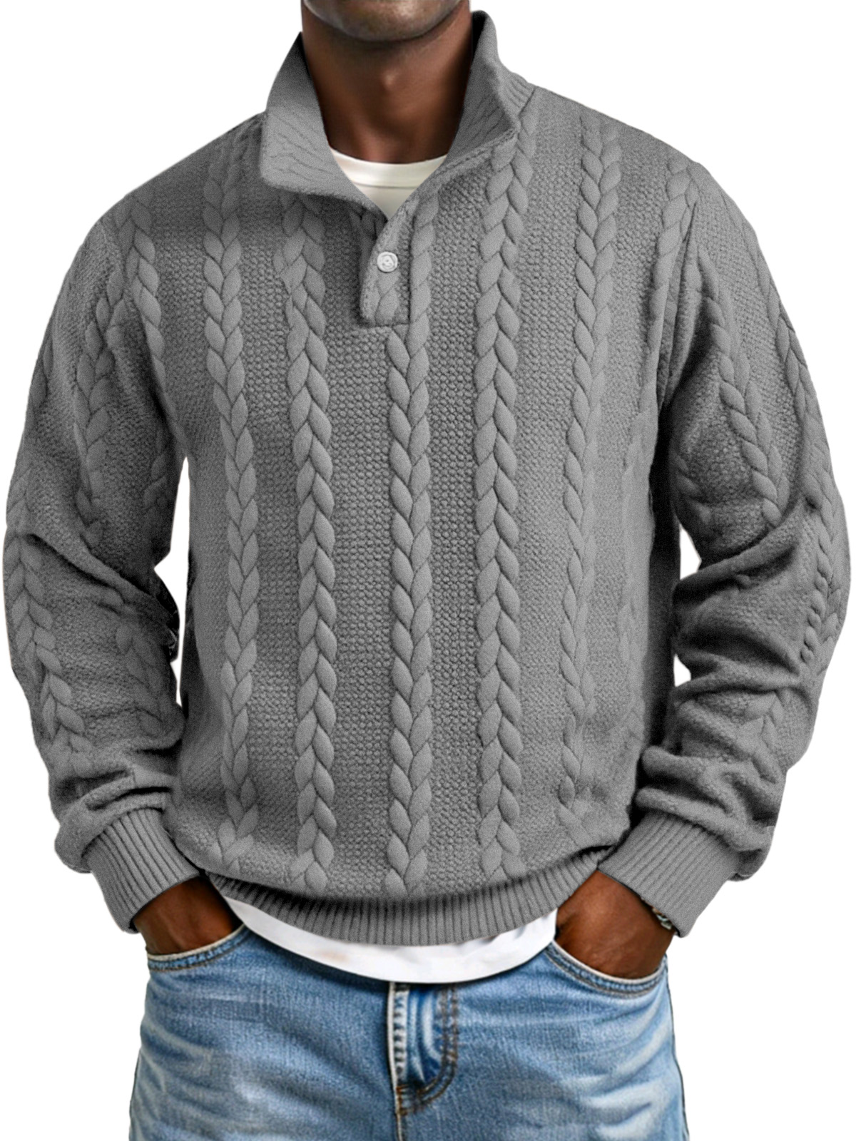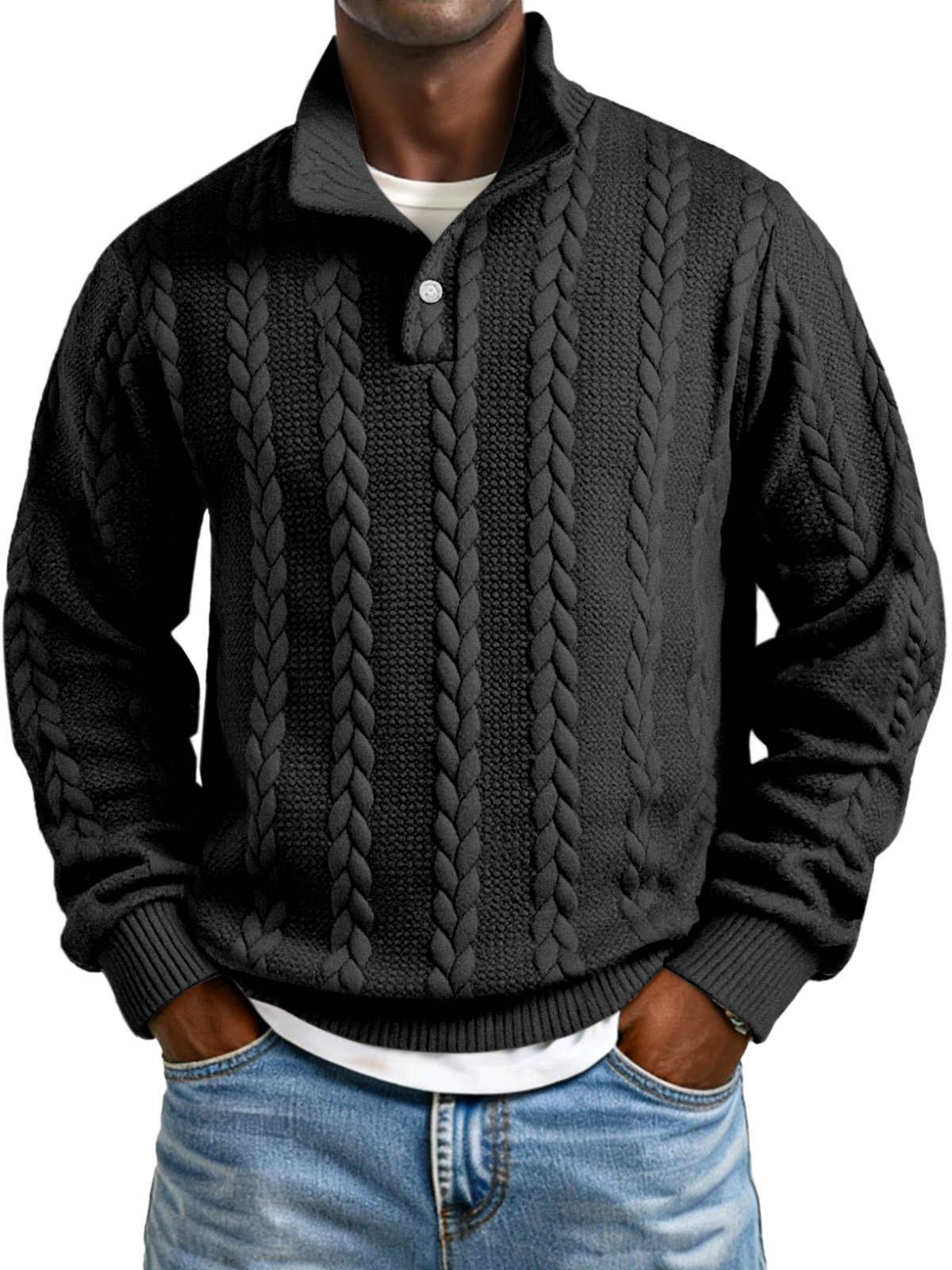 Men's Solid Color Twist Texture Button Collar Long Sleeve Sweatshirt