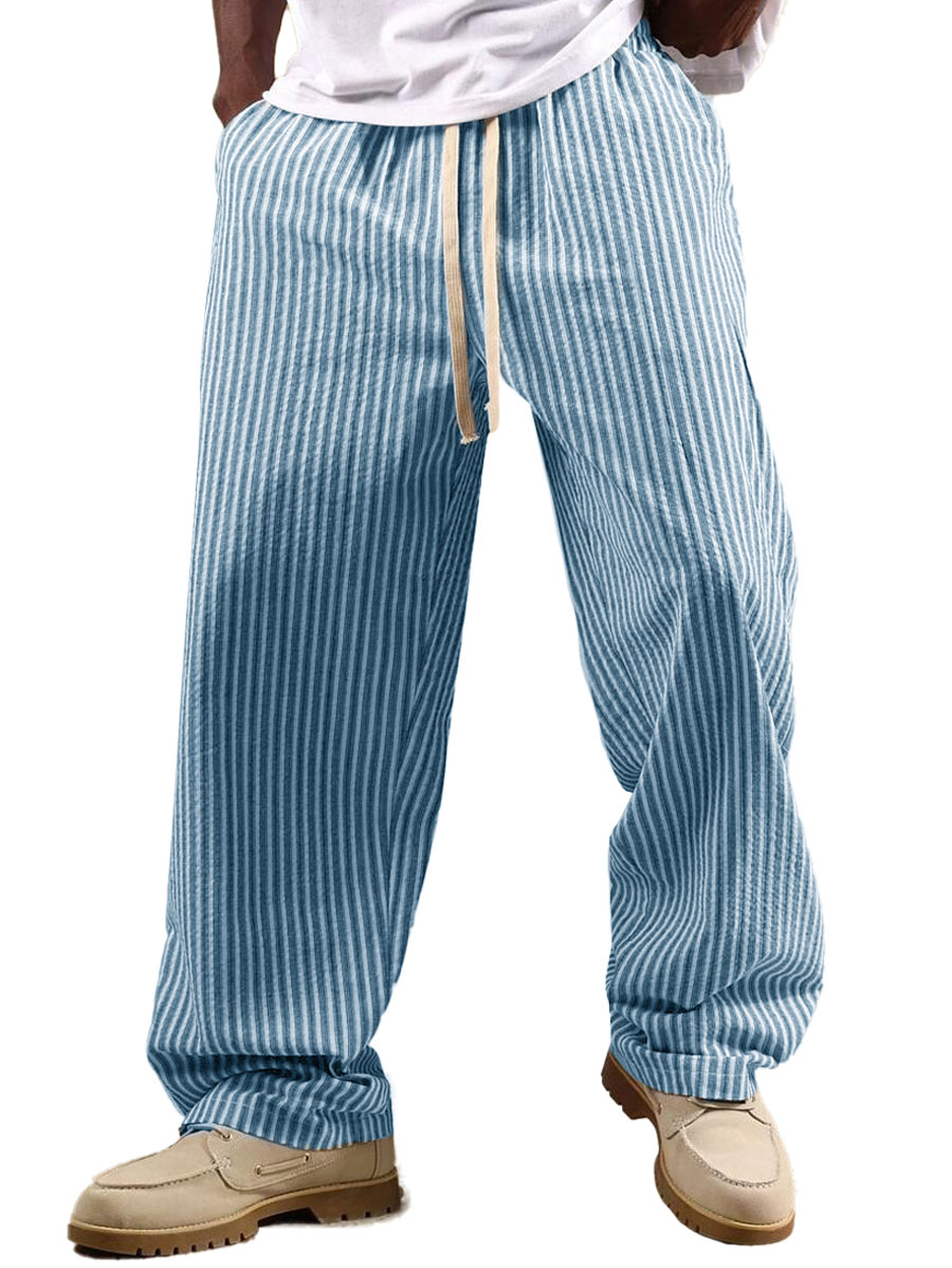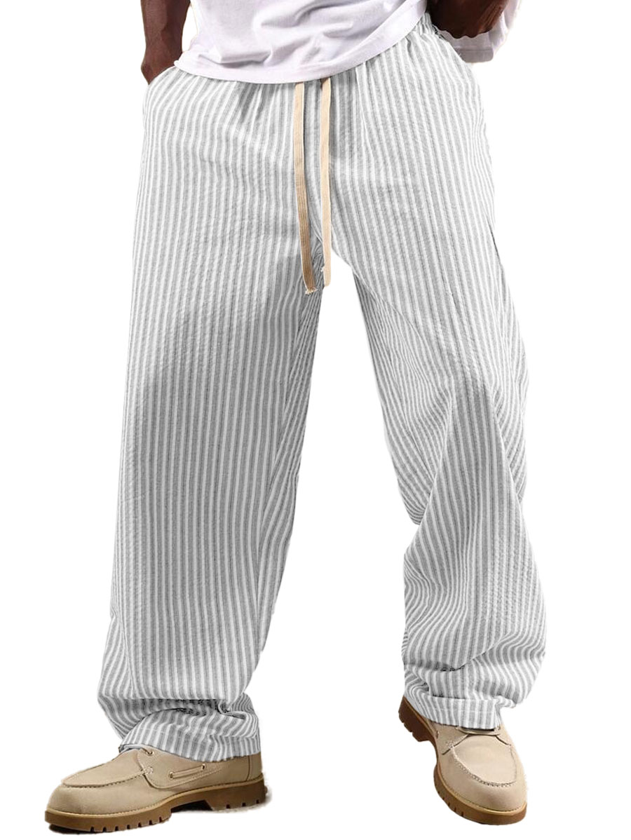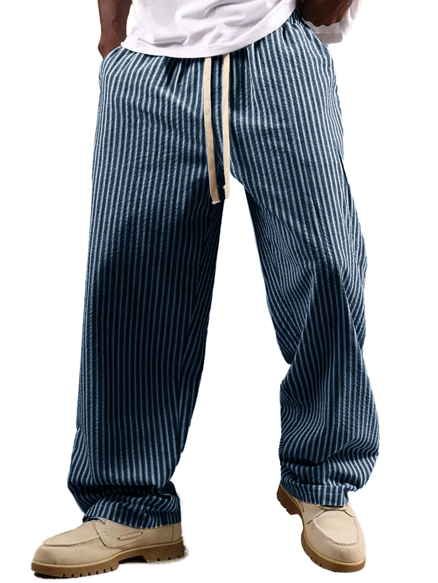 Men's Stylish Casual Loose-fitting Striped Pocket Drawstring Trousers With An Elastic Waistband