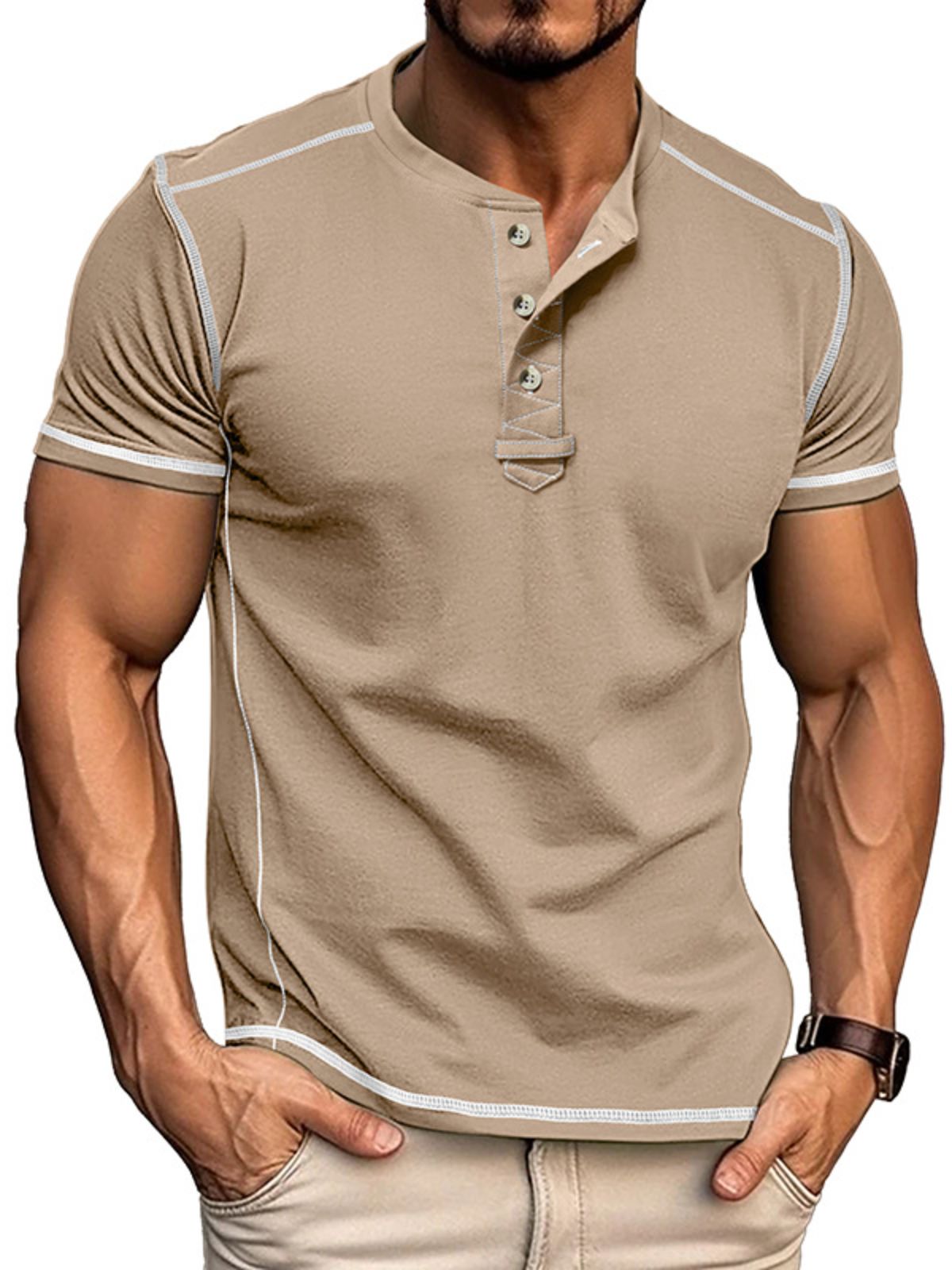 Men's Stylish Top-stitching Design Henley Cotton Crew Neck Top