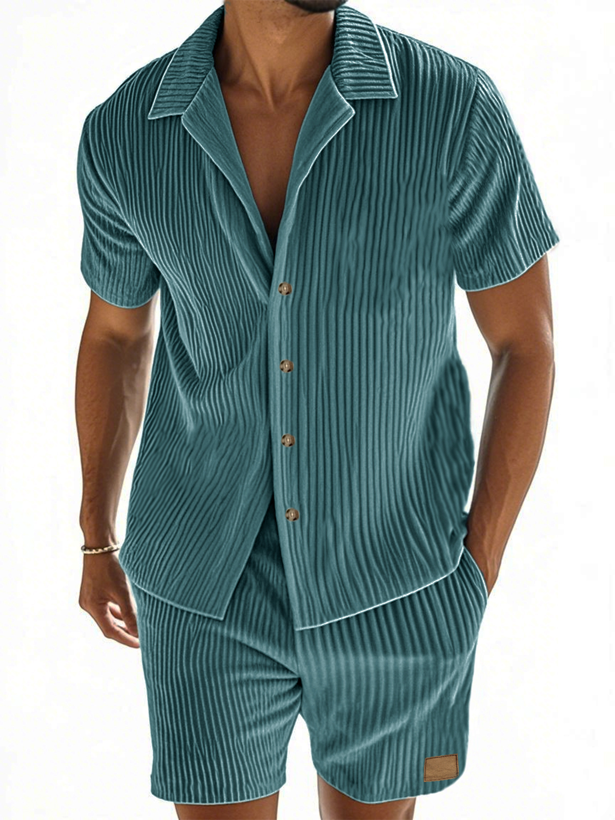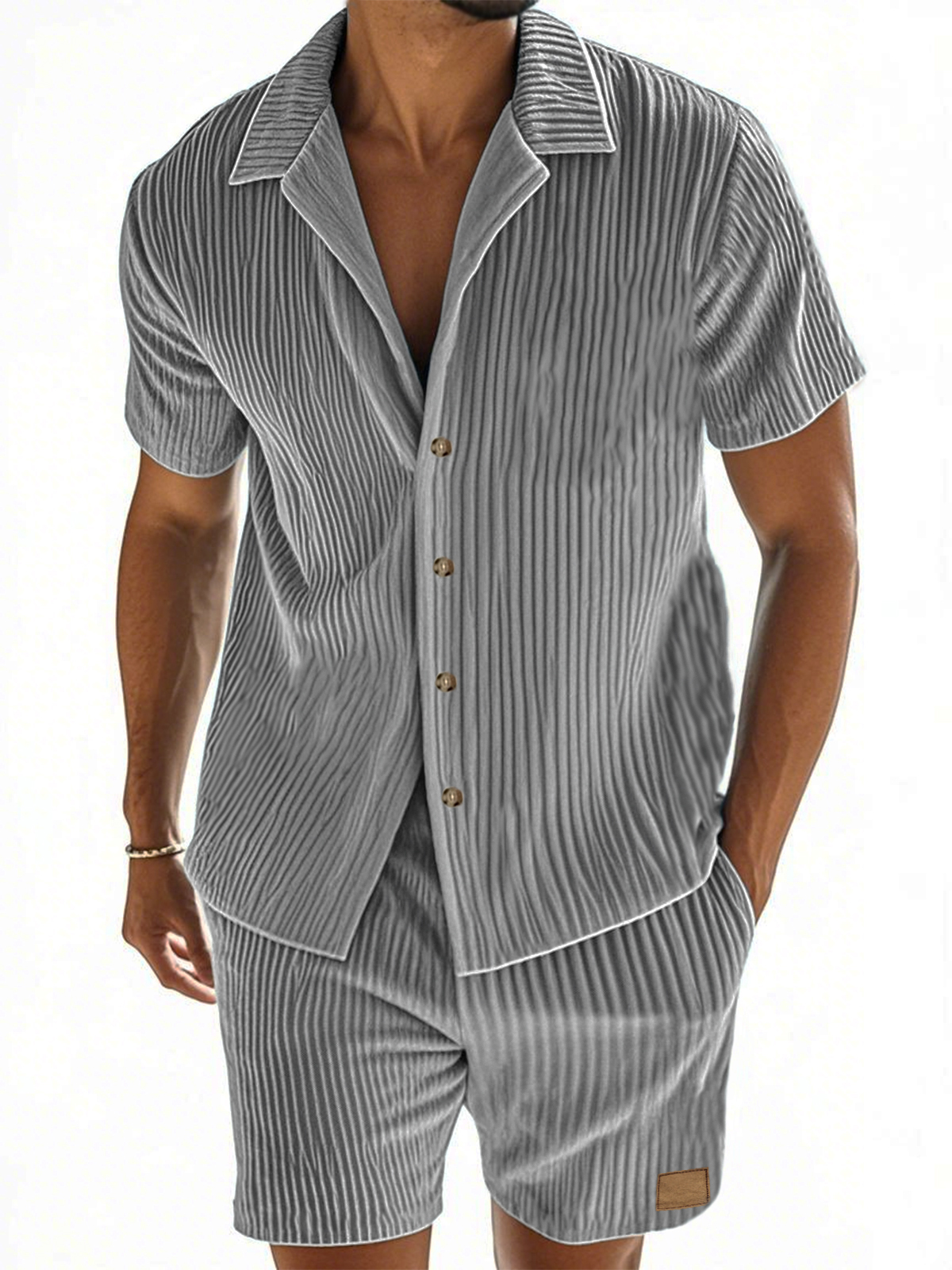 Men's Vertical Striped Texture Casual Short-sleeved Shirt and Shorts Two-piece Suit