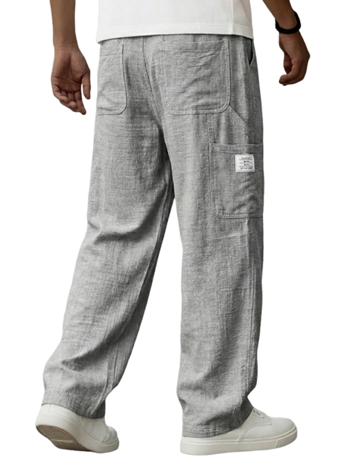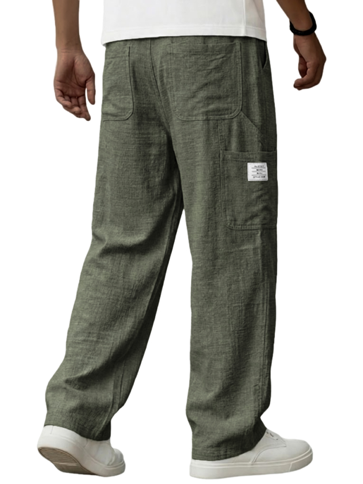 Men's Vintage Breathable Linen Multi-pocket Casual Embroidered Label Trousers