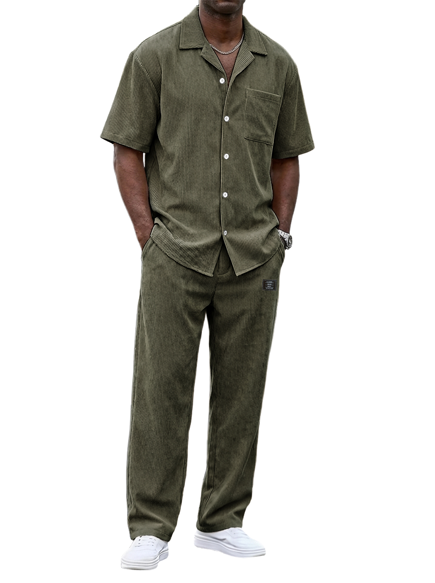 Men's Vintage Corduroy Casual Short-Sleeved Shirt and Loose Straight-Leg Trousers Set