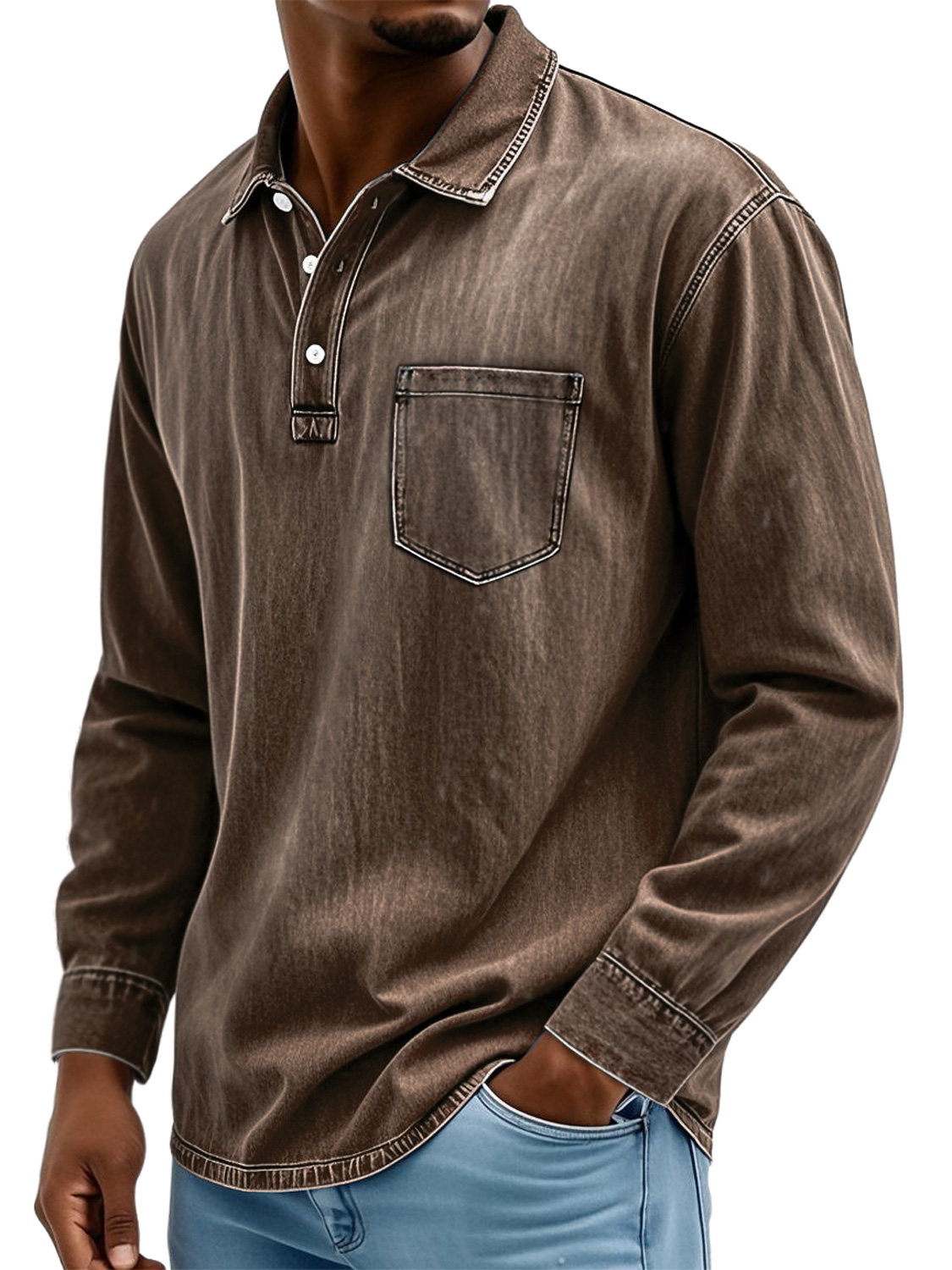 Men's Vintage Cotton Washed Lapel Button Casual Long Sleeve Polo Shirt