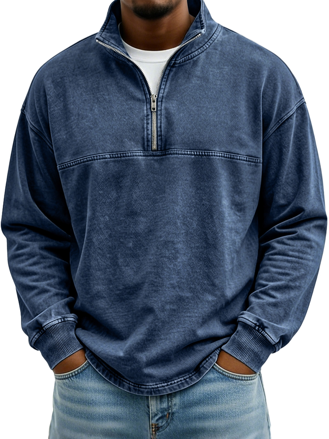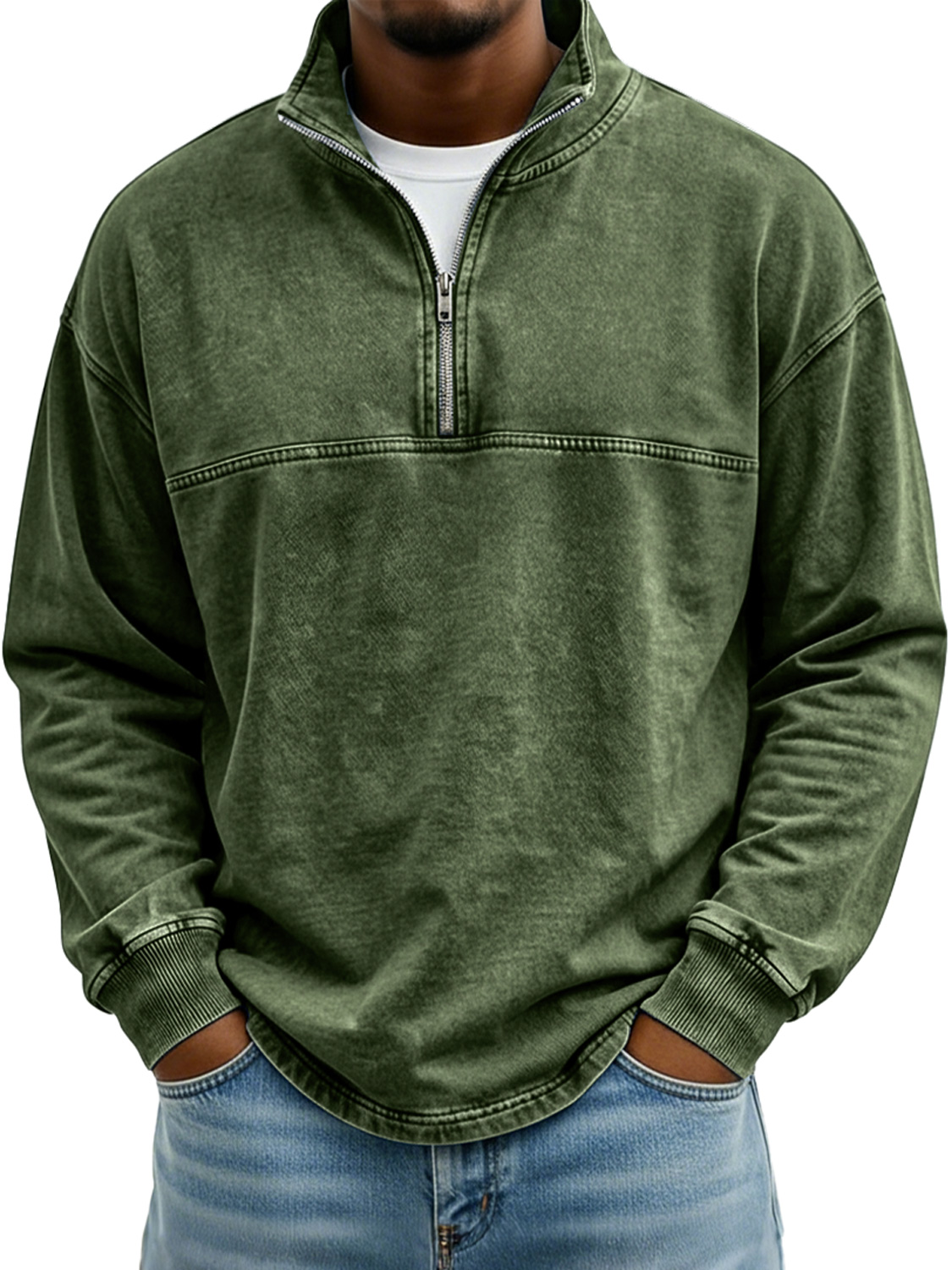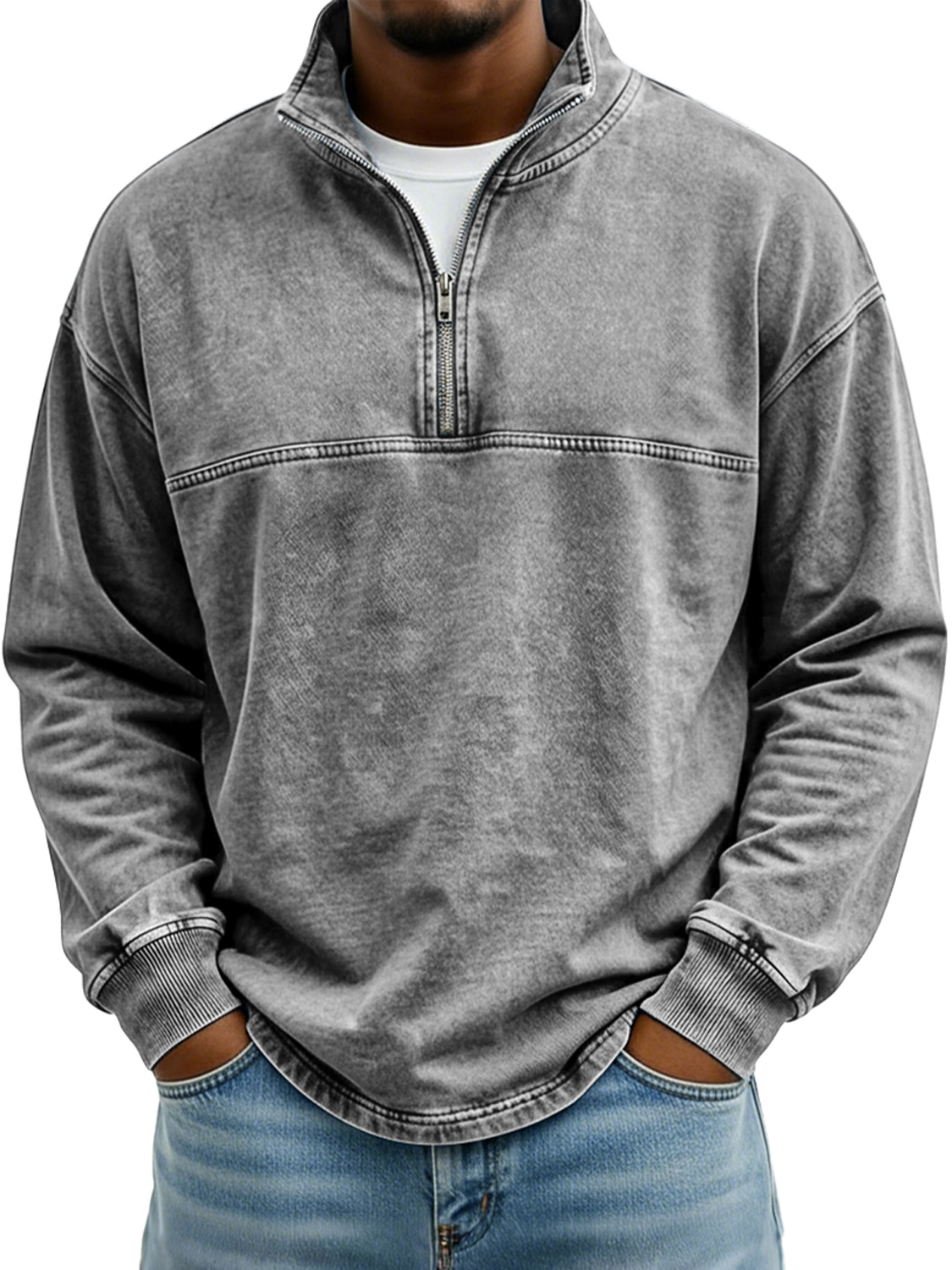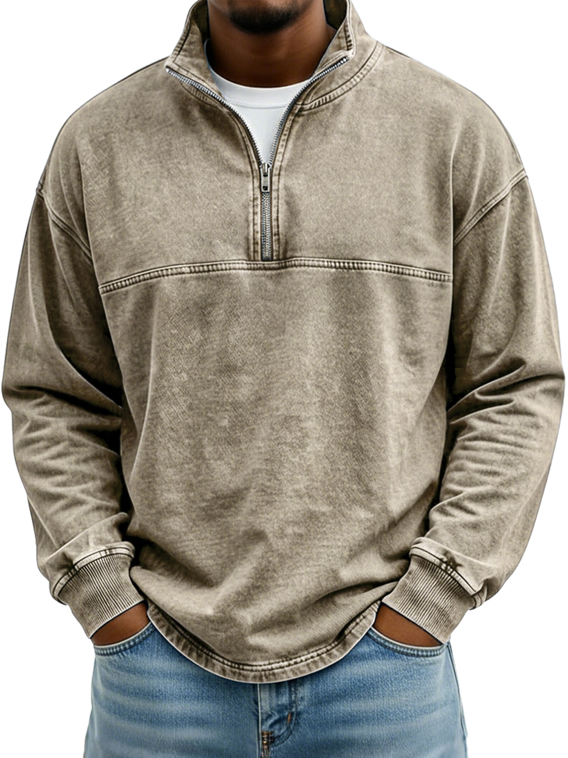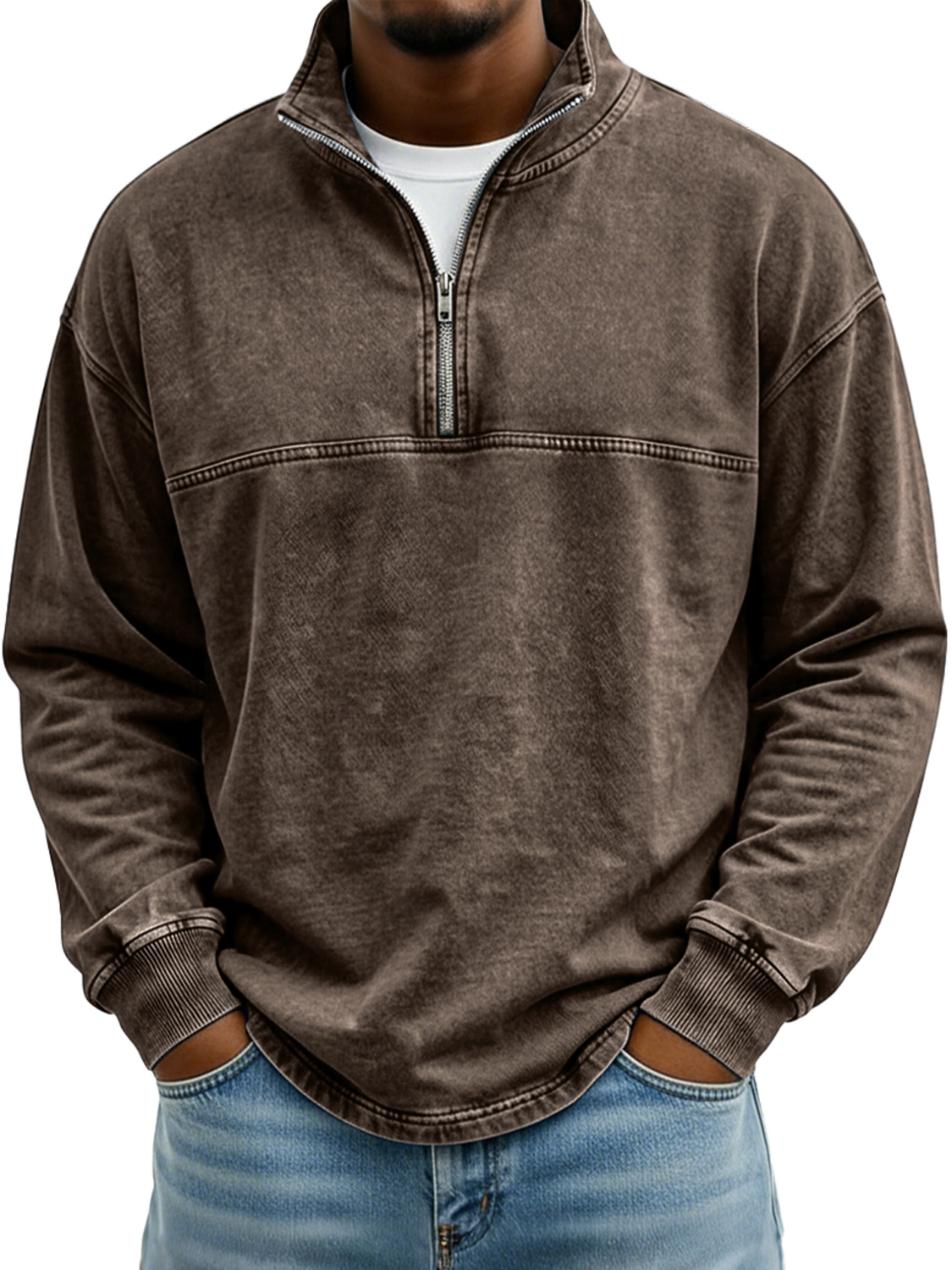 Men's Vintage Stand-collar Long-sleeved T-shirt With Zipper And Contrasting Stitching Design
