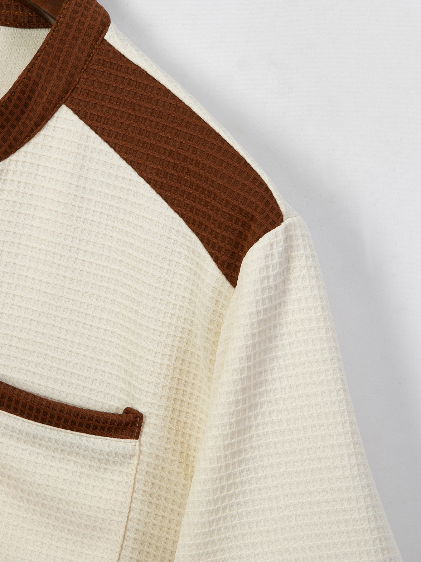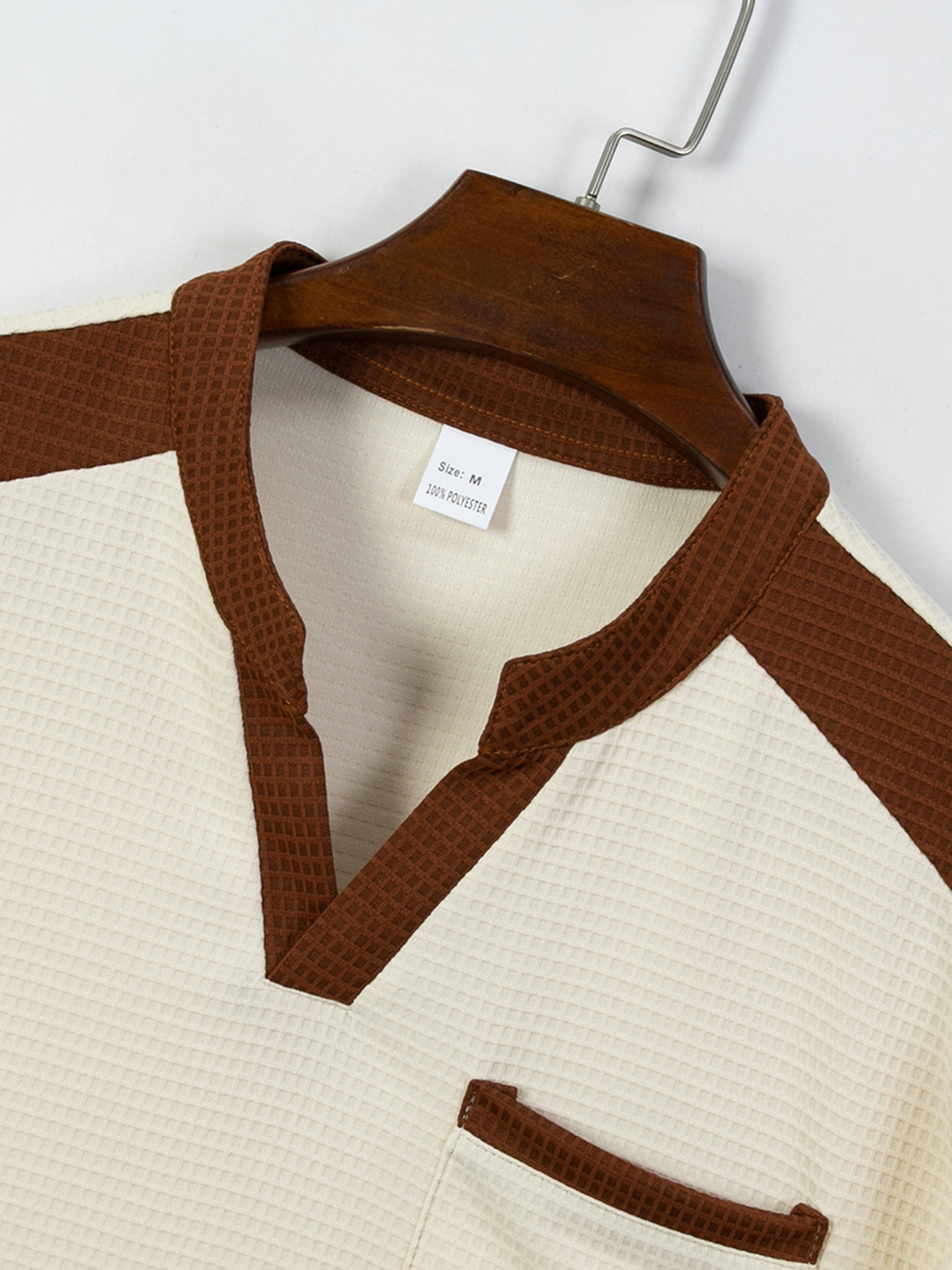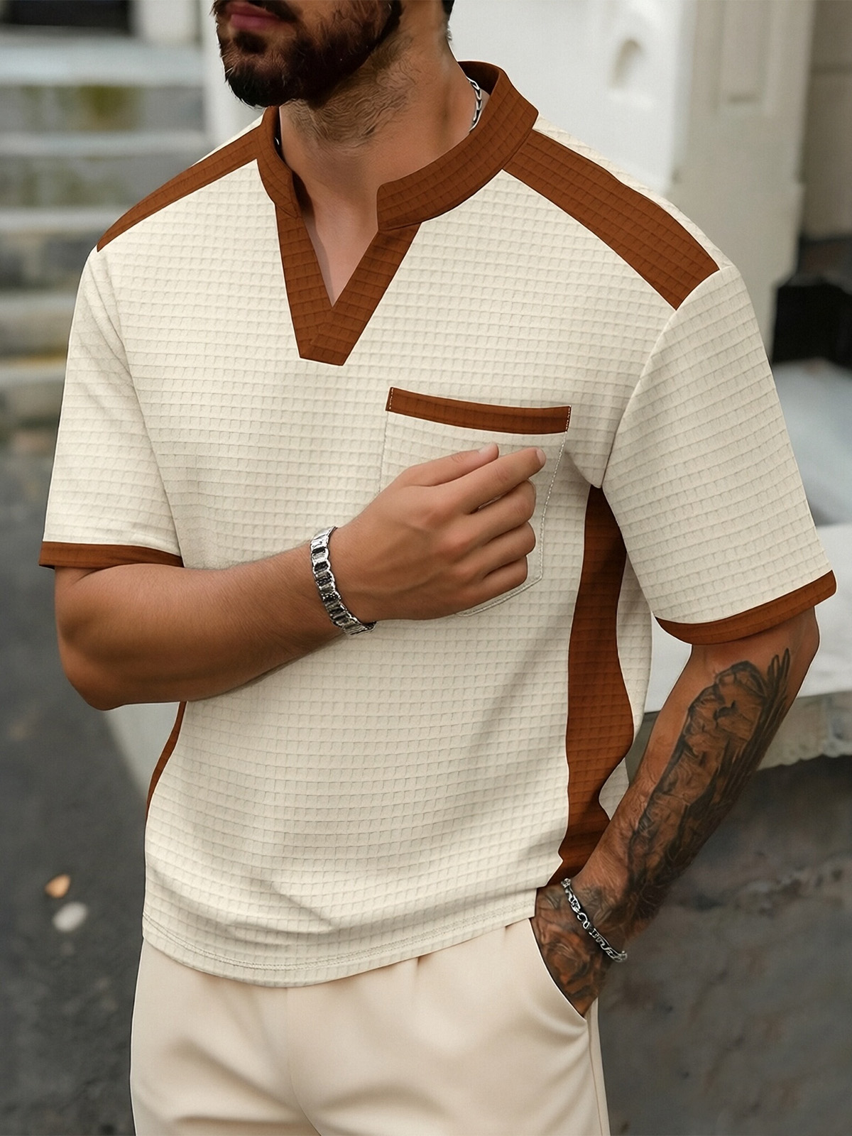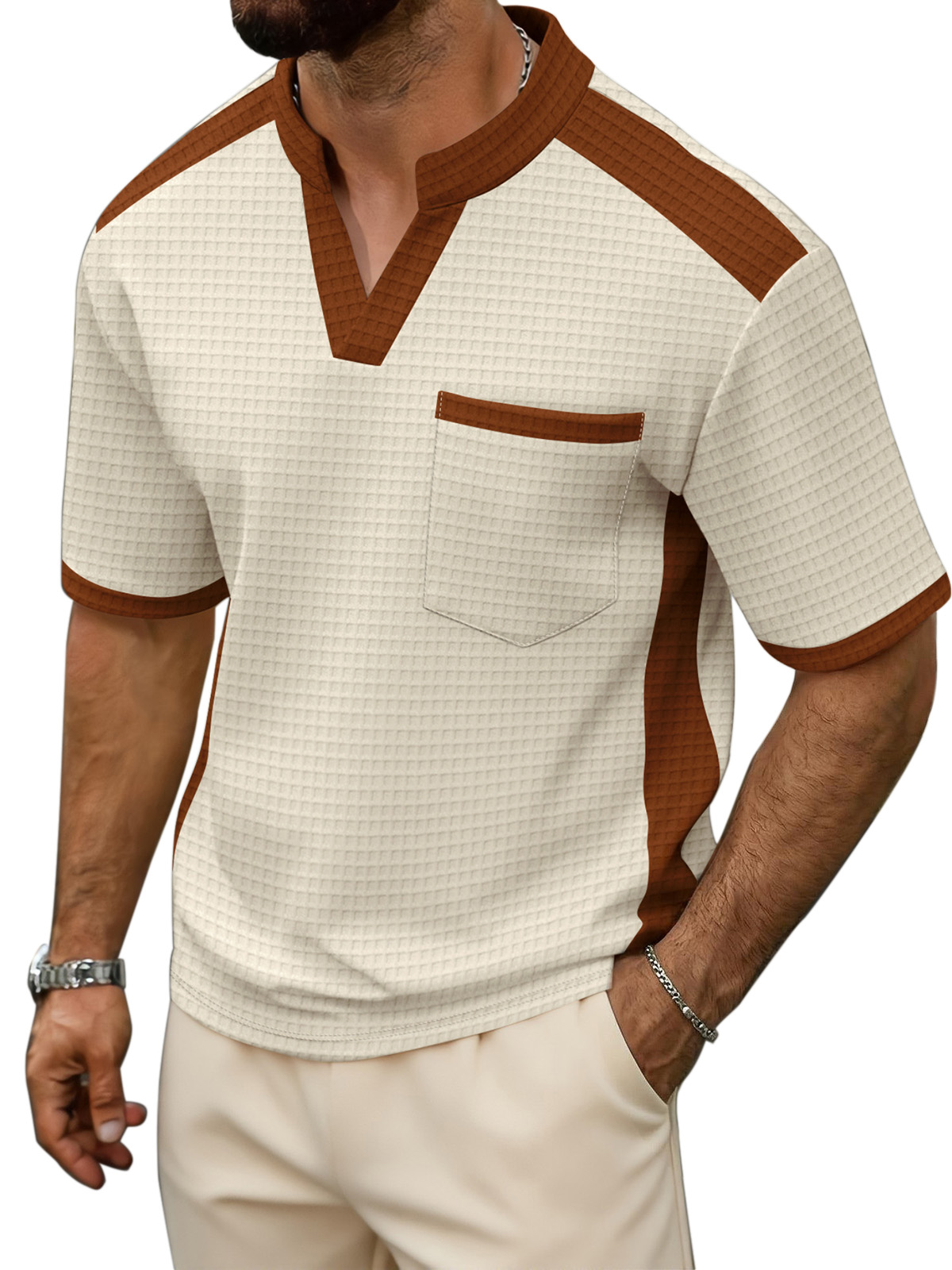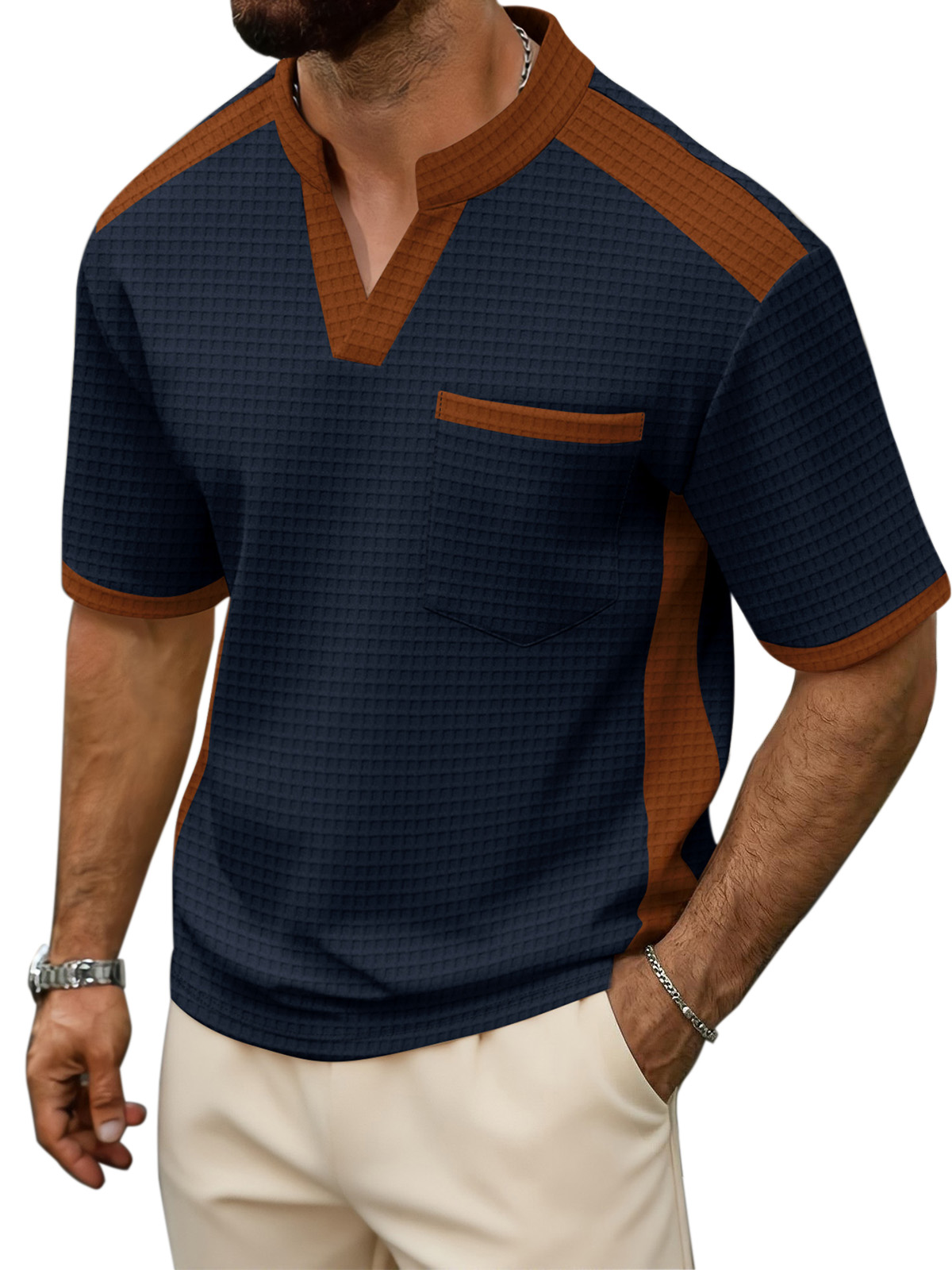 Men's Waffle Contrast V-neck Short Sleeve T-shirt