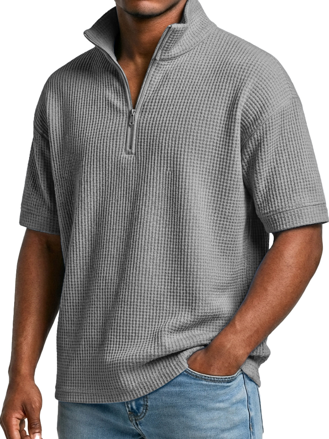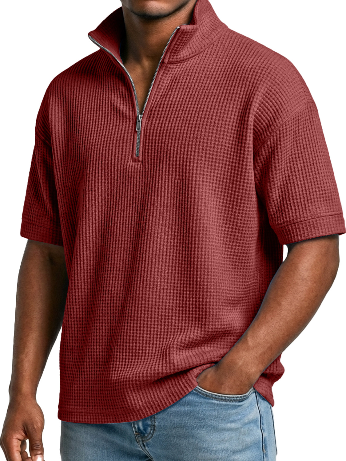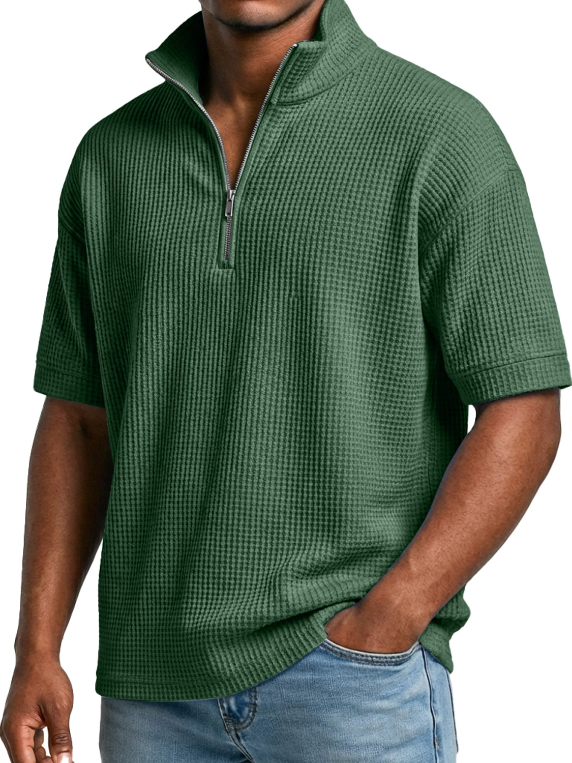 Men's Waffle-knit Simple Stand-collar Zip-up Casual Short-sleeved T-shir